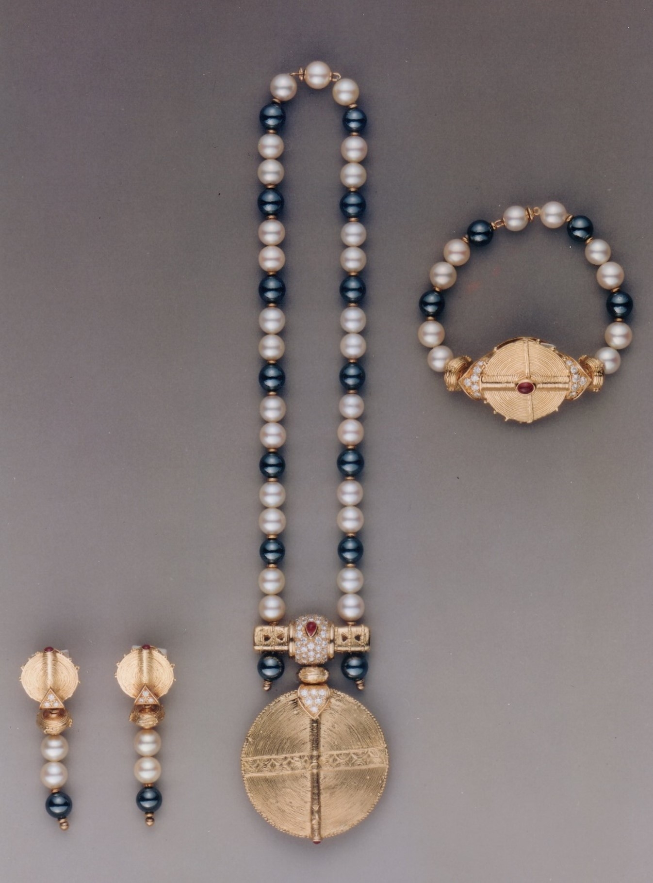 Rossy de Palma a été parée du collier et des boucles d’oreilles Exotic, en or jaune, perles, hématite, rubis et diamant de 1982, de la collection Privée Boucheron, illustrant la richesse historique et la diversité des créations de la maison.