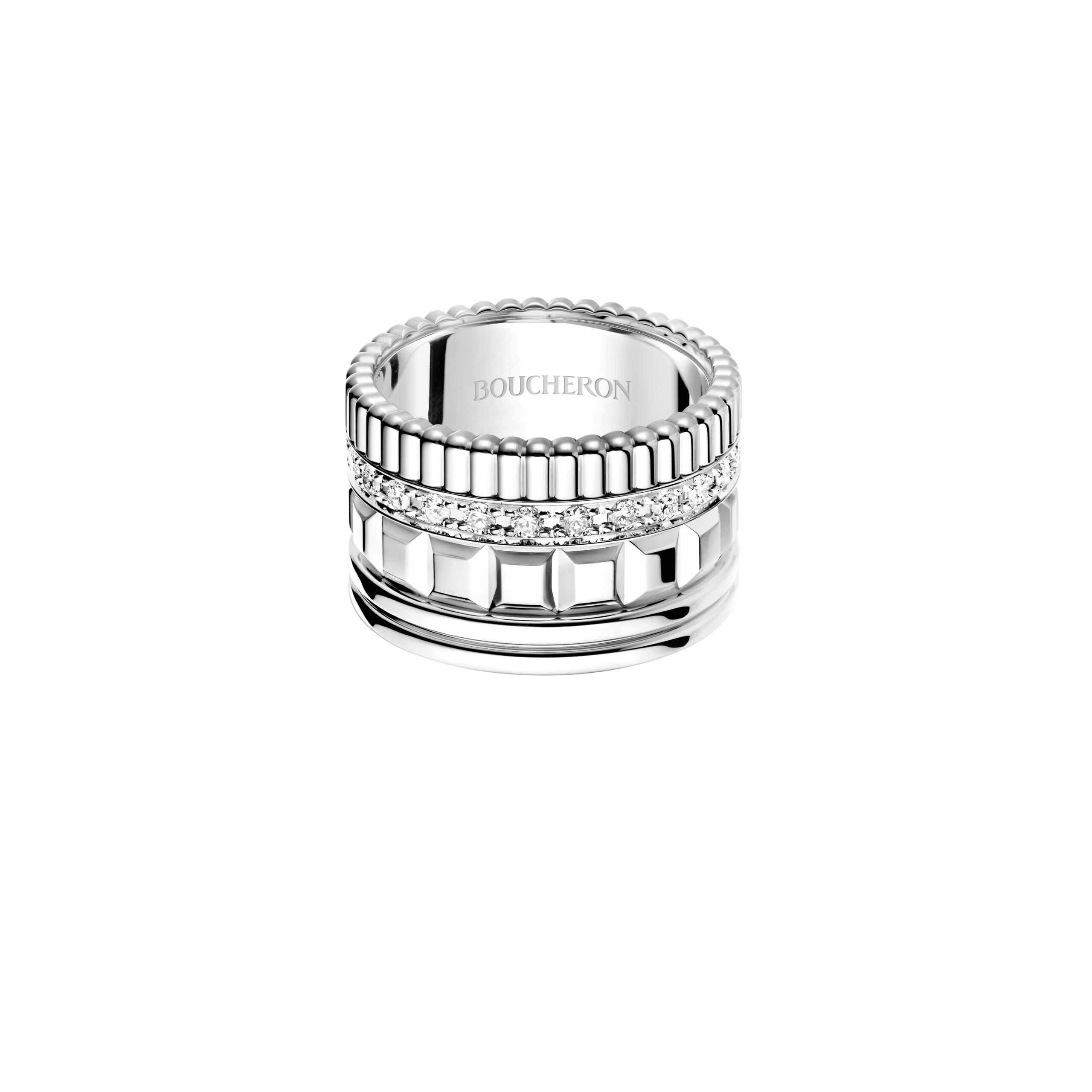 Antoine Reinartz a affiché la bague Quatre Classique modèle large, pavée de diamants, mêlant or blanc, or jaune et or rose, avec une touche moderne de PVD marron.
