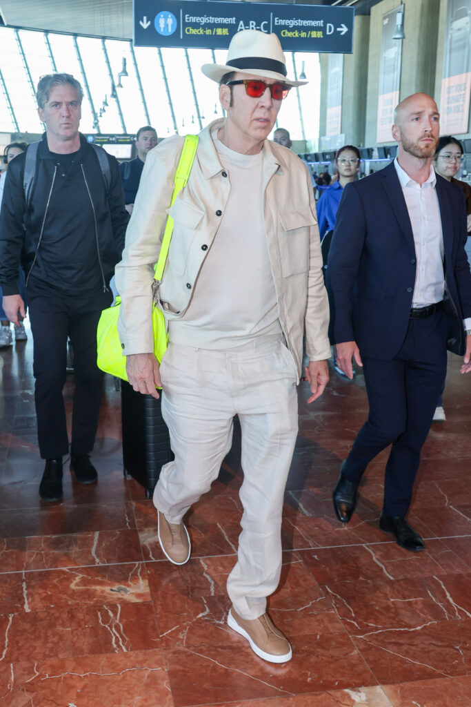 Le 18 mai 2024, après avoir assisté au prestigieux 77ème Festival de Cannes, l’acteur Nicolas Cage a été aperçu à l’aéroport de Nice, arborant une tenue élégante et décontractée signée Zegna. Connu pour son sens du style unique, Nicolas Cage a choisi une tenue qui allie confort et sophistication, parfaite pour un voyage après une semaine intense de festivités cinématographiques.