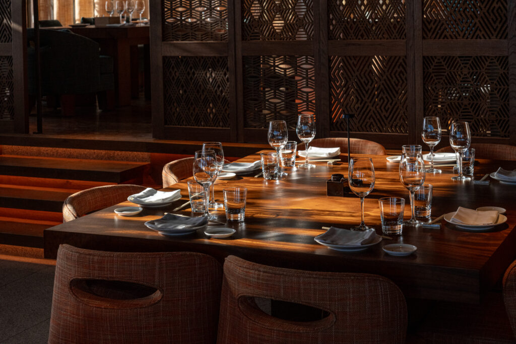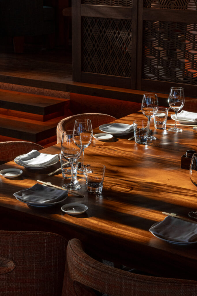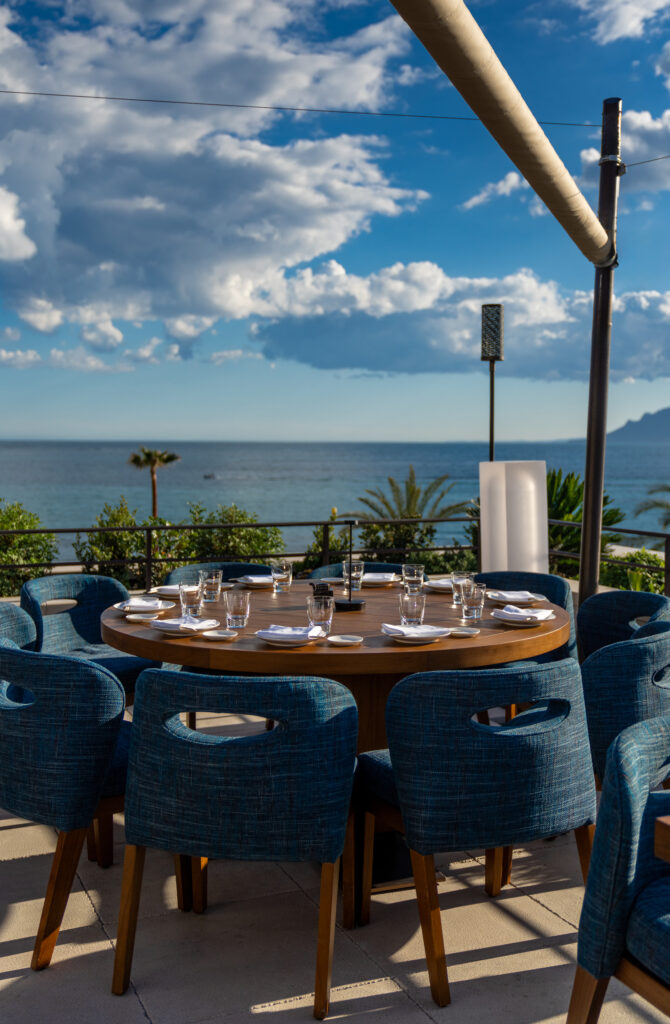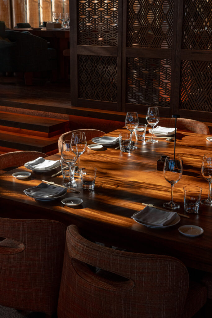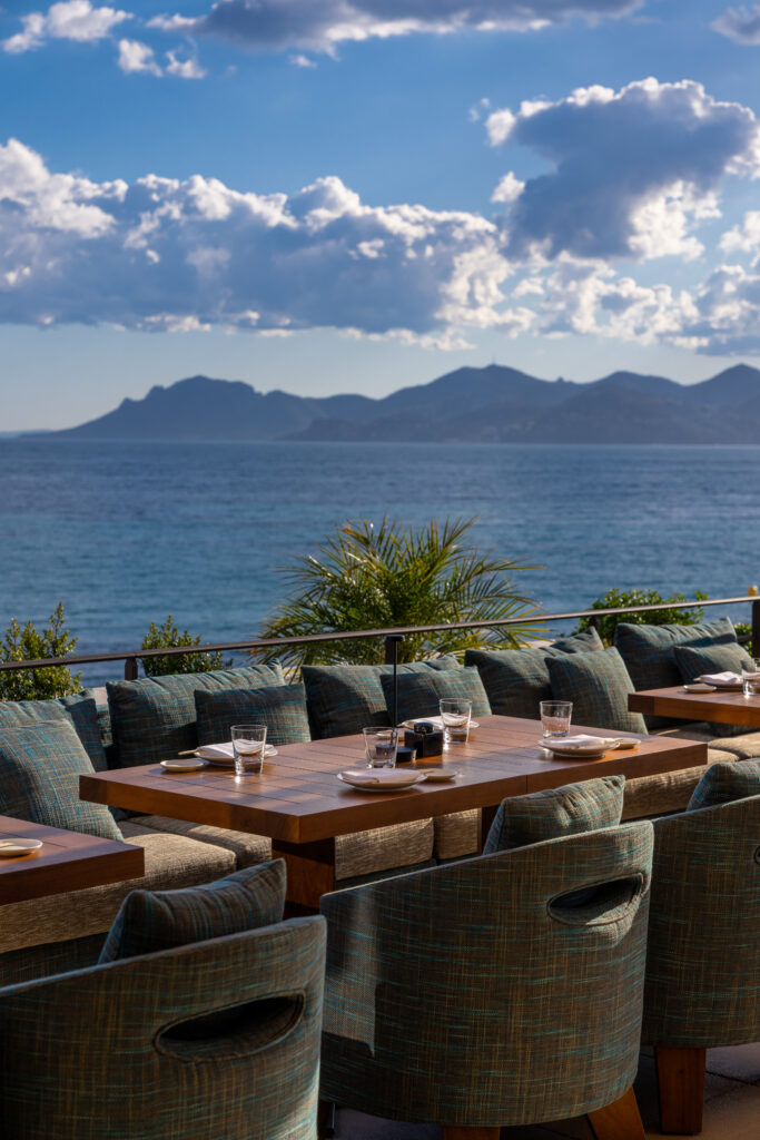 Le design de Zuma Cannes met en avant l’harmonie des éléments naturels, utilisant des tables de pierre et du bois pour créer un cadre classique, épuré et intemporel. La grande terrasse, aménagée selon la technique japonaise du “Shakkei” (ou “paysage emprunté”), offre une expérience immersive où les frontières entre l’intérieur et l’extérieur se confondent. L’entrée du restaurant, par un tunnel au plafond bas, permet aux invités de laisser derrière eux leur quotidien pour entrer dans un nouvel univers.