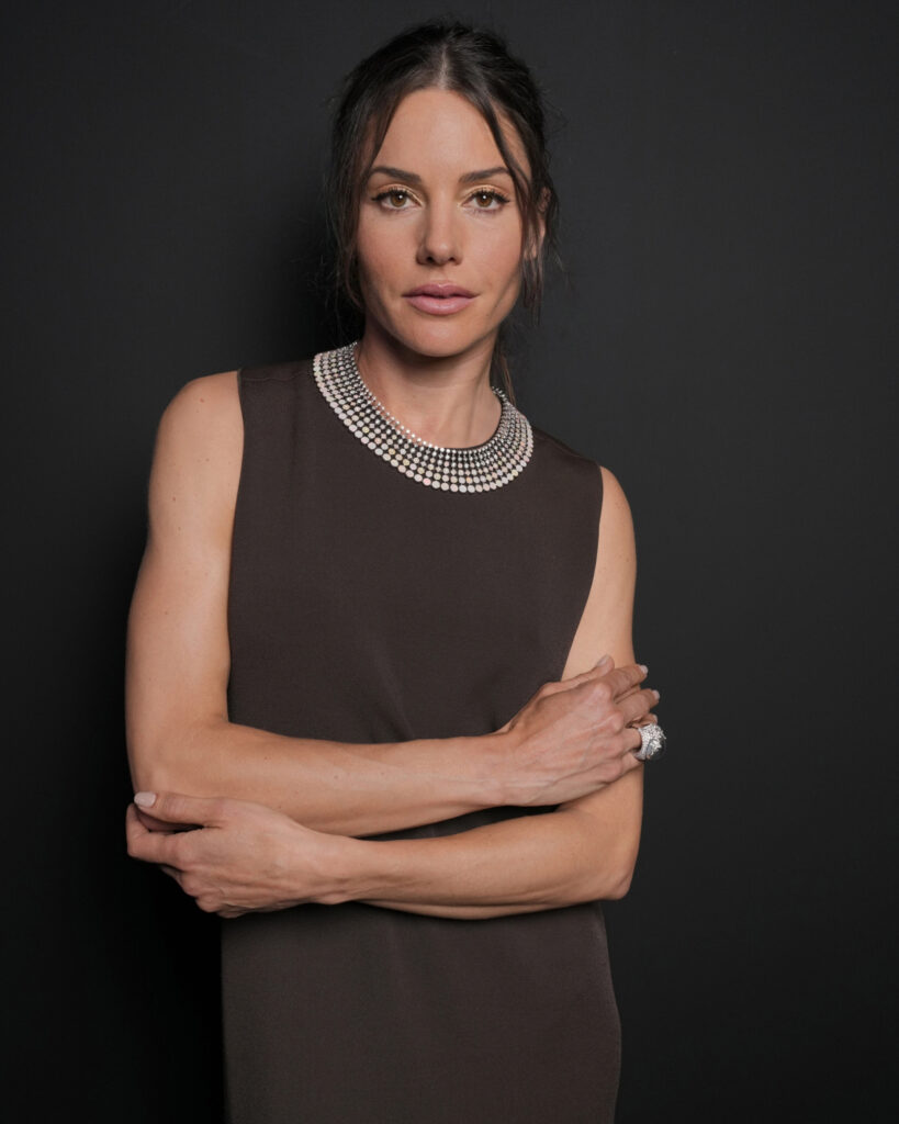 Natasha Andrews portait les boucles d’oreilles asymétriques Broderies de la collection Haute Joaillerie Histoire de Style, The Power of Couture, pavées de diamants sur or blanc, le collier Ondes de la collection Haute Joaillerie Carte Blanche, Holographique, serti d’opales et pavé de diamants sur or blanc, ainsi que la bague Lierre de Paris, sertie de cristal de roche et pavée de diamants sur or blanc.