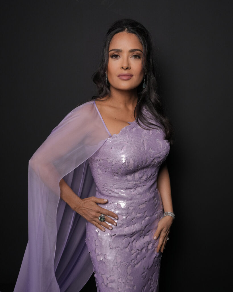 Salma Hayek-Pinault, resplendissante, portait les pendants d’oreilles Serpent Bohème, sertis d’aquaprase et pavés de diamants sur or blanc. Elle arborait également le bracelet Art Déco en diamants et platine datant de 1930, issu de la collection Privée Boucheron, ainsi que la bague Perspectives de la collection Haute Joaillerie Signature, sertie d’un béryl vert taille coussin de 11,50 carats, pavée de diamants sur or blanc avec laque noire.
