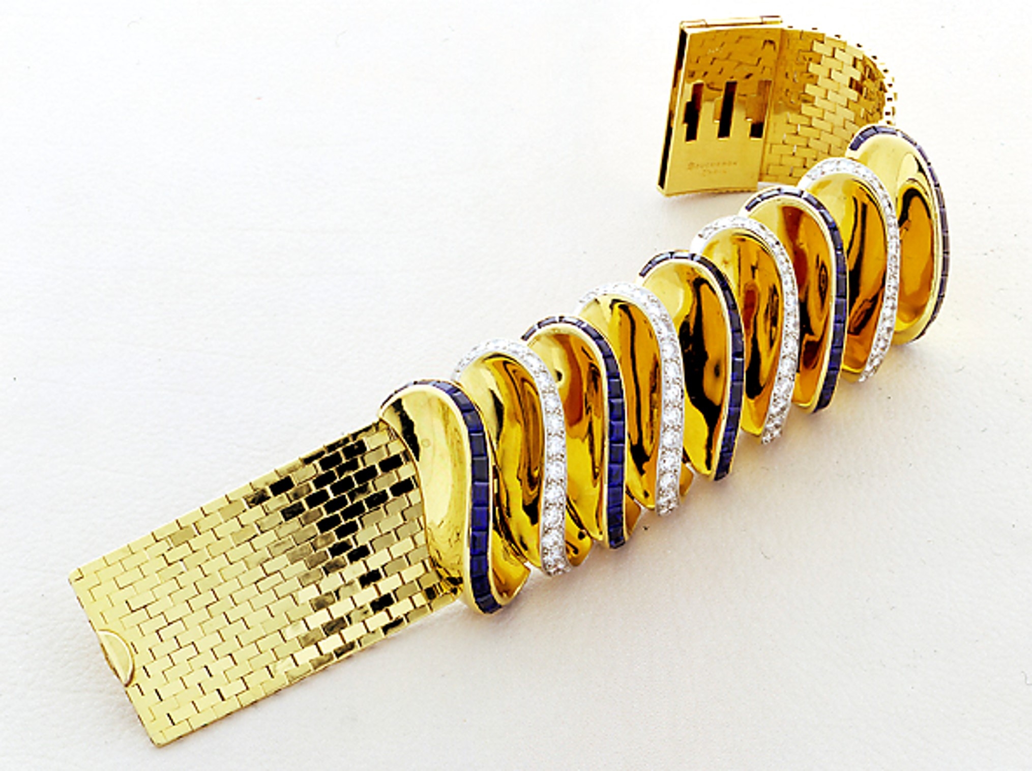 L’égérie de la Maison, Anja Rubik, portait le bracelet Flexible en or jaune, diamants et saphirs, datant de 1947. Cette pièce intemporelle ajoutait une touche de luxe classique à son style avant-gardiste.
