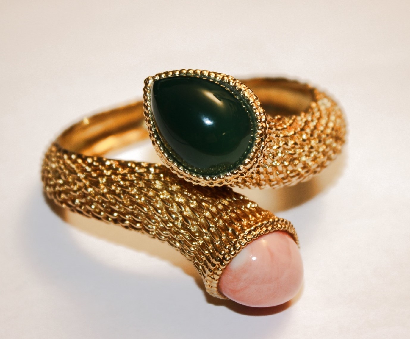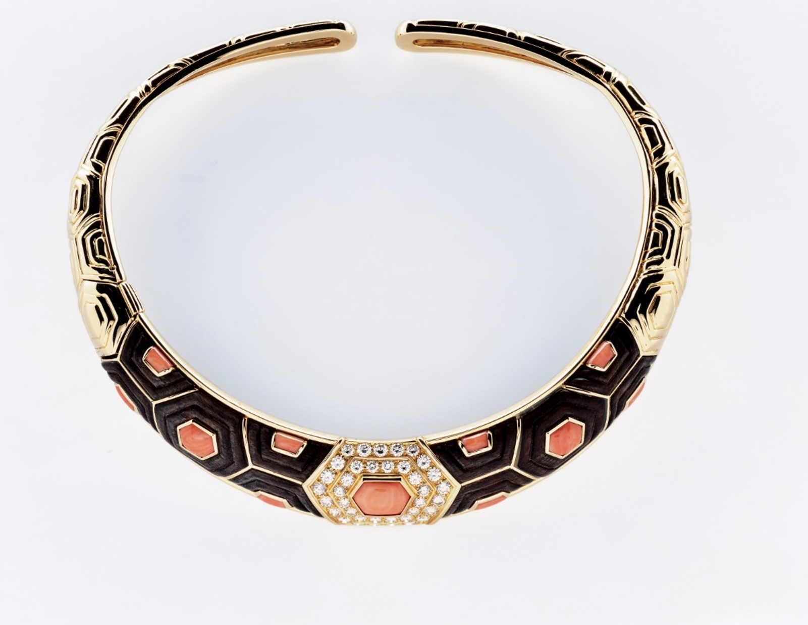 L’actrice Salma Hayek-Pinault a fait sensation avec deux pièces majeures de la collection Privée Boucheron : le collier Serpent long en corail, onyx et or jaune datant de 1974, et le collier Tortue en or jaune, corail, bois et diamants de 1987. Ces bijoux, rares et précieux, ajoutaient une touche de mystère et de sophistication à son look.