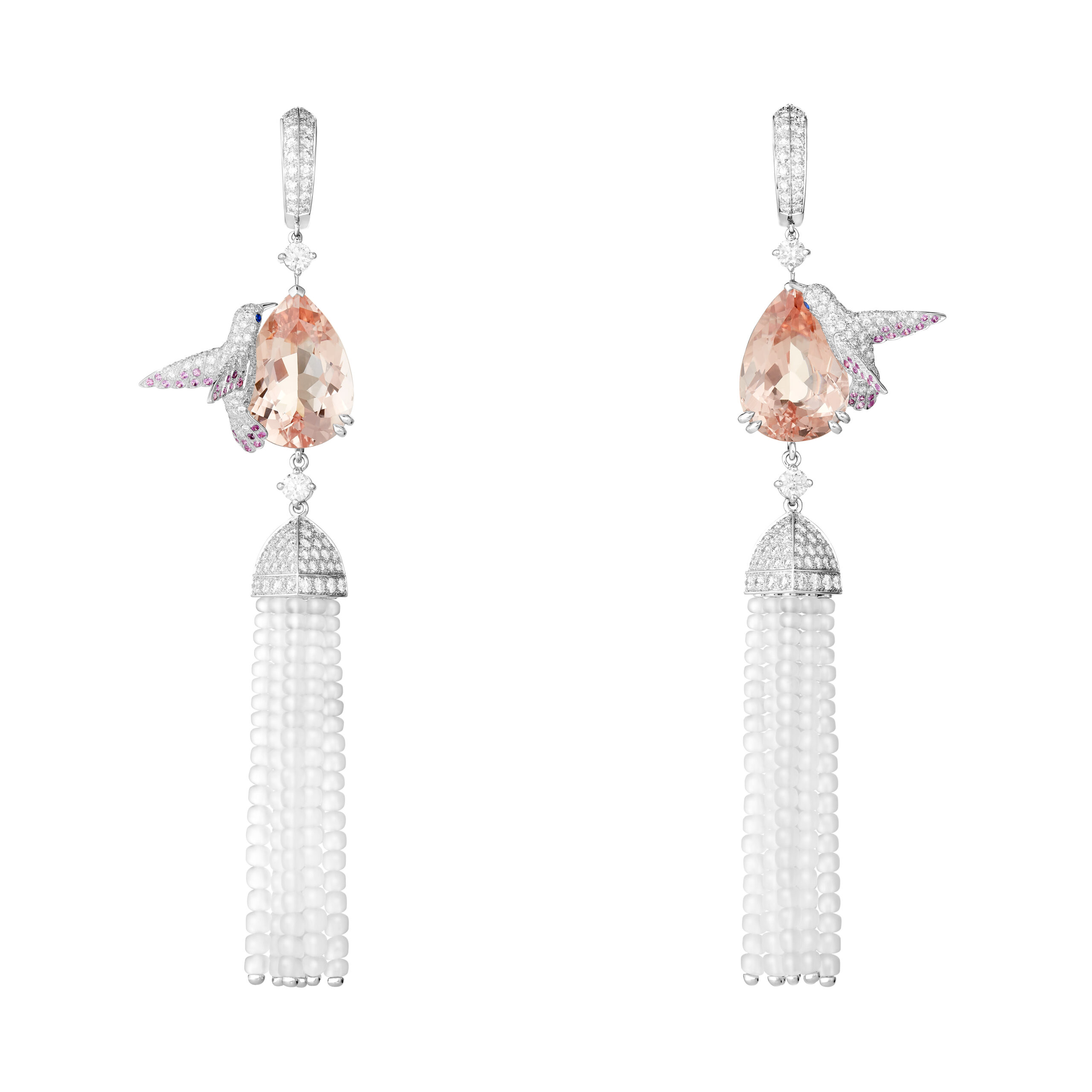Liya Tong a opté pour la bague et les boucles d’oreilles Hopi en or rose, diamants et saphir rose, ainsi que le bracelet Plume de Paon en or blanc et diamants, créant un look à la fois délicat et luxueux.