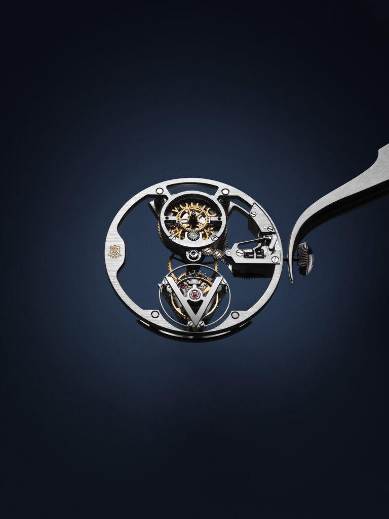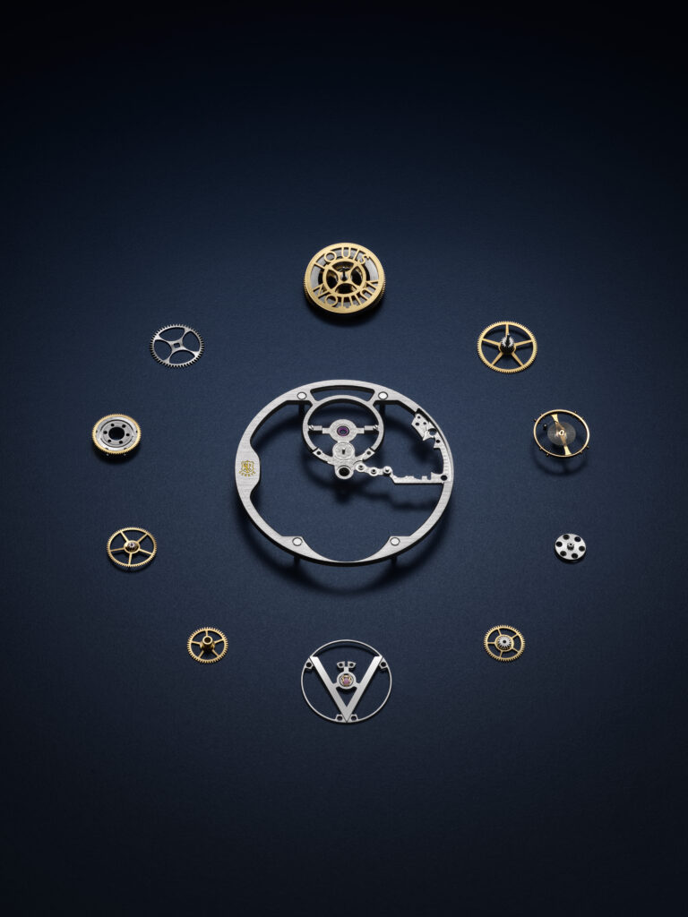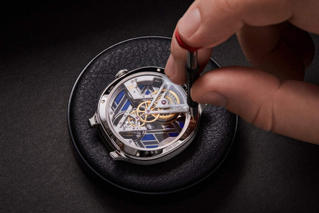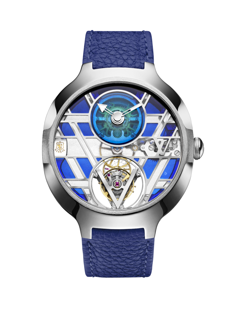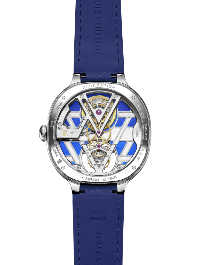Au cœur de cette montre réside le calibre LV104, un mouvement à tourbillon volant squelette développé et assemblé intégralement par La Fabrique du Temps Louis Vuitton. Ce mouvement, qui combine la tradition et l’innovation, est mis en valeur par un design avant-gardiste qui laisse transparaître chaque détail grâce à la transparence du cadran plique-à-jour. La certification du Poinçon de Genève, visible à travers le cadran, atteste de la qualité supérieure et des finitions exceptionnelles de cette montre, marquant ainsi un nouveau chapitre dans l’histoire de la haute horlogerie chez Louis Vuitton.