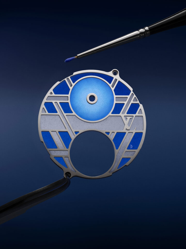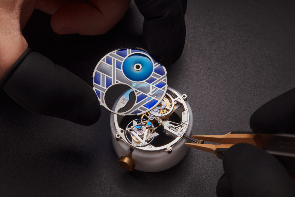 La méthode occidentale ancestrale du plique-à-jour percé a été choisie pour sa complexité et sa beauté, exigeant des artisans une précision et une délicatesse extrêmes pour déposer l’émail dans des alvéoles sans fond, créant ainsi un jeu de transparence inédit. Chaque cadran, nécessitant jusqu’à 100 heures de travail et six passages au four, devient un témoignage du dévouement de Louis Vuitton à l’excellence artisanale.