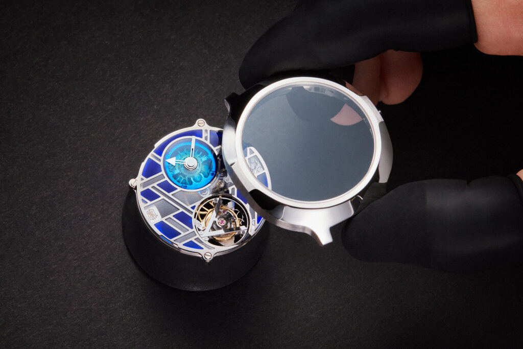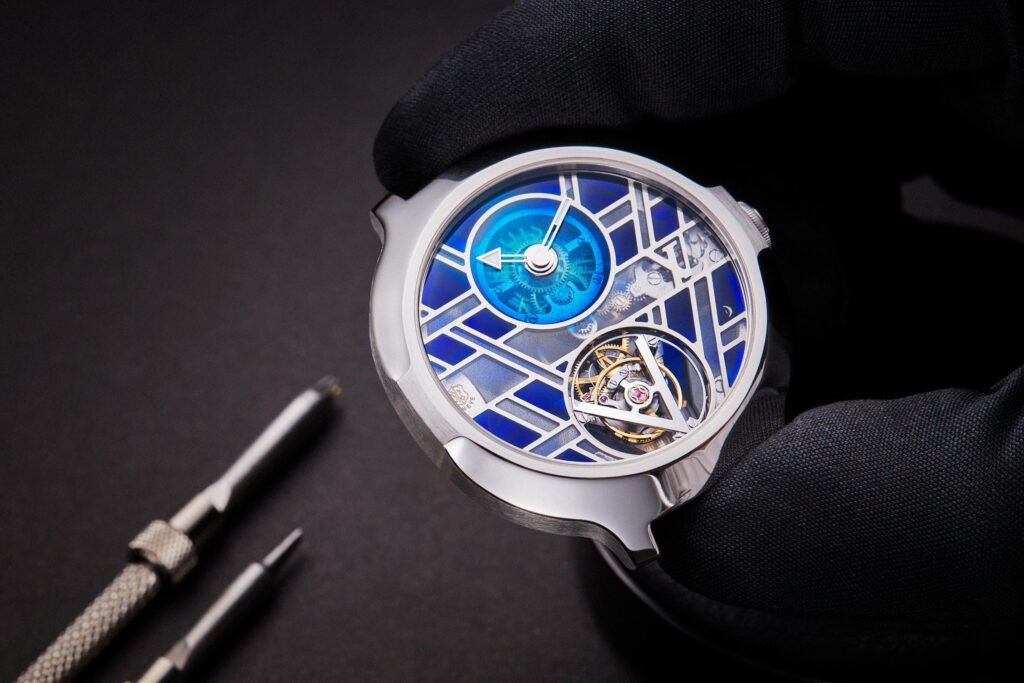Inspirée des techniques d’émaillage qui datent du XIVème siècle, la montre Voyager réinvente l’émail plique-à-jour, traditionnellement utilisé dans la confection de vitraux, pour créer un cadran d’une transparence et d’une luminosité exceptionnelles. La collaboration avec des maîtres émailleurs de renom a permis de donner vie à cette technique complexe, offrant une palette de bleus profonds qui transforme le cadran en une véritable œuvre d’art contemporain.