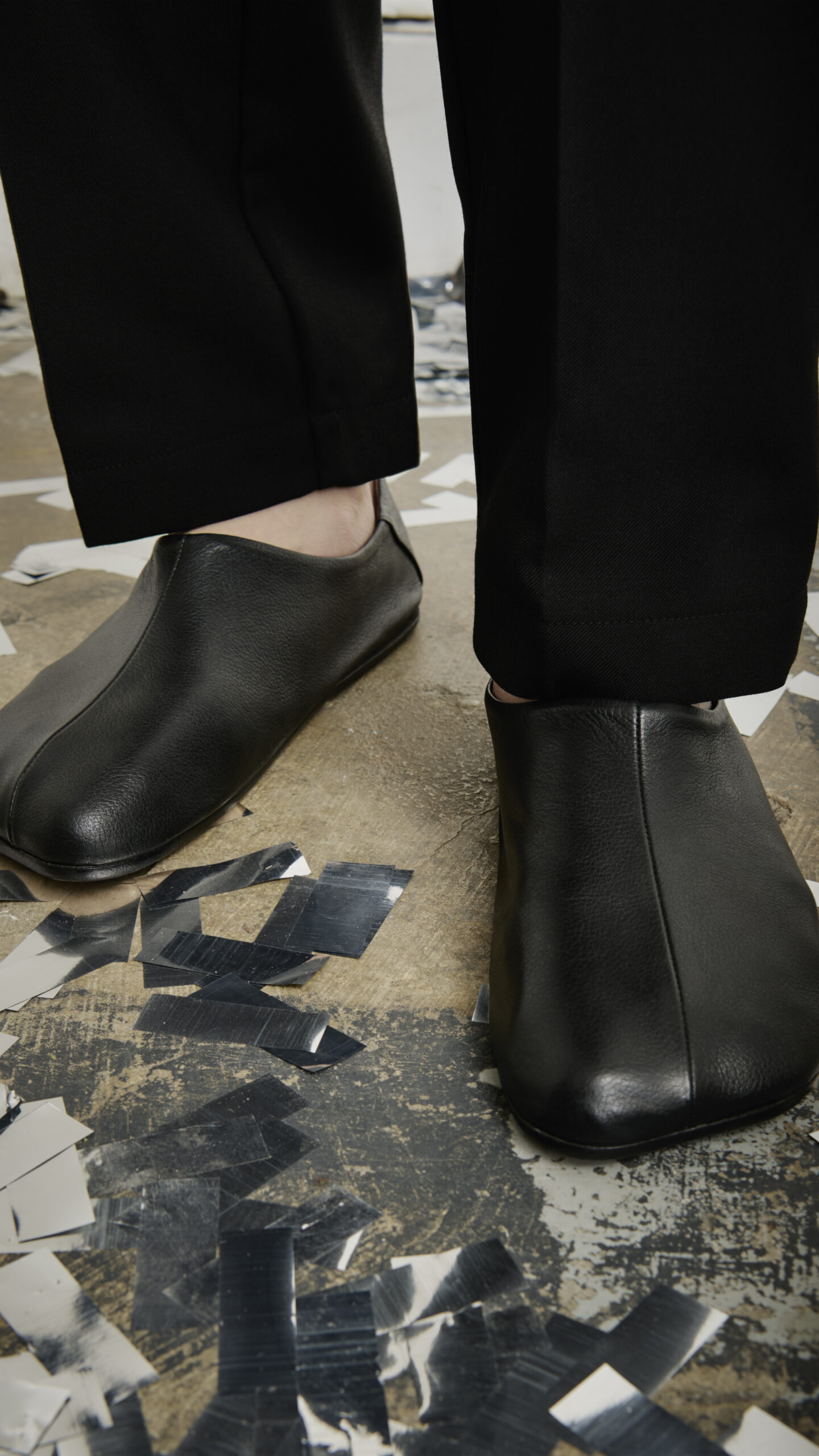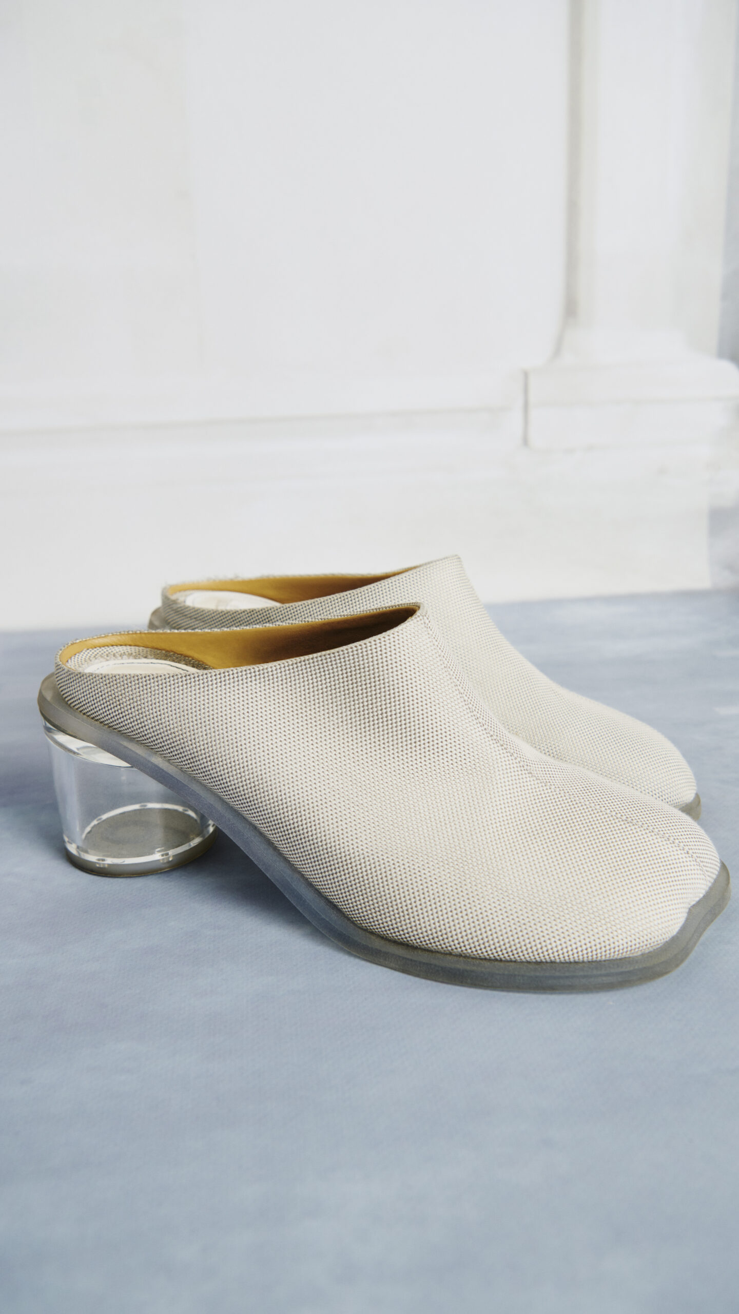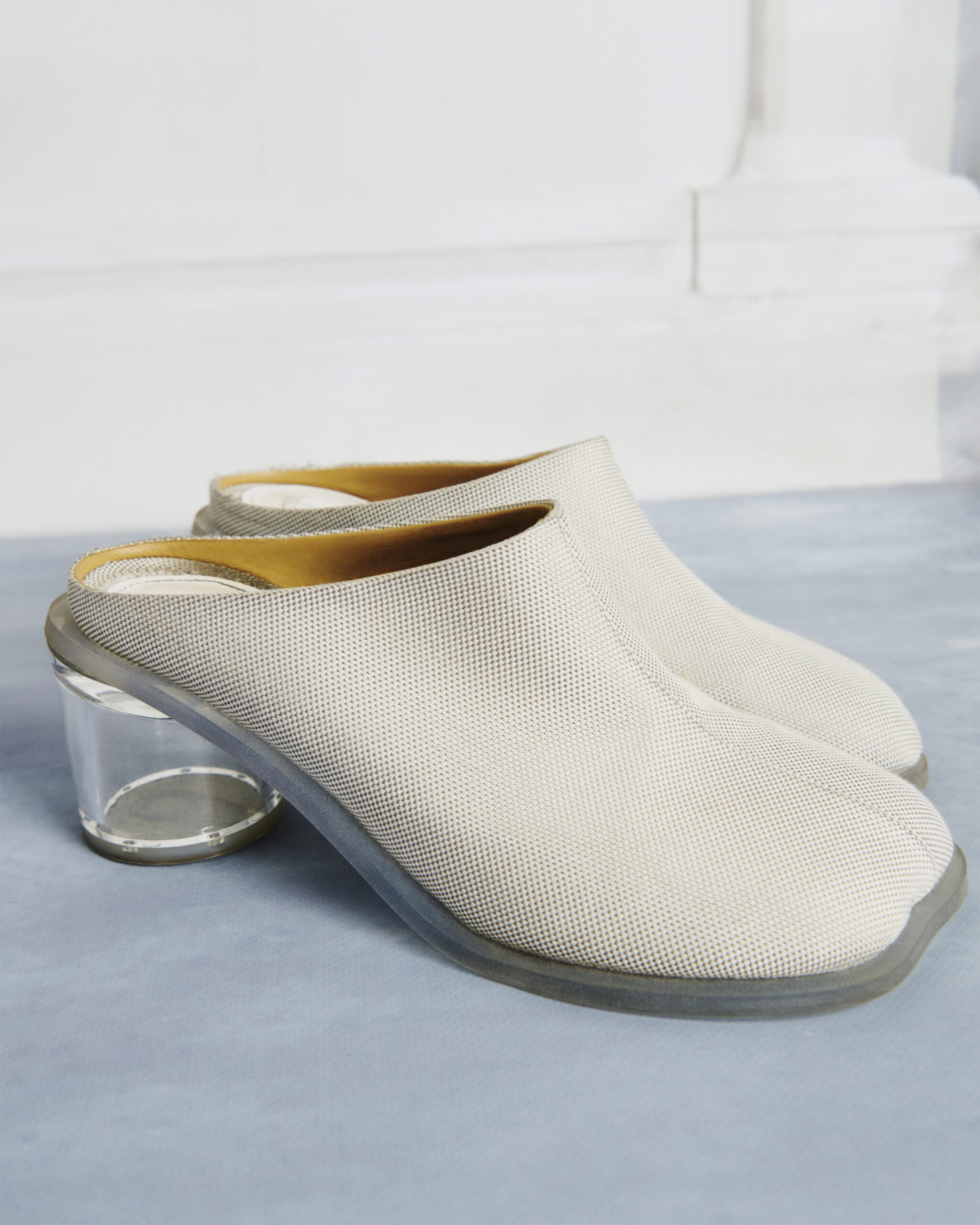 Faisant écho aux codes emblématiques de la Maison, la forme de la semelle joue un trompe l’œil habile, imitant la silhouette naturelle du pied. Cet effet est amplifié par une tige déconstruite, offrant une esthétique à la fois avant-gardiste et intrinsèquement Margiela. Initialement apparue sous la forme d’une bottine à talon en forme de coupe, cette chaussure a évolué vers un talon cylindrique orné du logo à 6 branches de MM6, laissant une empreinte marquante à chaque pas.
