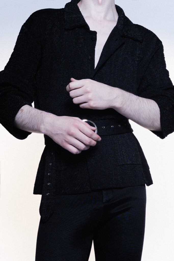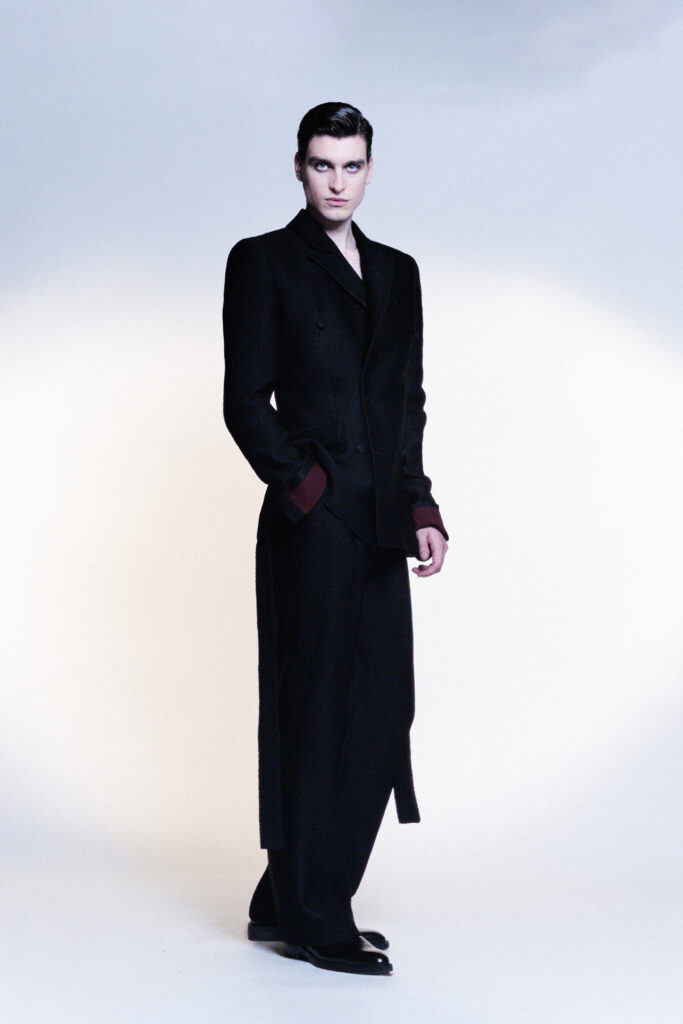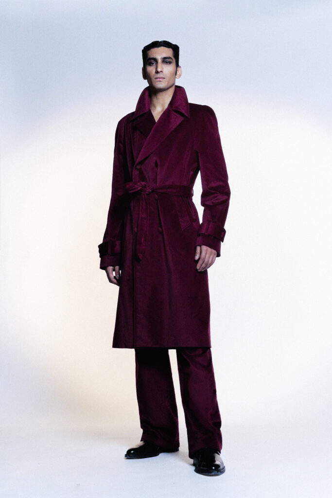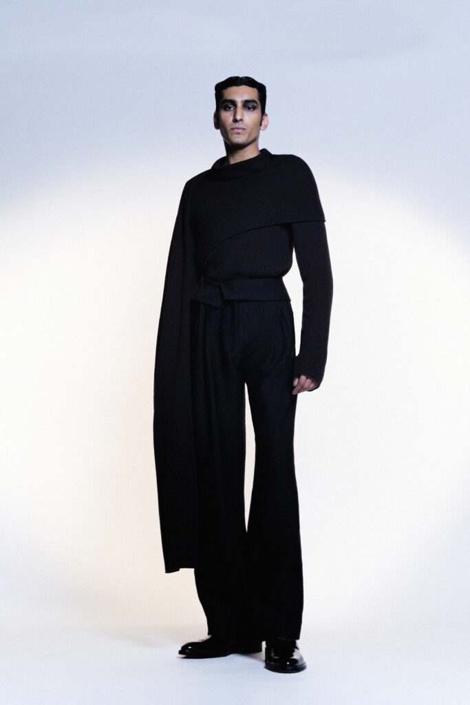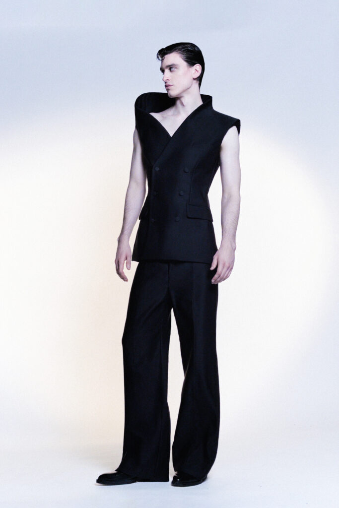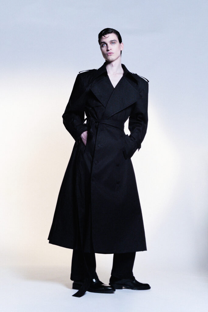 Tailoring : Les silhouettes signatures d’Obegero, telles que le trench-coat, le costume croisé, la chemise et le pantalon taille haute, sont réinventées avec des jerseys techniques et des rideaux de théâtre en velours recyclé. Chaque pièce est retravaillée pour une allure plus élégante et moderne.