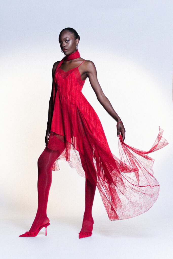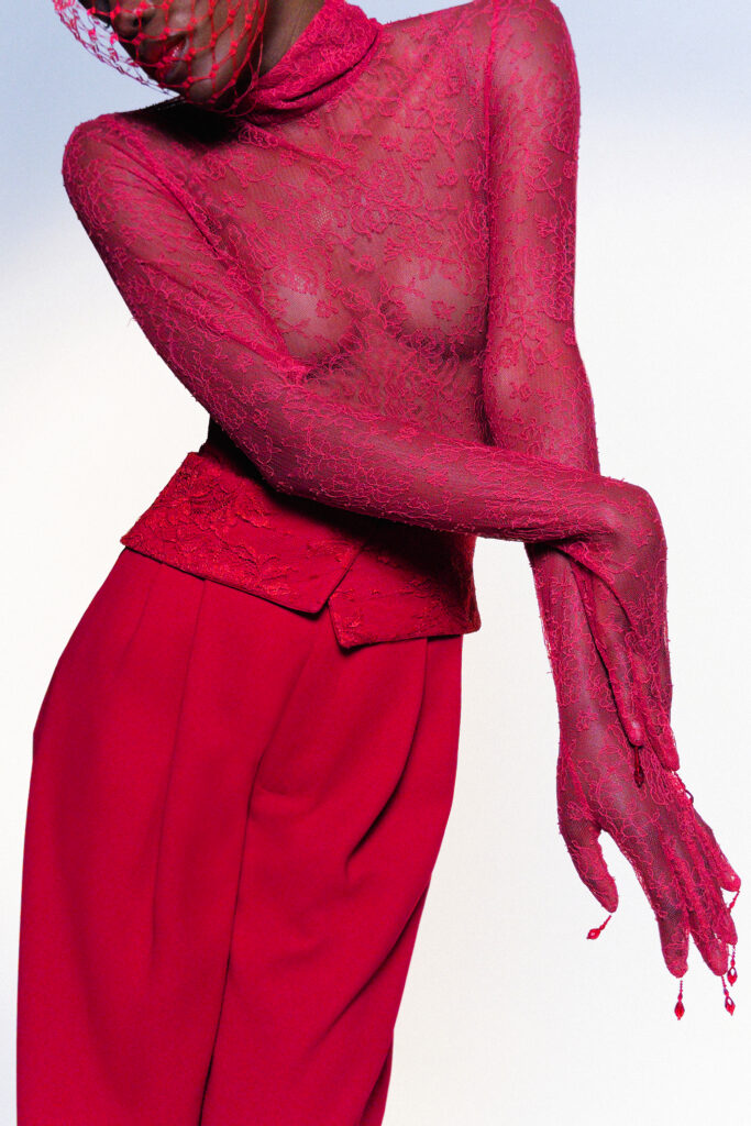 Dentelle : La dentelle, fournie par le fabricant français centenaire Sophie Hallette, joue un rôle central. Elle incarne une sensualité moderne dans des pièces comme le top Lutens, la robe Lucia et les pantalons Afanador. La dentelle est également utilisée dans des créations innovantes comme le top Sophie, traité au silicone pour créer des motifs sculpturaux.