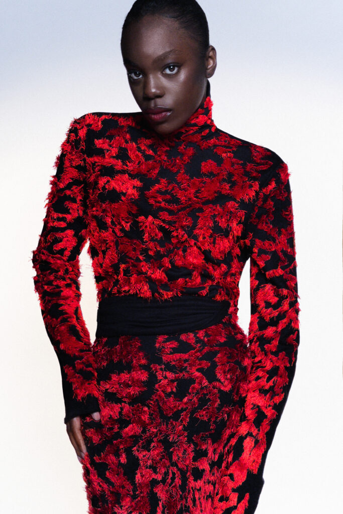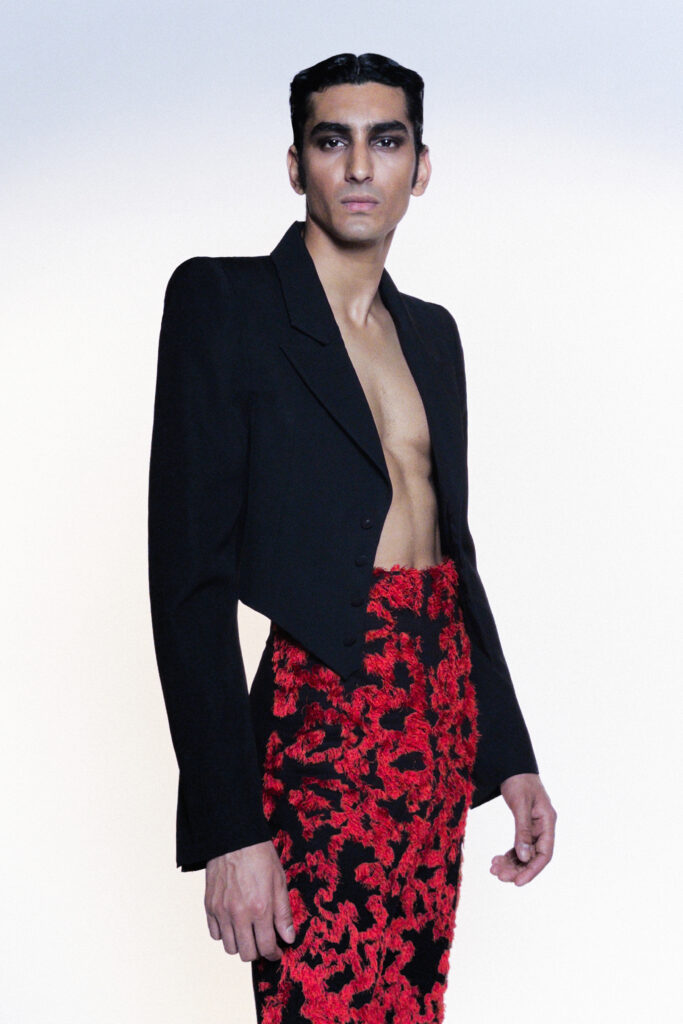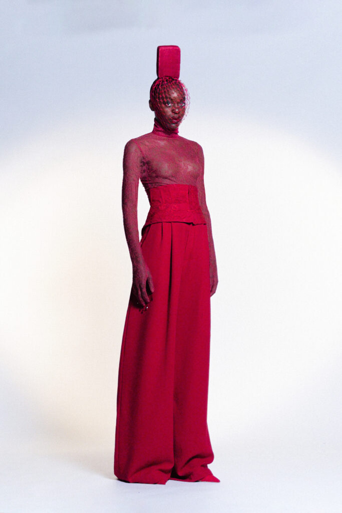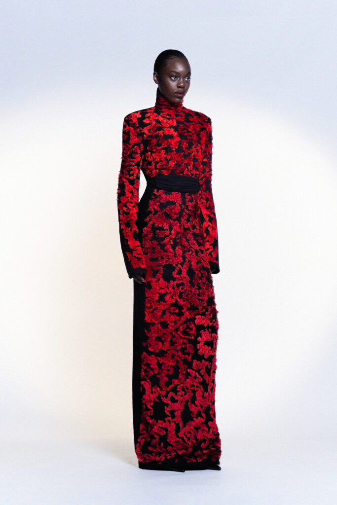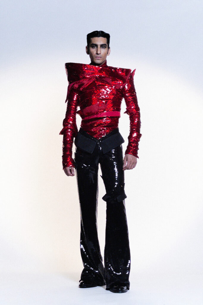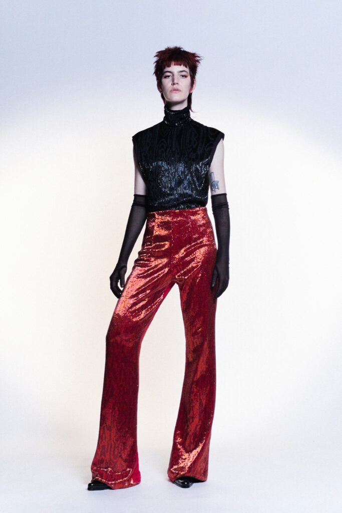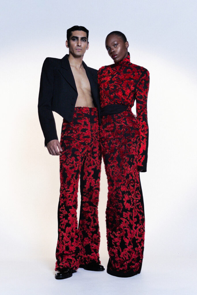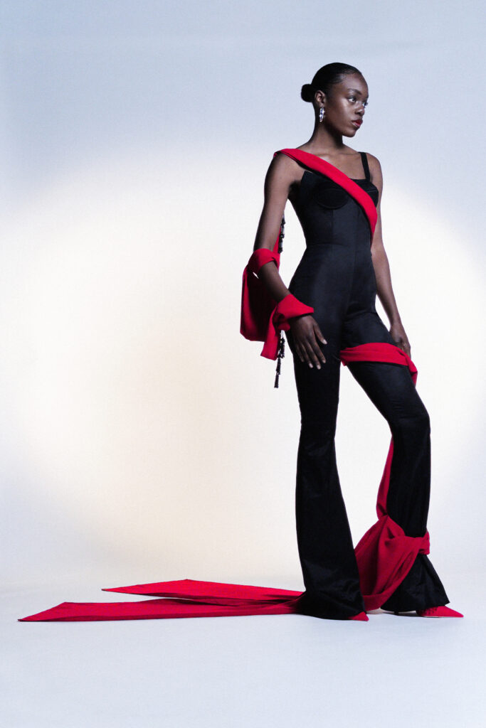 Broderie : Collaborant avec un atelier traditionnel en Inde, Obegero a créé des broderies moirées et en flammes. Les pantalons Gades rouges et le col roulé noir sans manches sont ornés de perles tubulaires, nécessitant des centaines d’heures de travail manuel.