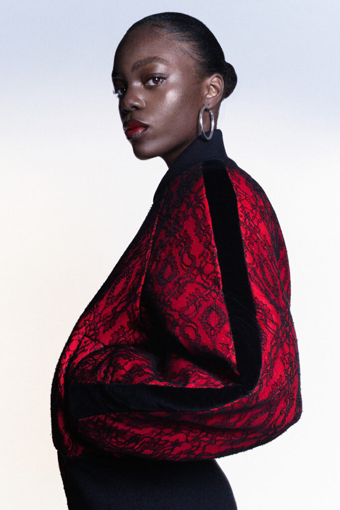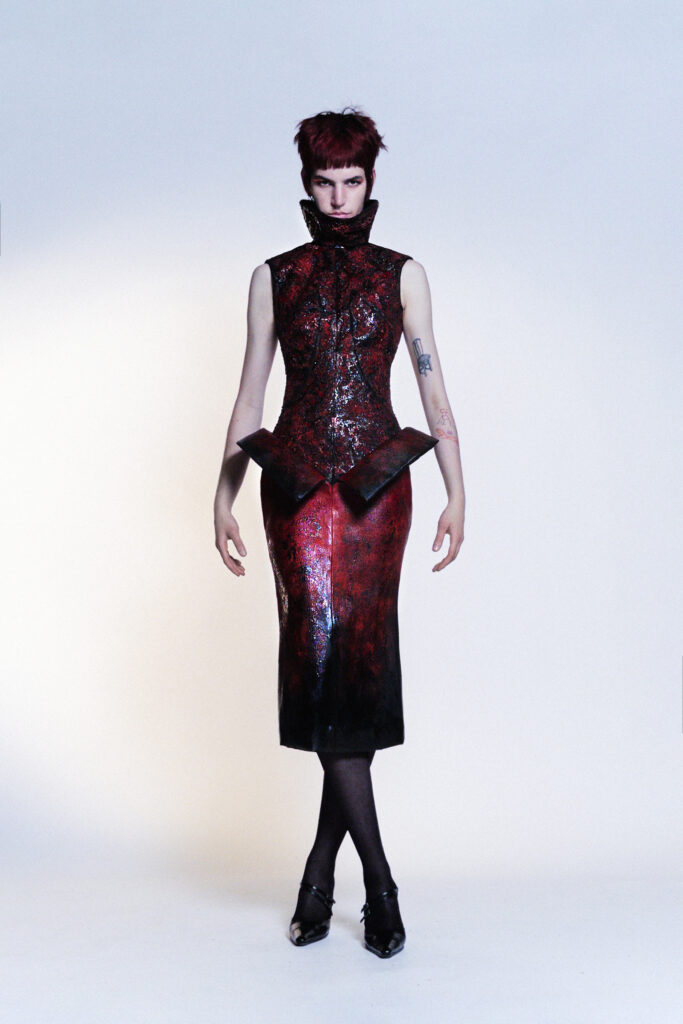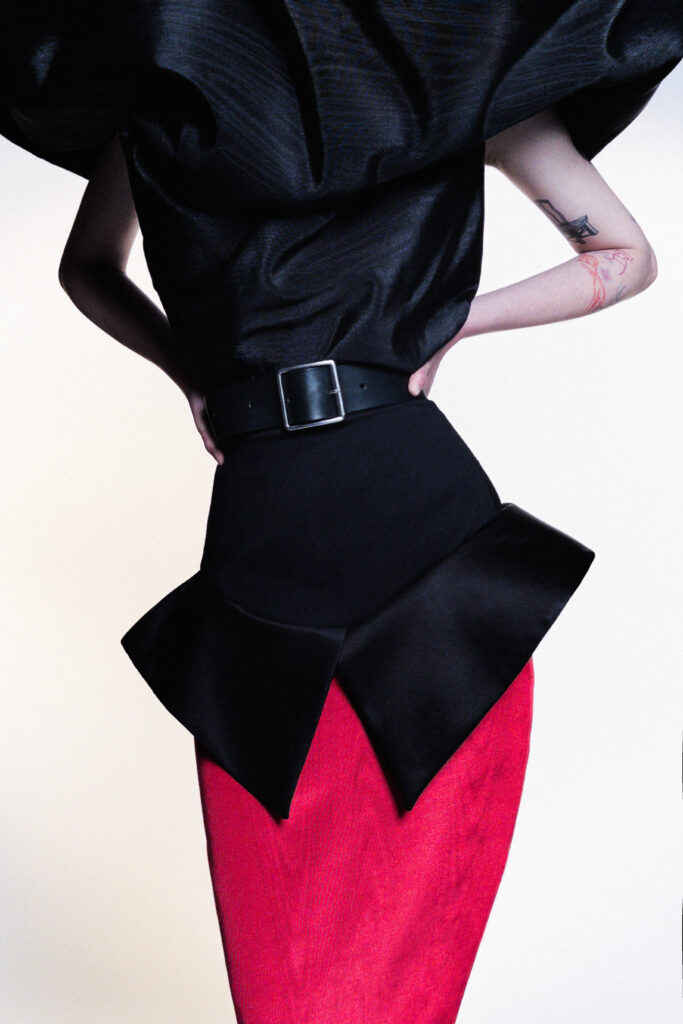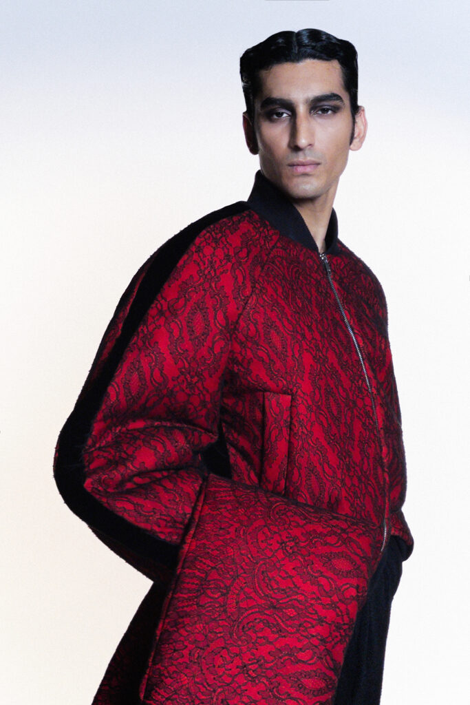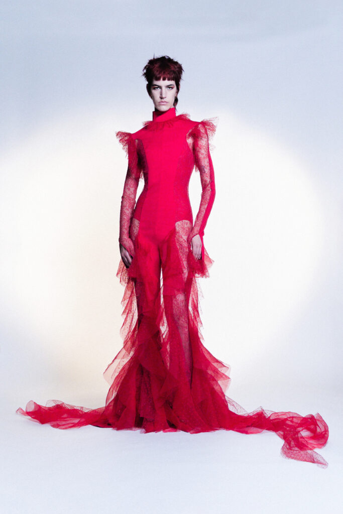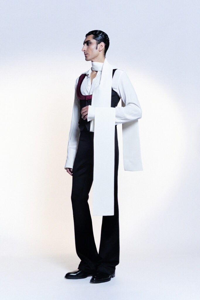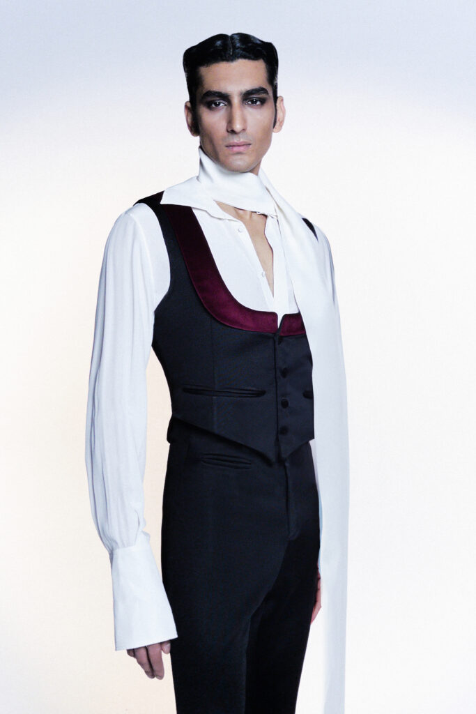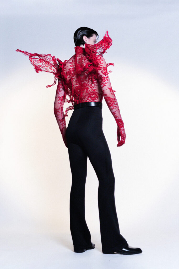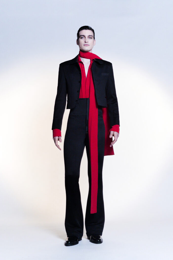 Broderie : Collaborant avec un atelier traditionnel en Inde, Obegero a créé des broderies moirées et en flammes. Les pantalons Gades rouges et le col roulé noir sans manches sont ornés de perles tubulaires, nécessitant des centaines d’heures de travail manuel.