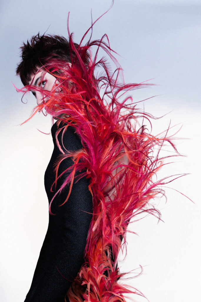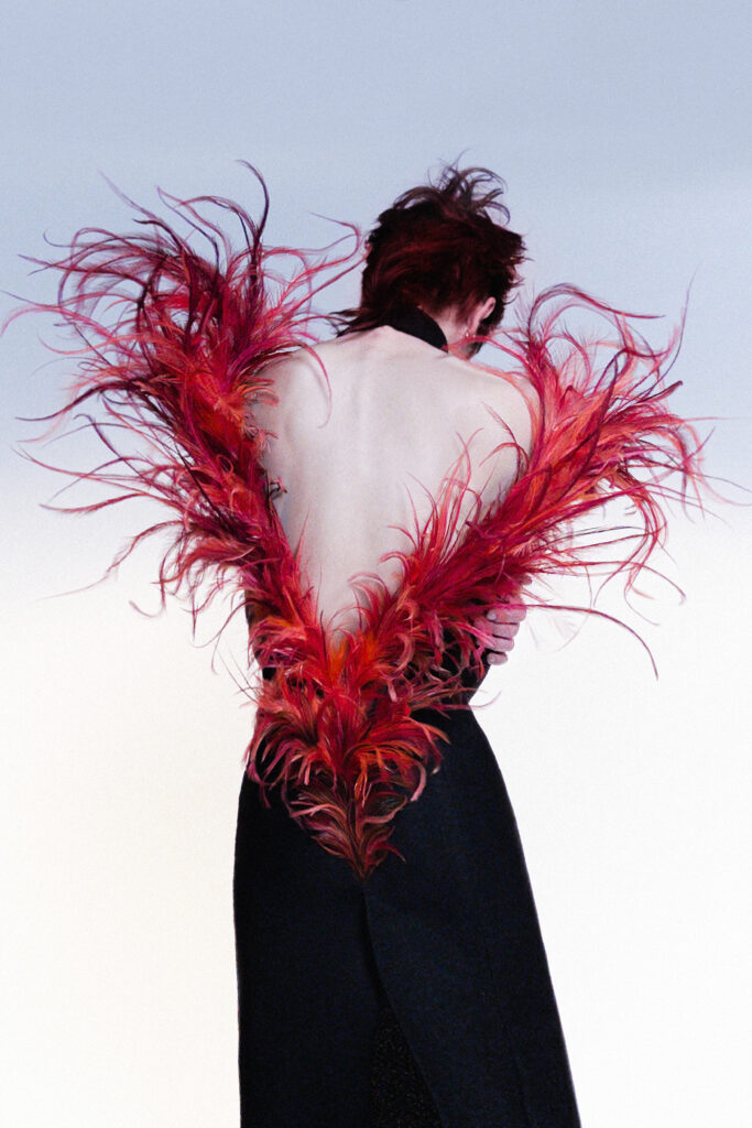 Plumasserie : En collaboration avec Maison Février, Obegero a conçu la robe Zendaya, un chef-d’œuvre dévoilant un dos nu dramatique orné de flammes en plumes.