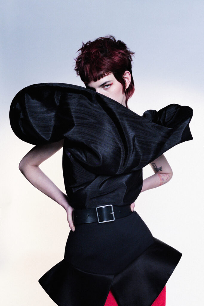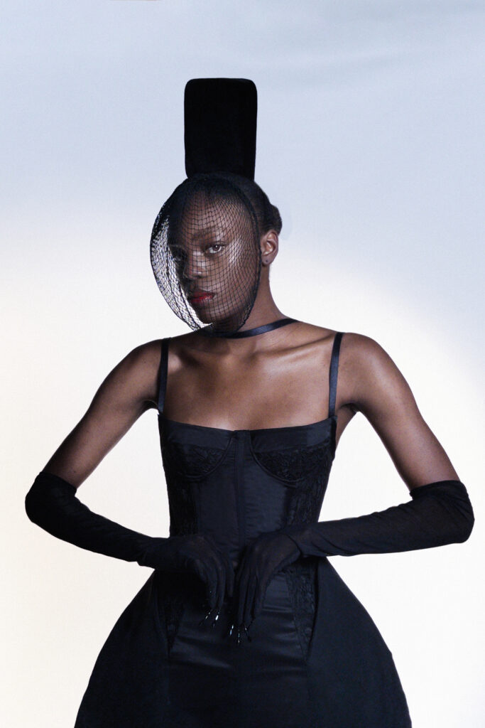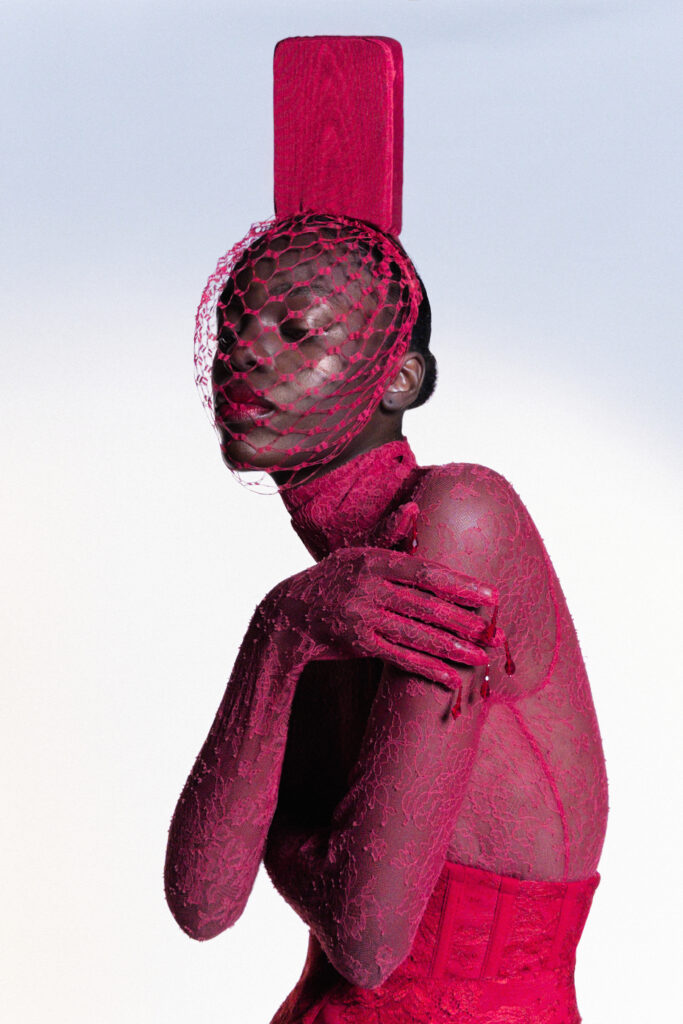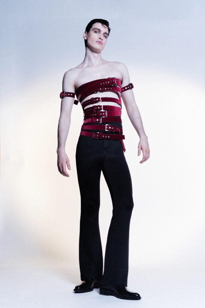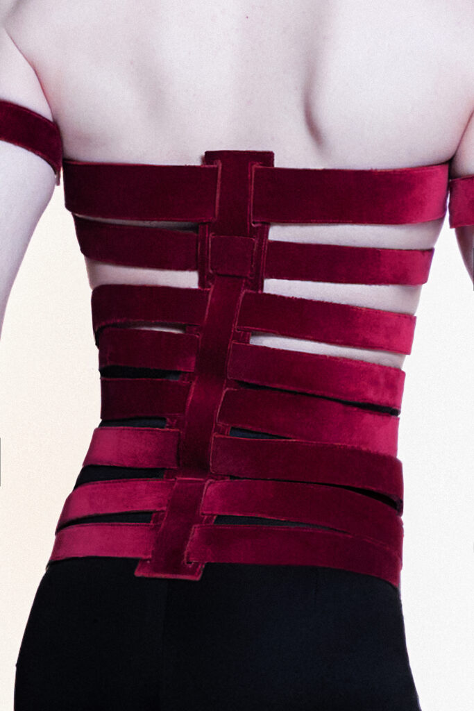 Corset : Le corset Thorax en bordeaux, créé avec l’artisan parisien Yamil Farah, joue sur l’idée de l’amour contraignant et de l’excitation liée au fétichisme.