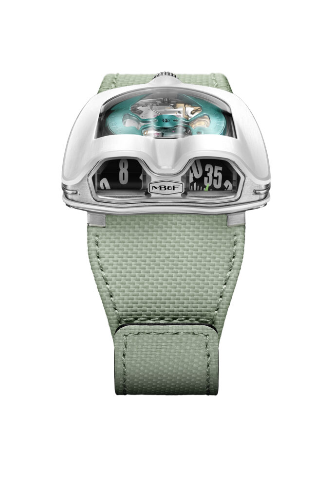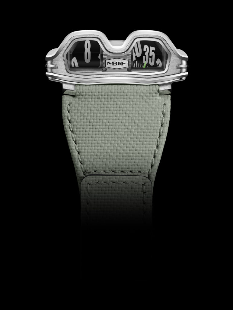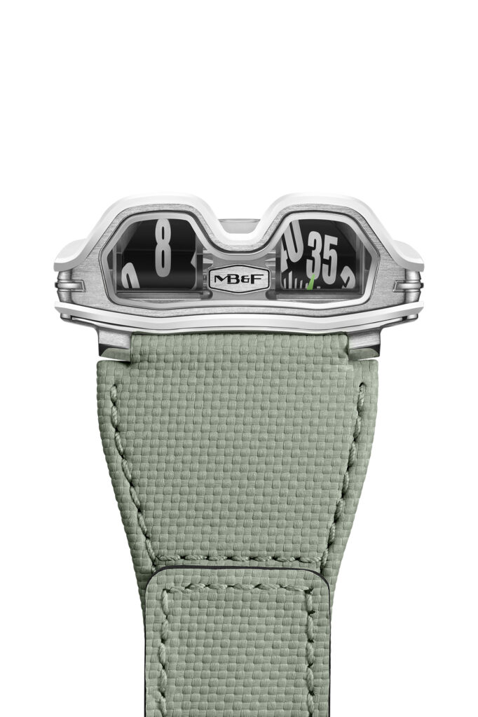 La HM8 Mark 2 se distingue par son affichage innovant des heures et des minutes, qui utilisent des prismes en saphir pour projeter les chiffres verticalement, rappelant les compteurs de vitesse des voitures. Ce système permet non seulement une lecture aisée de l’heure mais confère également à la montre une allure futuriste qui complète son inspiration automobile.