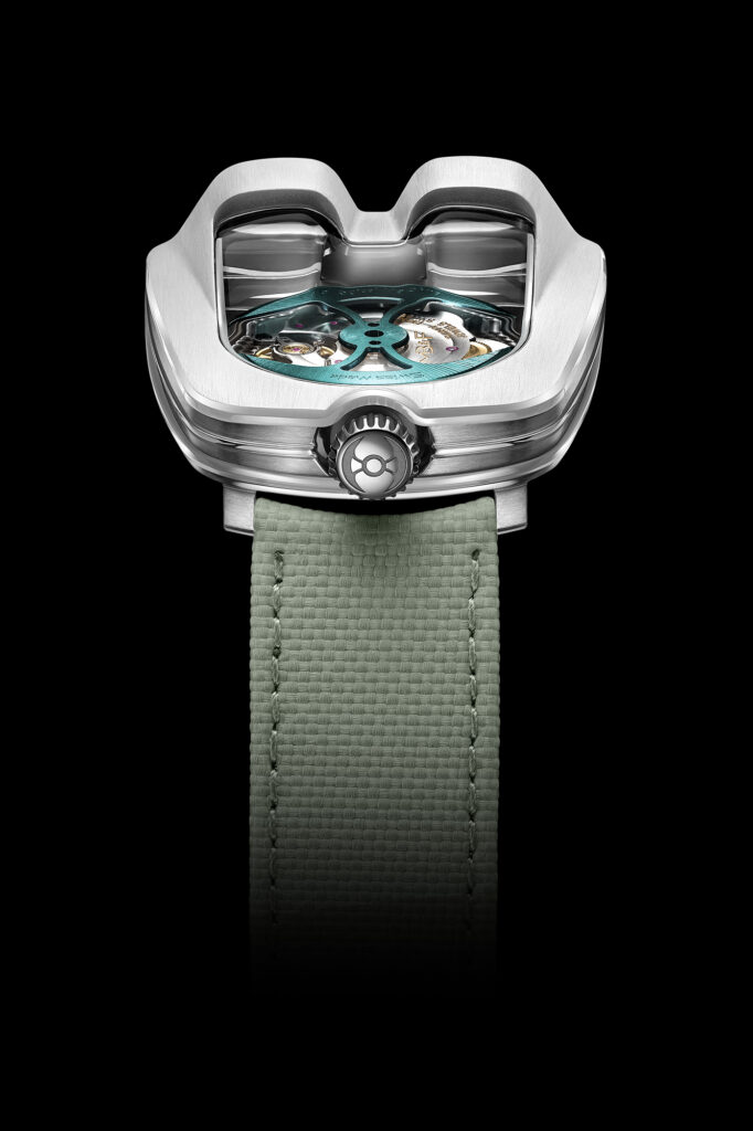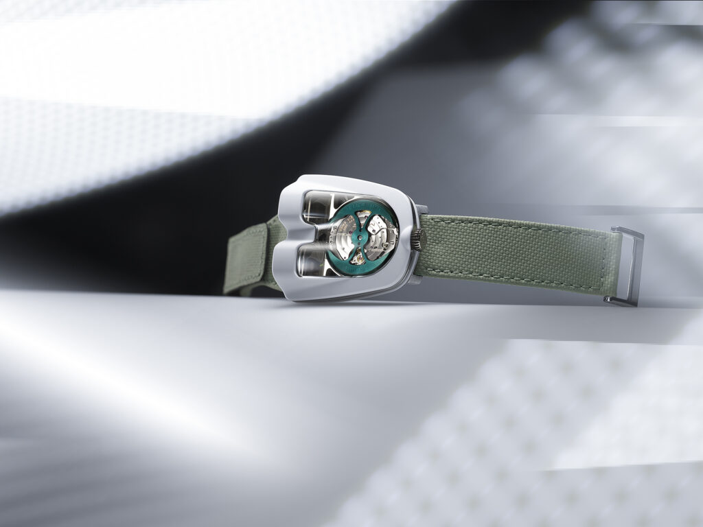 MB&F ne se repose pas sur ses lauriers en termes de matériaux utilisés. La HM8 Mark 2 utilise le CarbonMacrolon®, un composite avancé qui offre une résistance et une légèreté exceptionnelles, idéales pour une montre inspirée par l’automobile. Le choix de ce matériau n’est pas seulement esthétique mais également fonctionnel, car il garantit la durabilité et le confort, même lorsqu’elle est portée au quotidien.