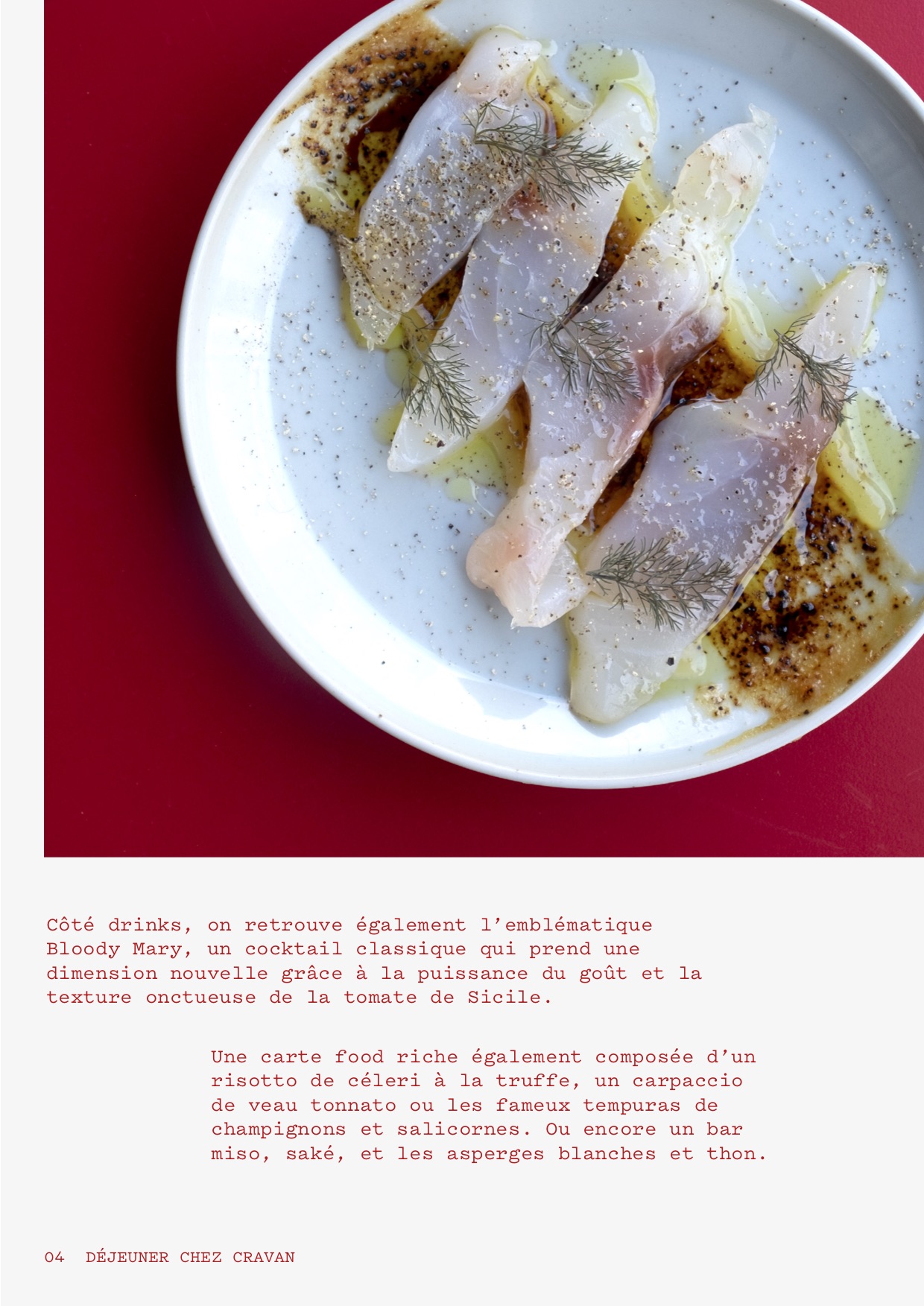 Le menu se complète d’autres délices tels que le risotto de céleri à la truffe, le carpaccio de veau tonnato, ou encore des tempuras de champignons et salicornes. Le bar au miso et saké avec des asperges blanches et thon représente une autre facette de l’offre diversifiée de Cravan, mettant en avant des produits de saison et des associations de saveurs audacieuses.