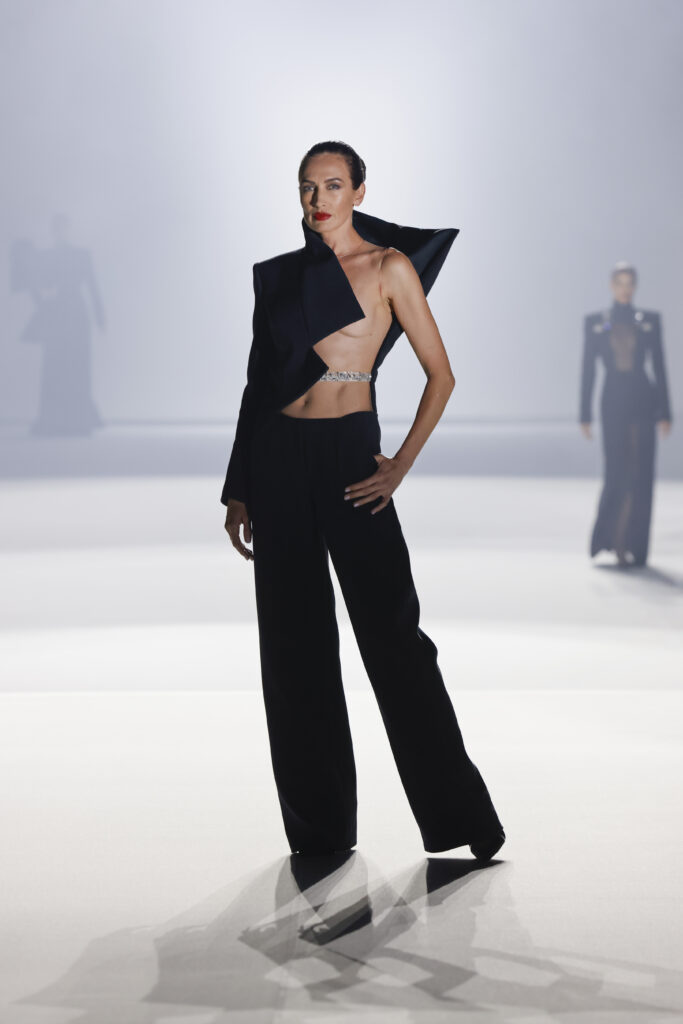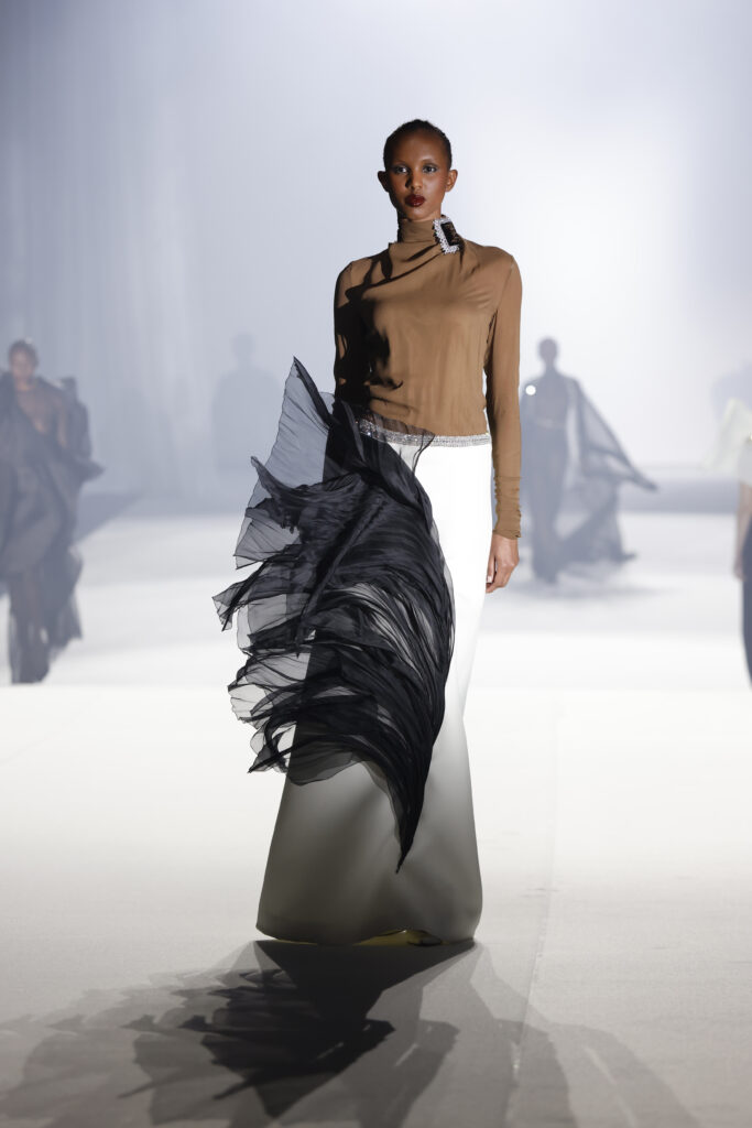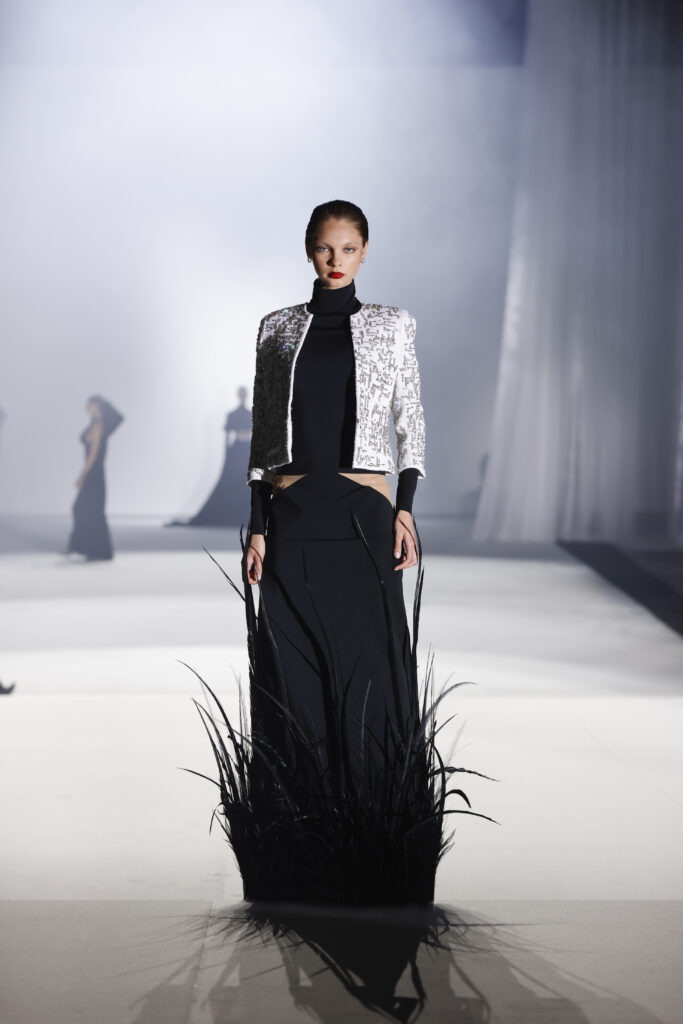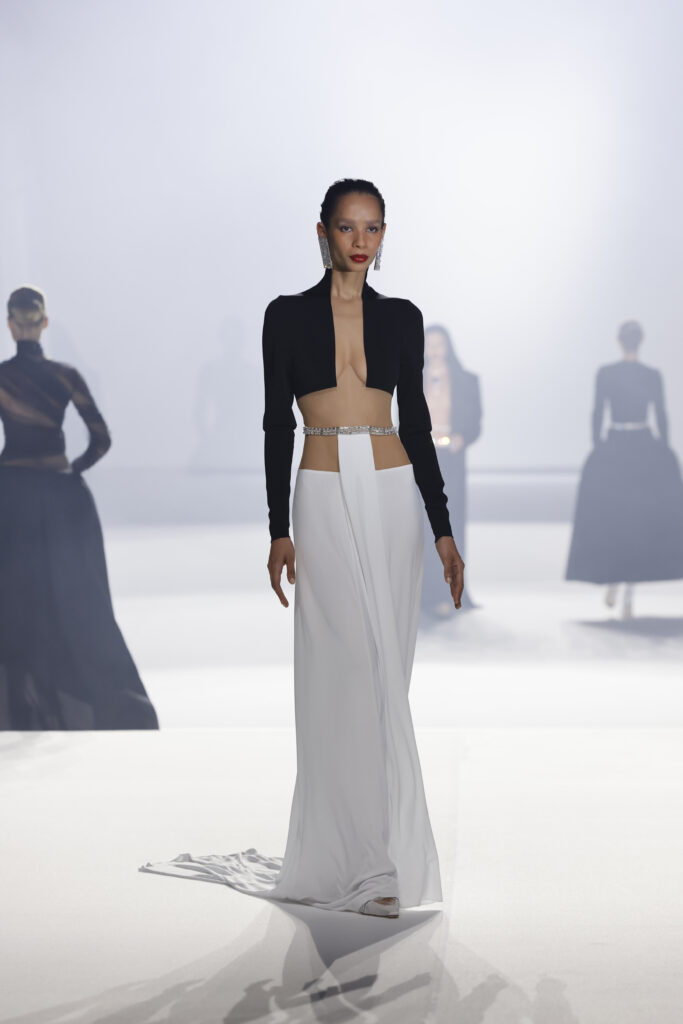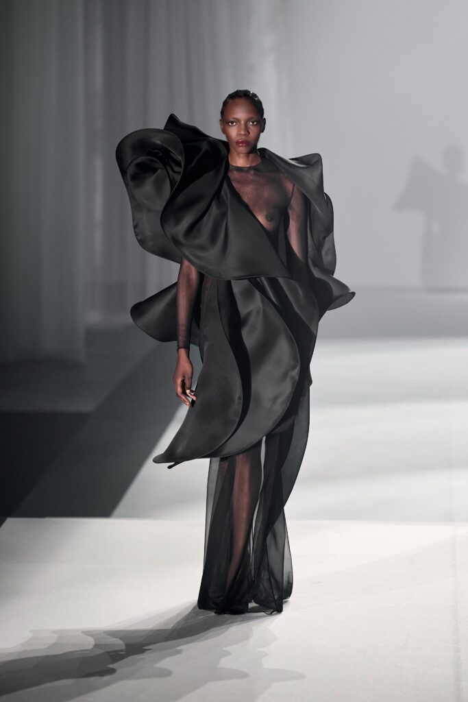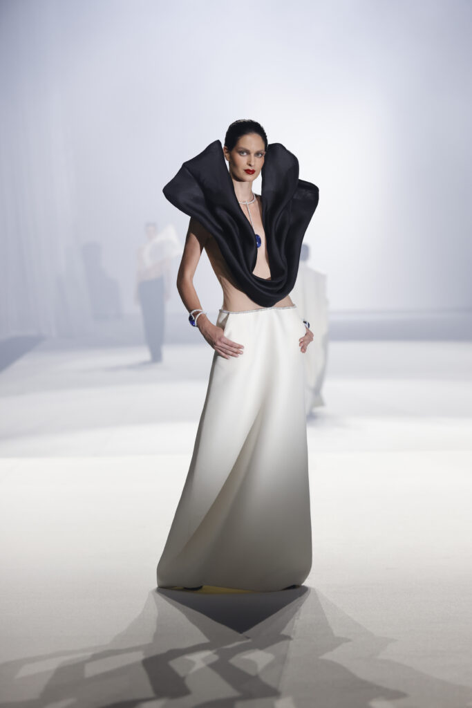 Les créations de Rolland, dominées par le noir profond et le blanc éclatant, reflètent les contrastes de Paris la nuit. Le pavé luisant et les sculptures de bronze prennent vie à travers des costumes noirs et des robes tailleurs ajourées d’organza, créant une atmosphère mystérieuse et androgynous.