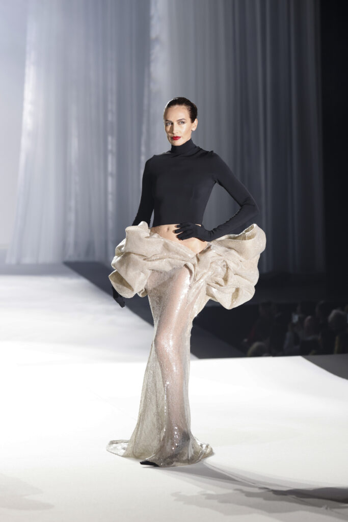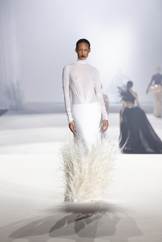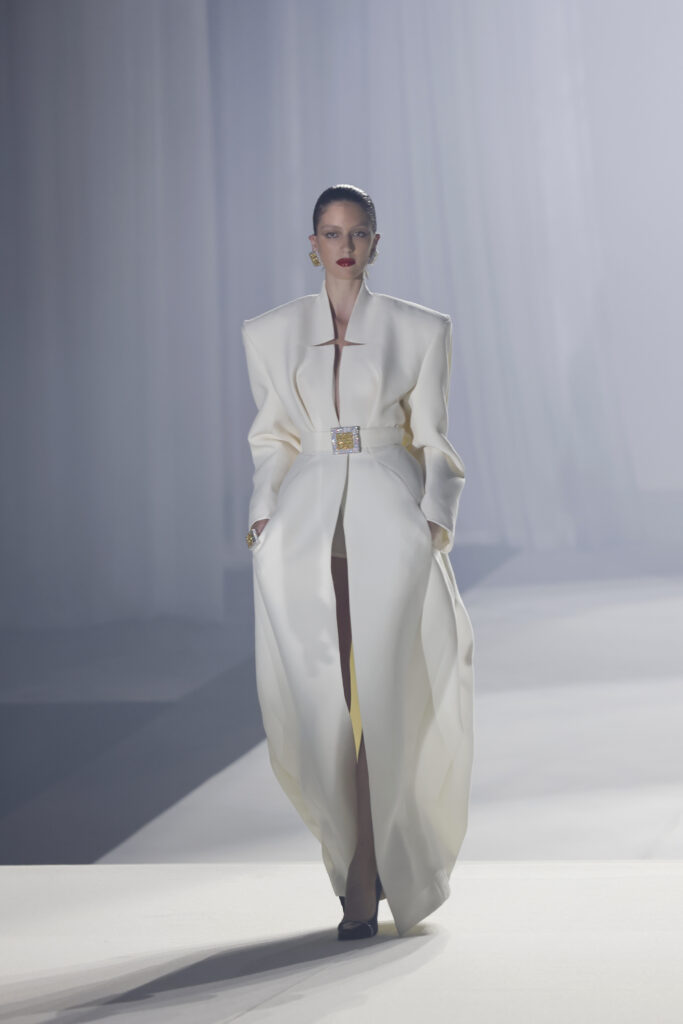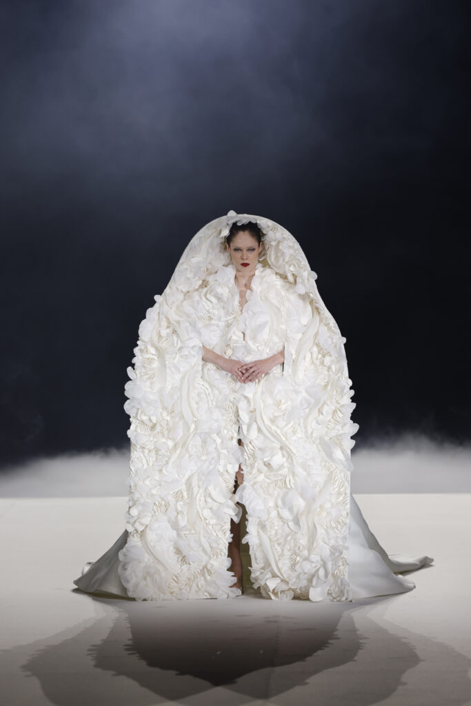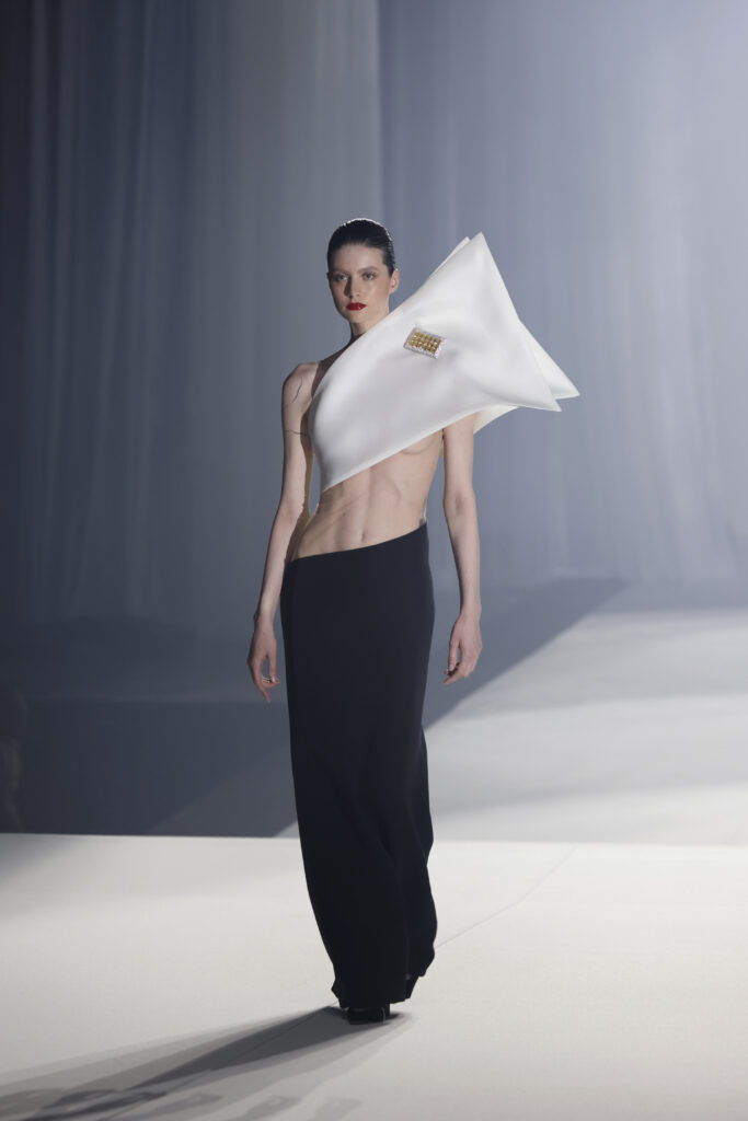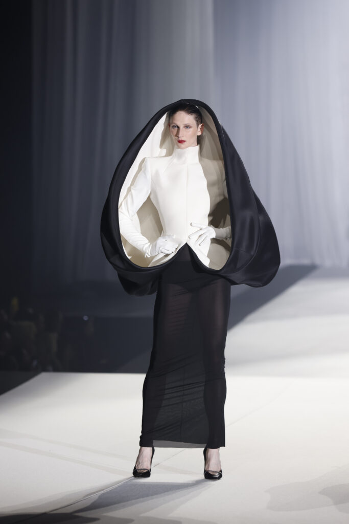 Les créations de Rolland, dominées par le noir profond et le blanc éclatant, reflètent les contrastes de Paris la nuit. Le pavé luisant et les sculptures de bronze prennent vie à travers des costumes noirs et des robes tailleurs ajourées d’organza, créant une atmosphère mystérieuse et androgynous.