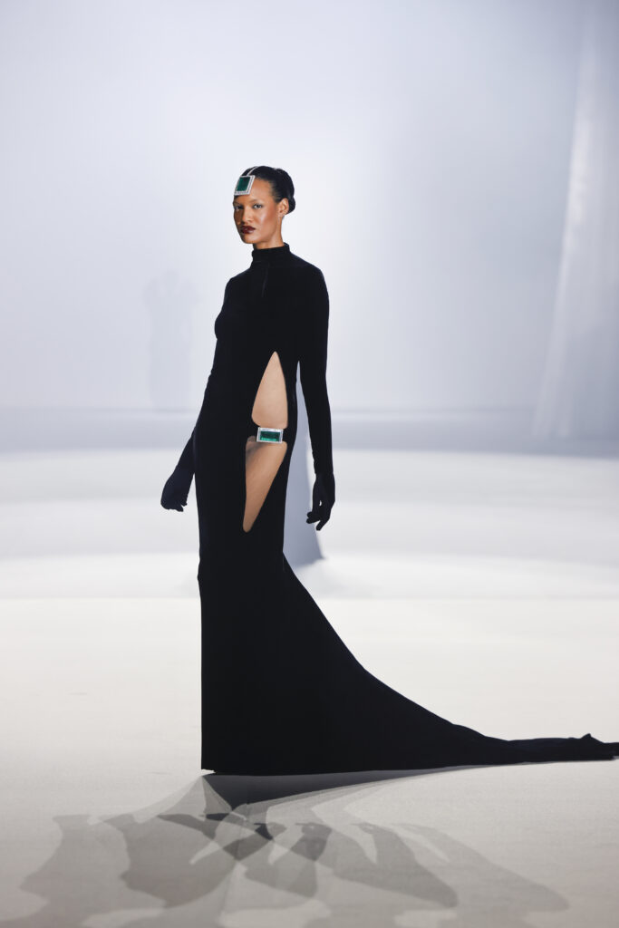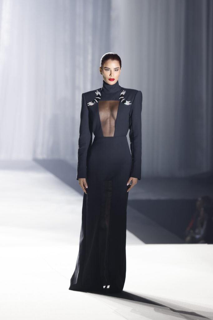 Les pièces maîtresses incluent des combinaisons smoking ajourées en crêpe de laine et satin noir, des robes tailleurs ornées de broderies en onyx et diamants, et des robes de soirée en velours noir avec ceintures et broches en diamants. Chaque création est pensée pour capturer l’élégance intemporelle et le luxe discret, avec une attention minutieuse aux détails et à la qualité des matériaux.