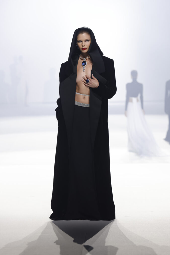 Le long manteau à capuche en velours et satin noir, paré de saphirs, dévoile la sensualité et l’intimité des créations, tandis que les robes ajourées dansent dans la lumière, insolentes et élégantes. Les écharpes de gazar et les jupes de mousseline noire fluides rappellent la Seine qui serpente à travers la ville, créant des mouvements ondoyants et des envolées gracieuses.