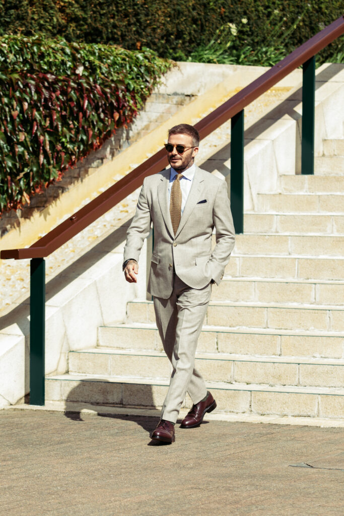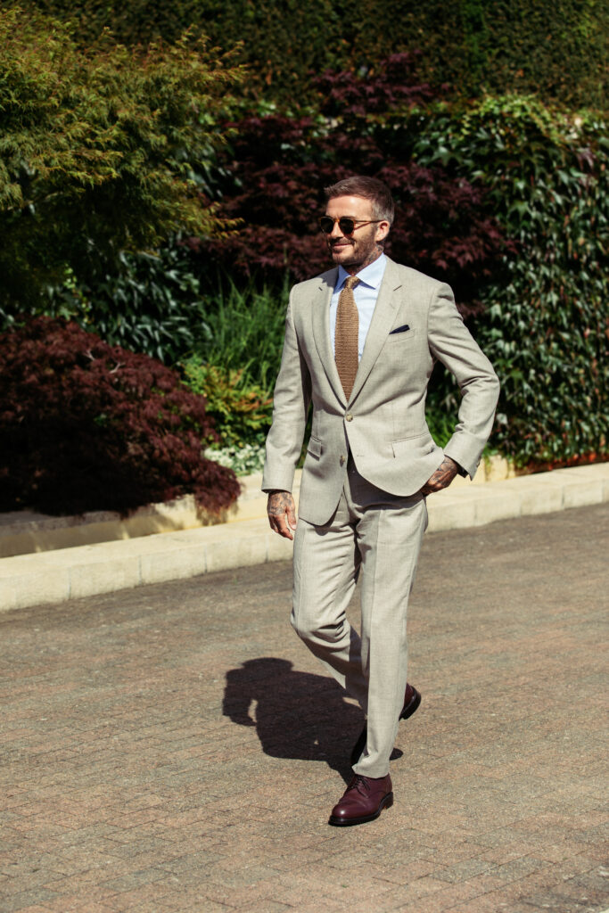 David Beckham portait un costume à simple boutonnage en laine vierge beige, assorti d’un pantalon coordonné. Il complétait son look avec une chemise en coton bleue et une cravate en maille de soie ton sur ton, créant ainsi une harmonie parfaite entre sophistication et décontraction. Ce choix vestimentaire souligne le sens aigu du style de Beckham, tout en mettant en avant l’excellence et le savoir-faire de BOSS.