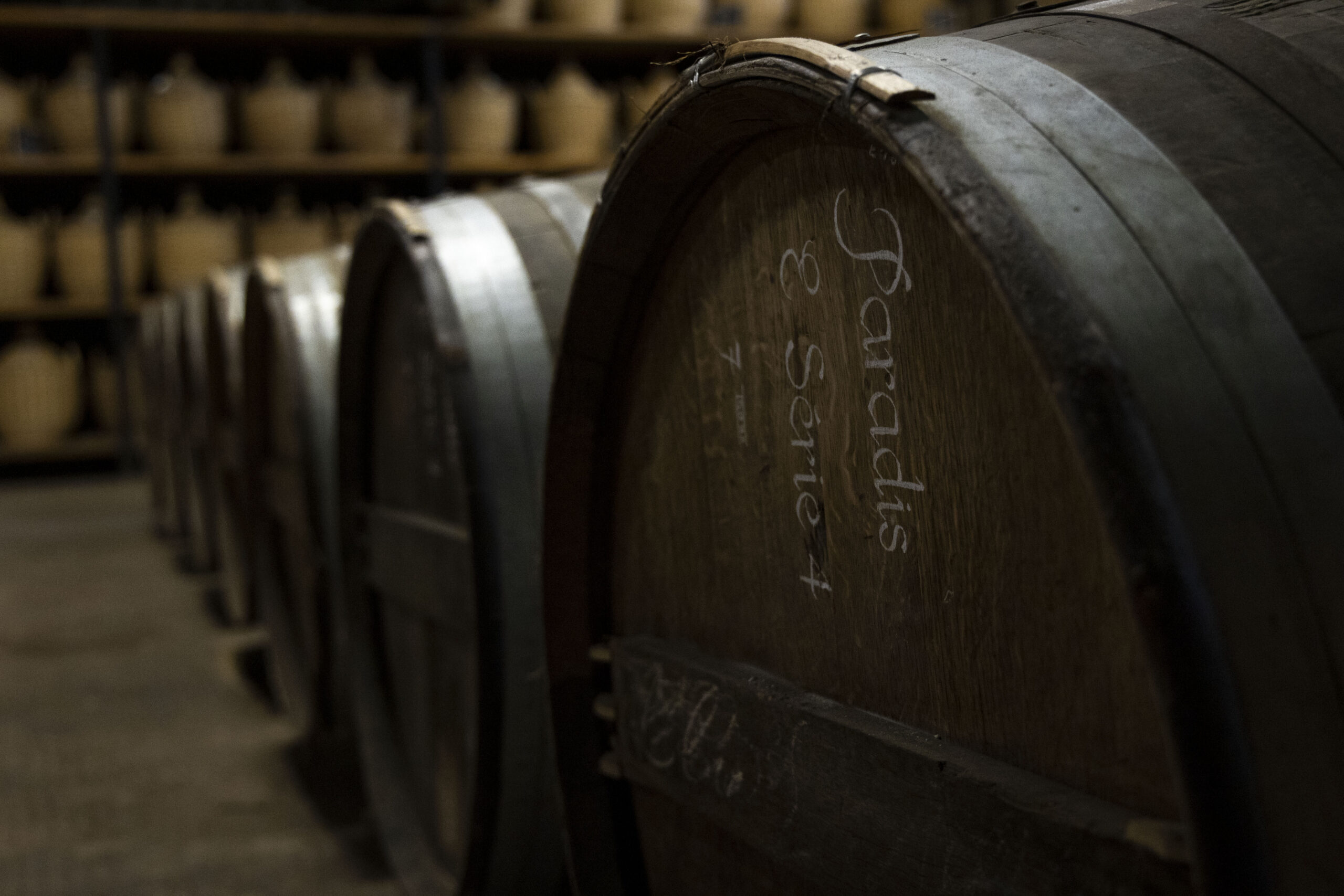 Qu’il s’agisse de graver des initiales ou d’adjoindre des accessoires en cuir précieux, chaque geste célèbre les savoir-faire transmis de génération en génération au sein de la Maison. La calligraphie appliquée aux carafes n’est pas sans rappeler celle qui orne les fûts les plus vénérables. Les liens en cuivre ou laiton rehaussant les cols élancés sont une réminiscence des cercles ouvragés ceignant les barriques d’exception.