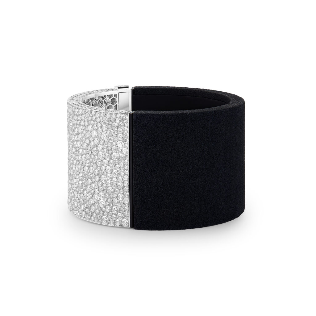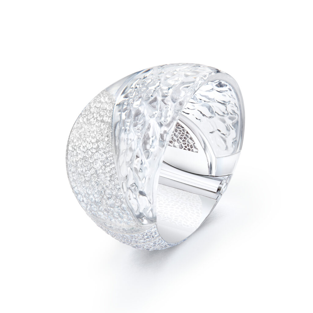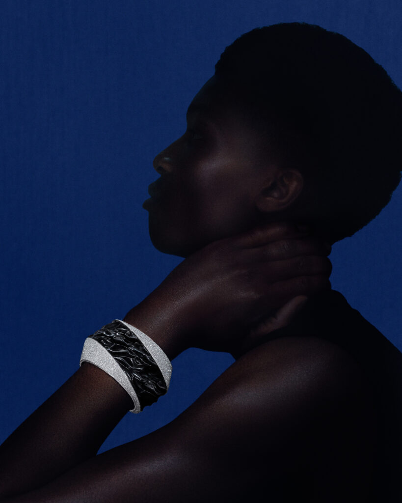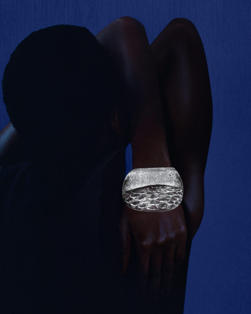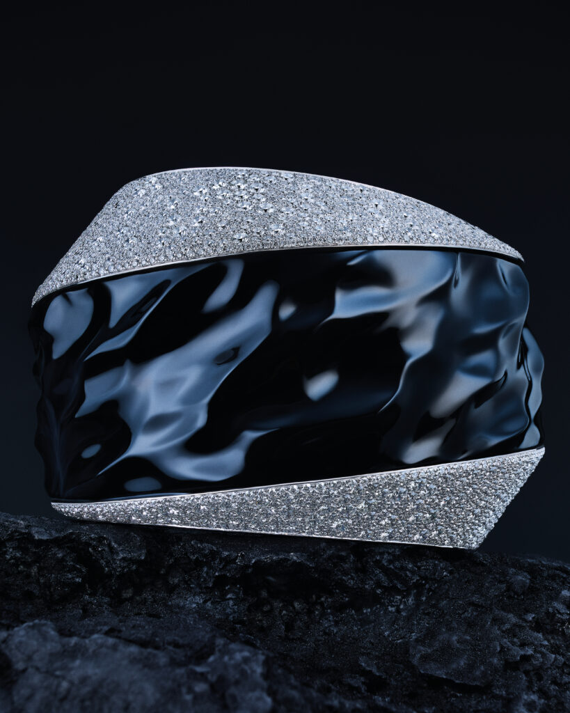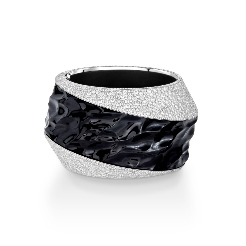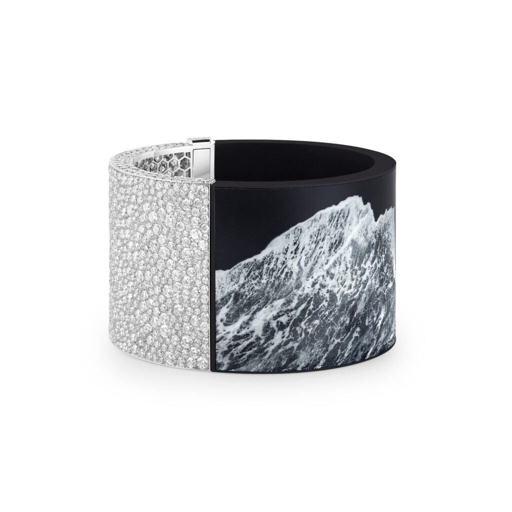 Le bracelet « Eau Forte » tire son inspiration de l’instant où la vague s’échoue. Utilisant la technique de gravure à l’eau-forte, les artisans ont sculpté l’or blanc pour créer un volume de vague, puis appliqué des couches de laque blanche et noire pour un contraste saisissant. Cette pièce en or blanc, pavée de diamants, a requis 900 heures de travail.