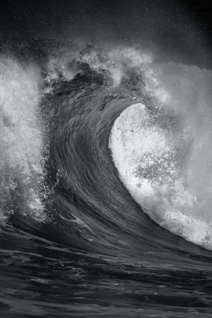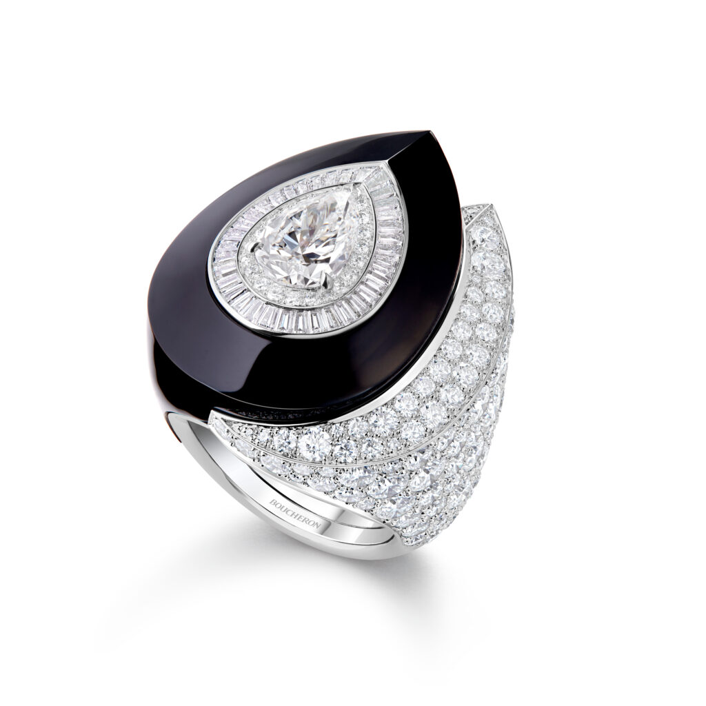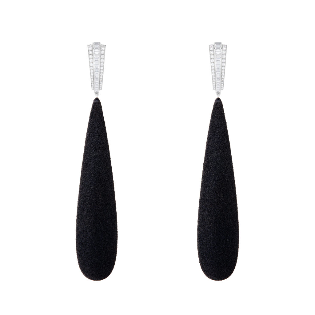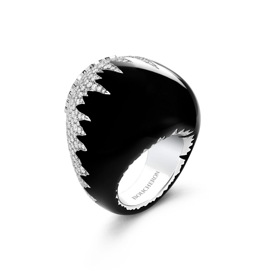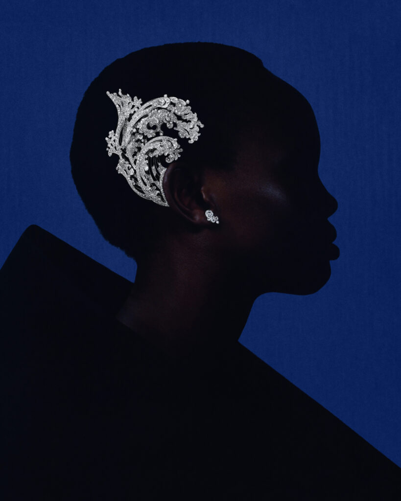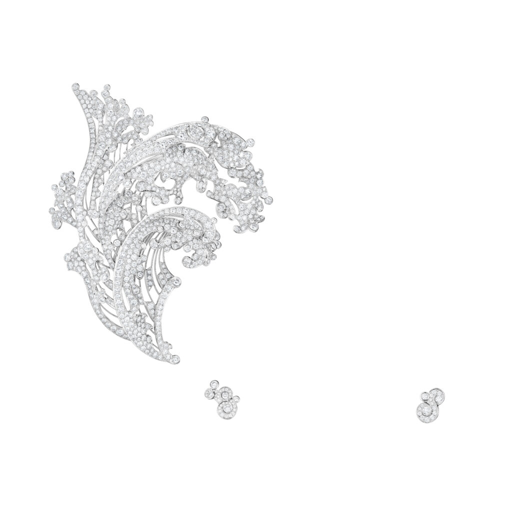 Le bracelet « Eau Forte » tire son inspiration de l’instant où la vague s’échoue. Utilisant la technique de gravure à l’eau-forte, les artisans ont sculpté l’or blanc pour créer un volume de vague, puis appliqué des couches de laque blanche et noire pour un contraste saisissant. Cette pièce en or blanc, pavée de diamants, a requis 900 heures de travail.