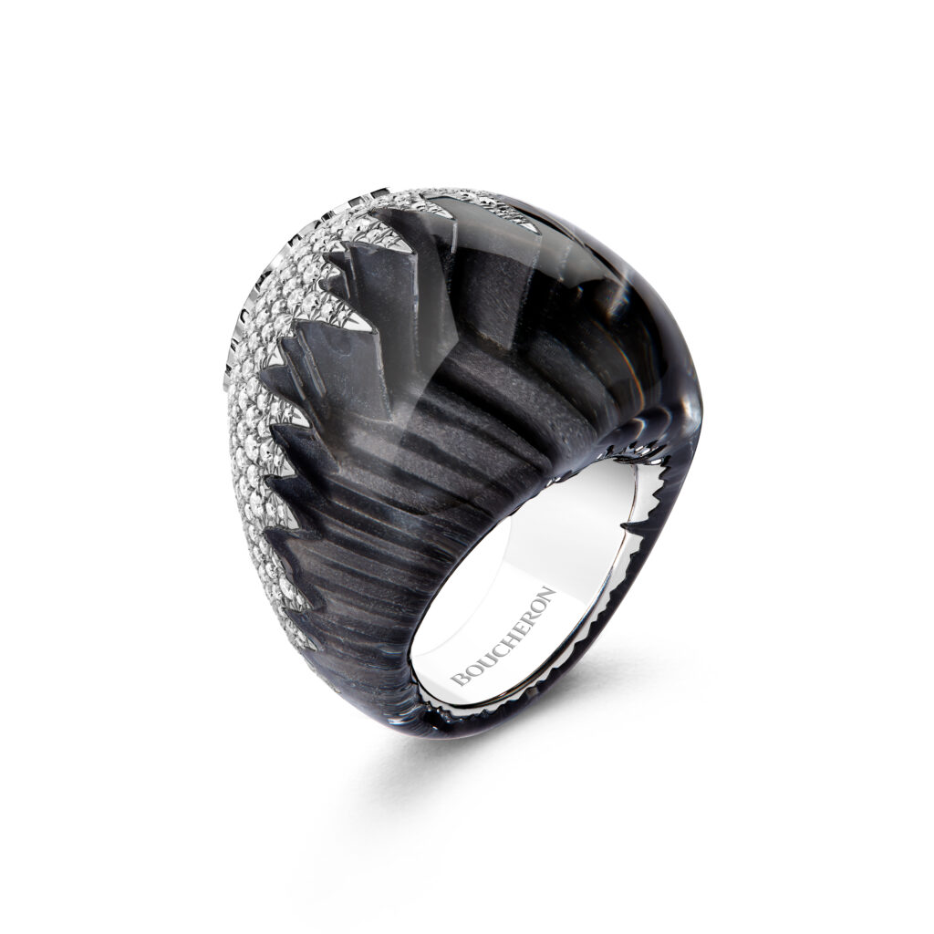 Deux bagues distinctes, l’une en obsidienne noire et l’autre en cristal de roche, évoquent l’écume des vagues sur les falaises islandaises. La première bague contraste la profondeur de l’obsidienne avec l’éclat des diamants, tandis que la seconde utilise la transparence du cristal de roche pour reproduire les hauteurs escarpées des falaises. Chaque bague a nécessité entre 50 et 240 heures de travail selon la complexité des matériaux.