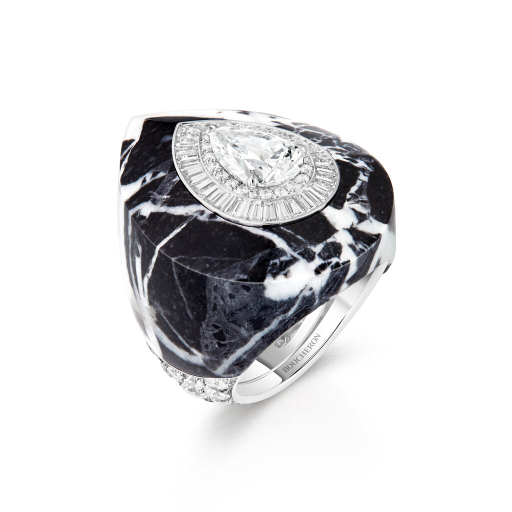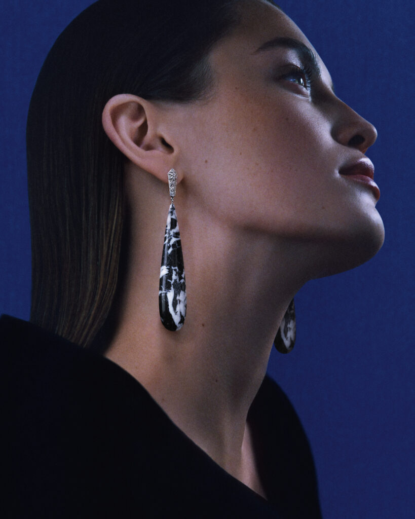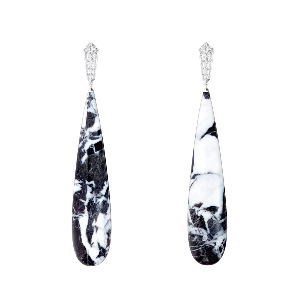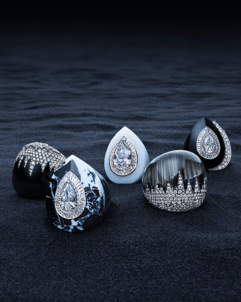 Cette série utilise du marbre « Grand Antique » pour évoquer les contrastes de la banquise islandaise. Les pendants d’oreilles et bagues en marbre et diamants, dont certaines serties d’un diamant central poire, sont le résultat de 110 heures de travail par pièce.