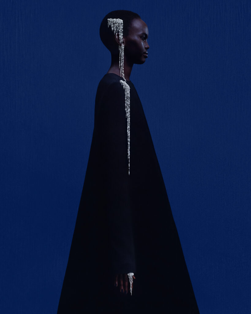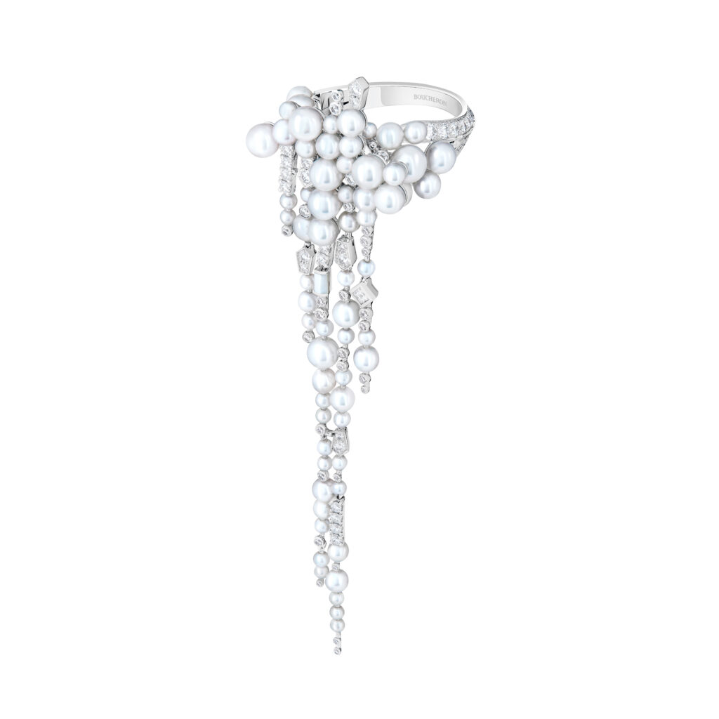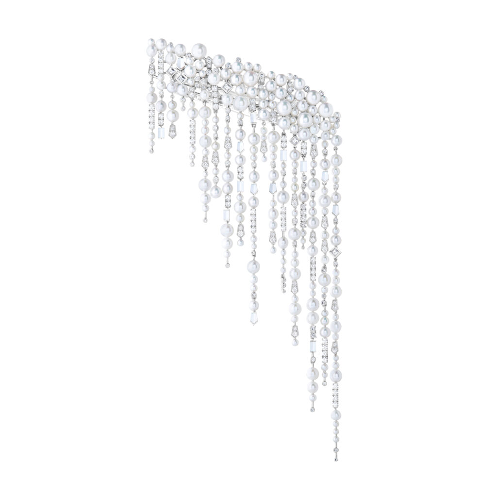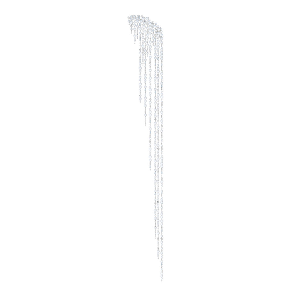 La parure « Givre » reproduit le mouvement des stalactites le long du corps à travers des bijoux de tête, boucles d’oreilles, bijoux d’épaule et bagues en perles Akoya, nacre et diamants. Chaque pièce est conçue pour suivre les mouvements naturels de l’eau fondante, totalisant 2 610 heures de travail.