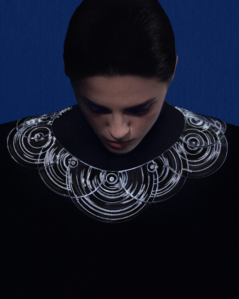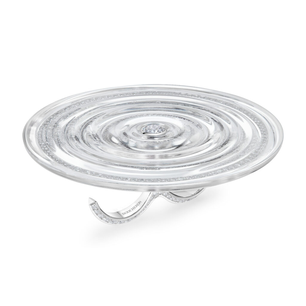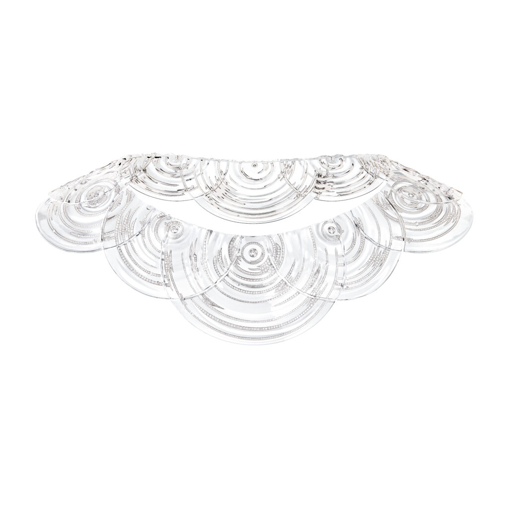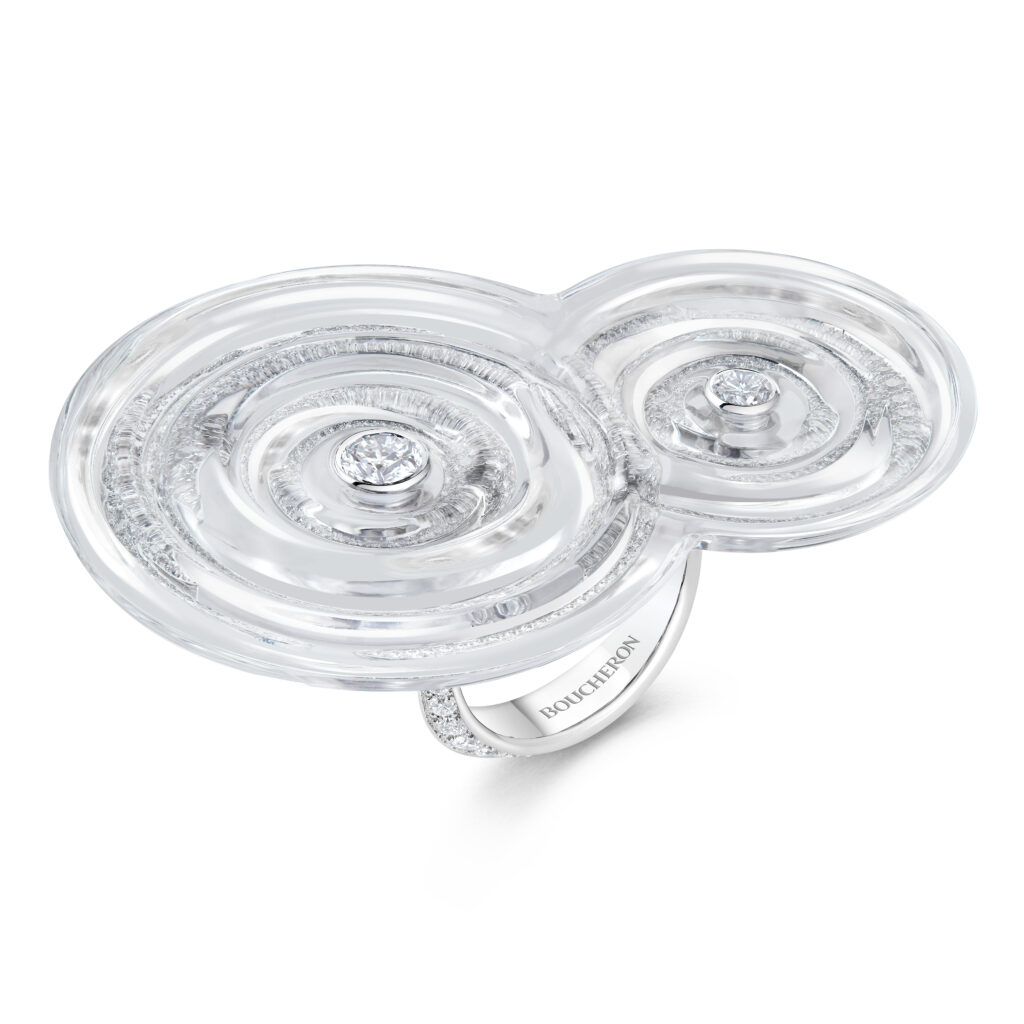 La parure « Ondes » capture le moment où une goutte brise l’équilibre de l’eau. Composée d’un collier et de deux bagues en cristal de roche et diamants, cette collection utilise un logiciel 3D pour simuler les volumes et donner une forme ondulatoire délicate aux pièces. Le métal se fait discret, offrant une transparence parfaite et une illusion de mouvement. Les artisans ont travaillé 5 050 heures pour réaliser ce collier, et 305 heures pour chaque bague.