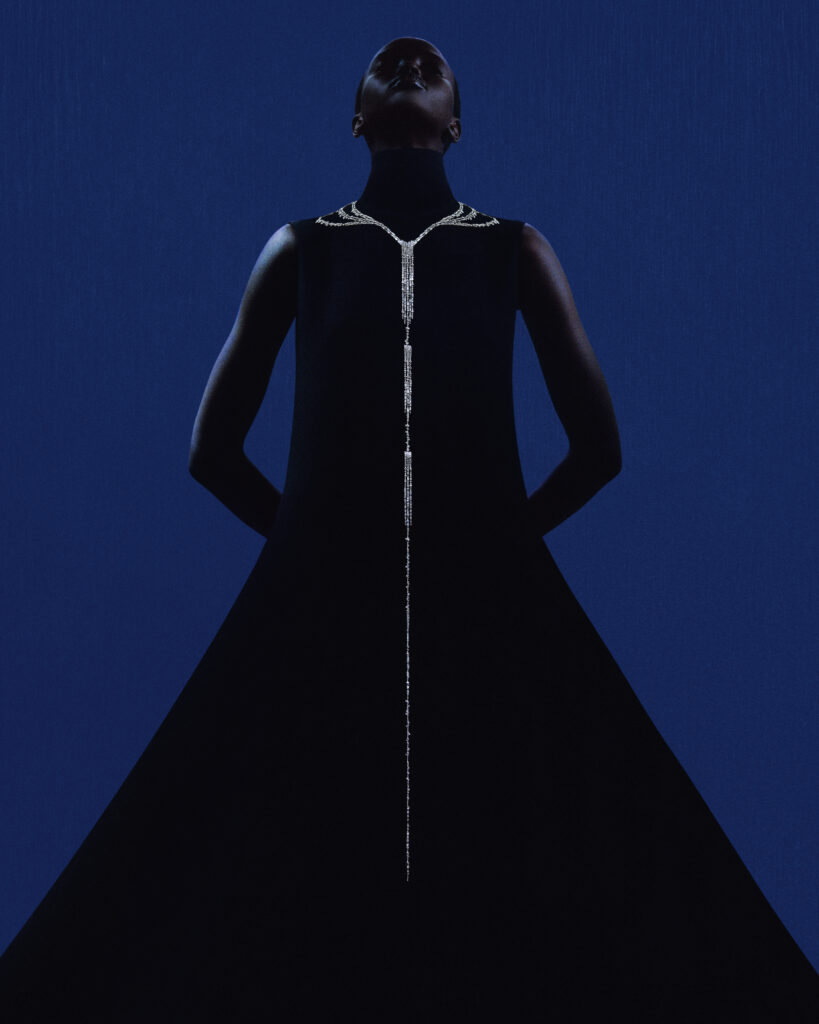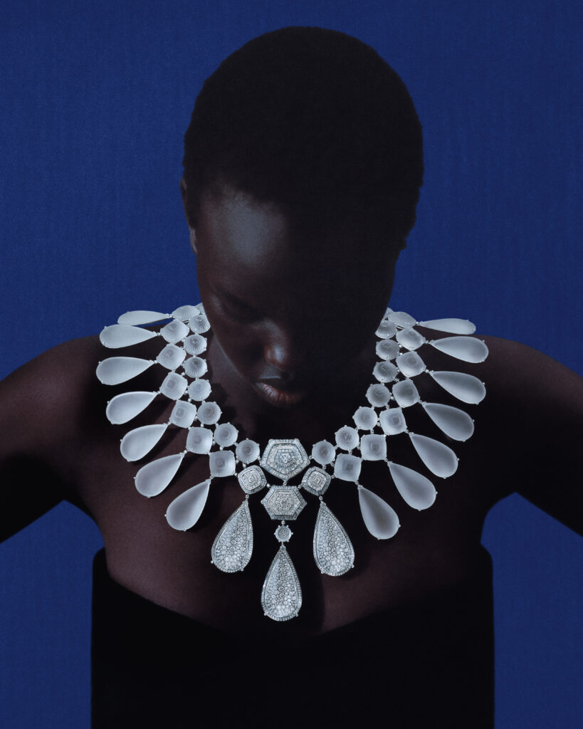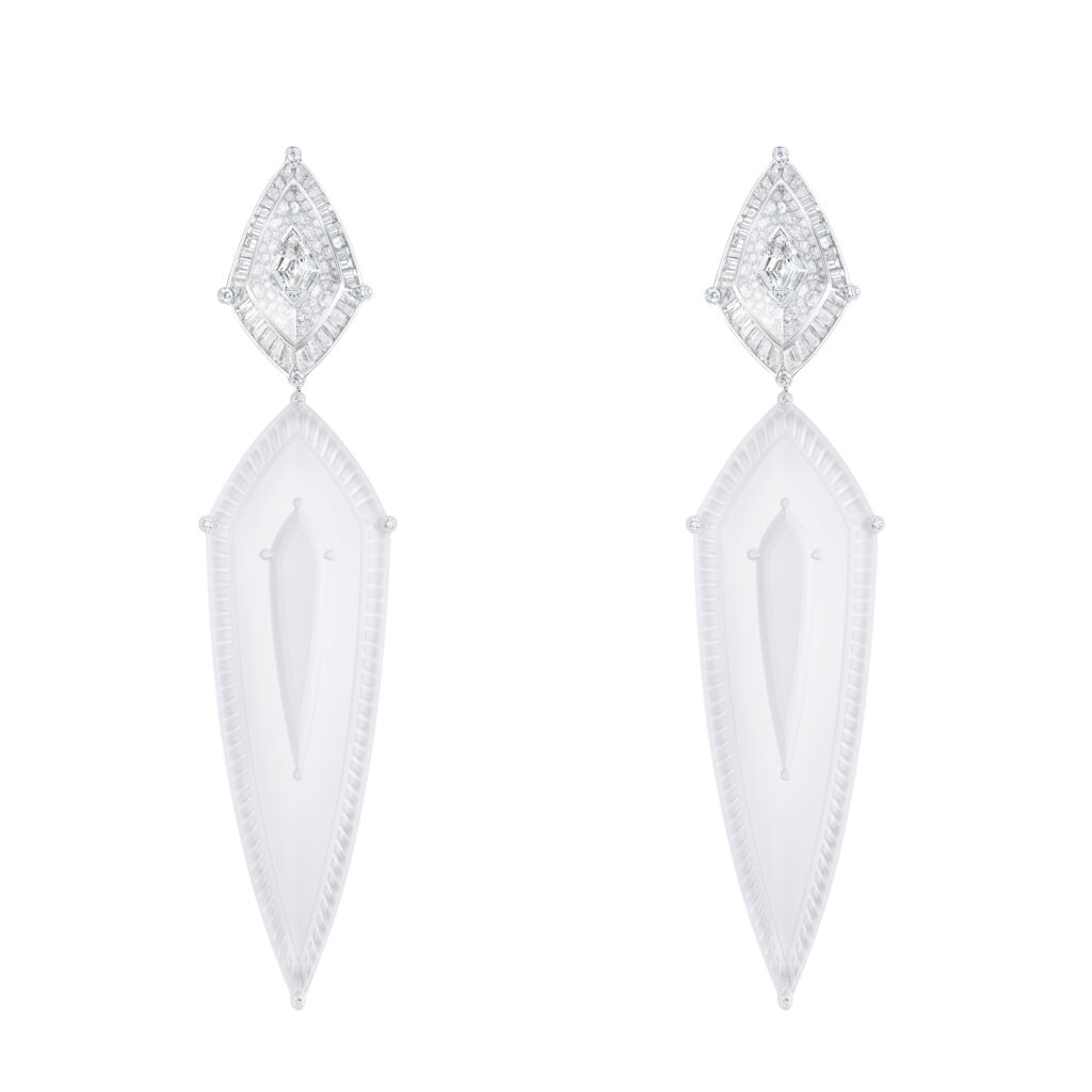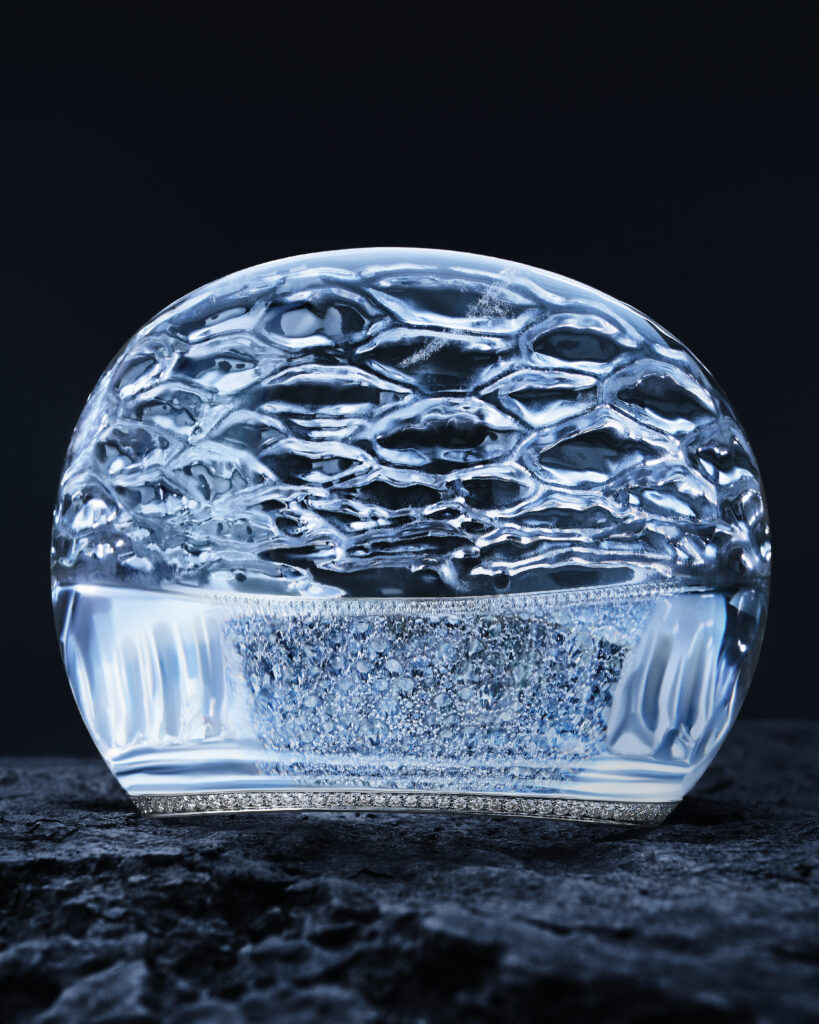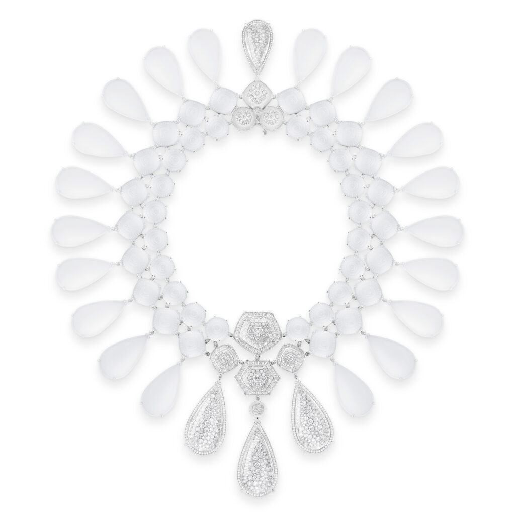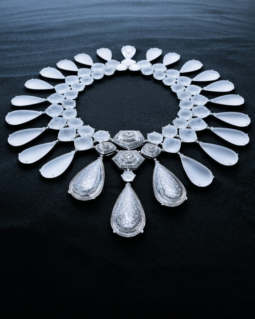 Inspirée par les blocs de glace sur les plages de sable noir, cette série comprend un collier et des boucles d’oreilles en cristal de roche et diamants, reproduisant l’effet givré des icebergs. Les artisans ont travaillé 2 000 heures sur le collier et 410 heures sur les pendants d’oreilles, utilisant des techniques de trompe-l’œil pour faire léviter les pierres.