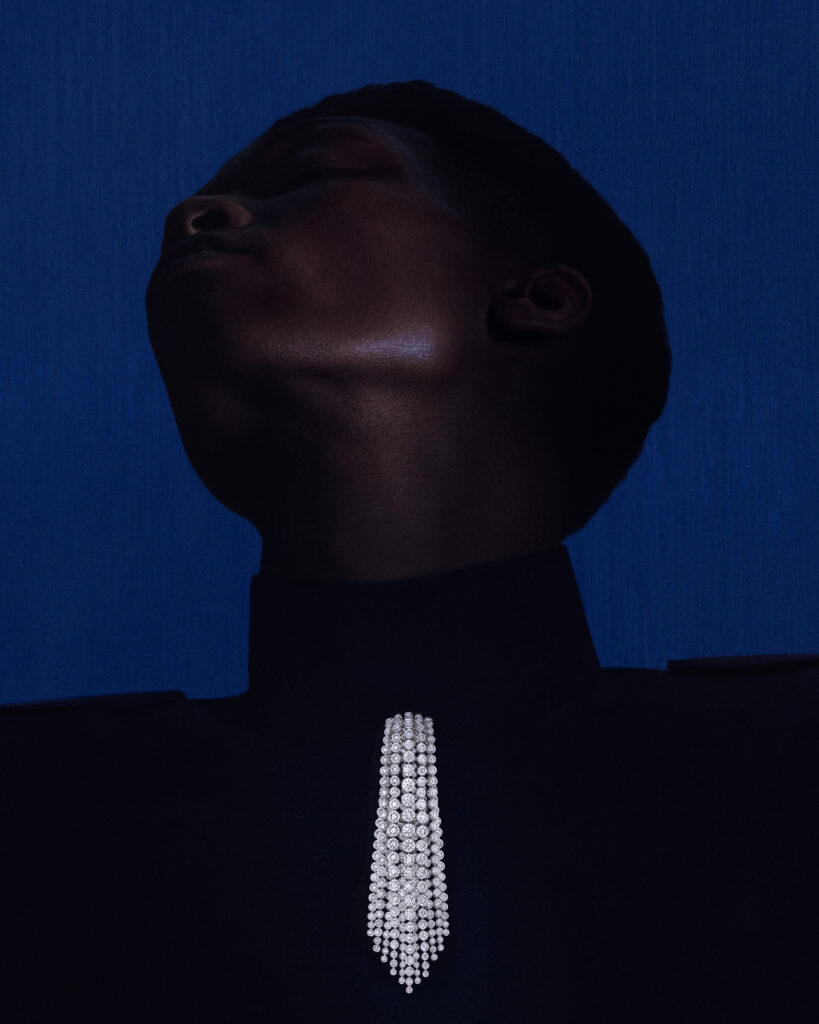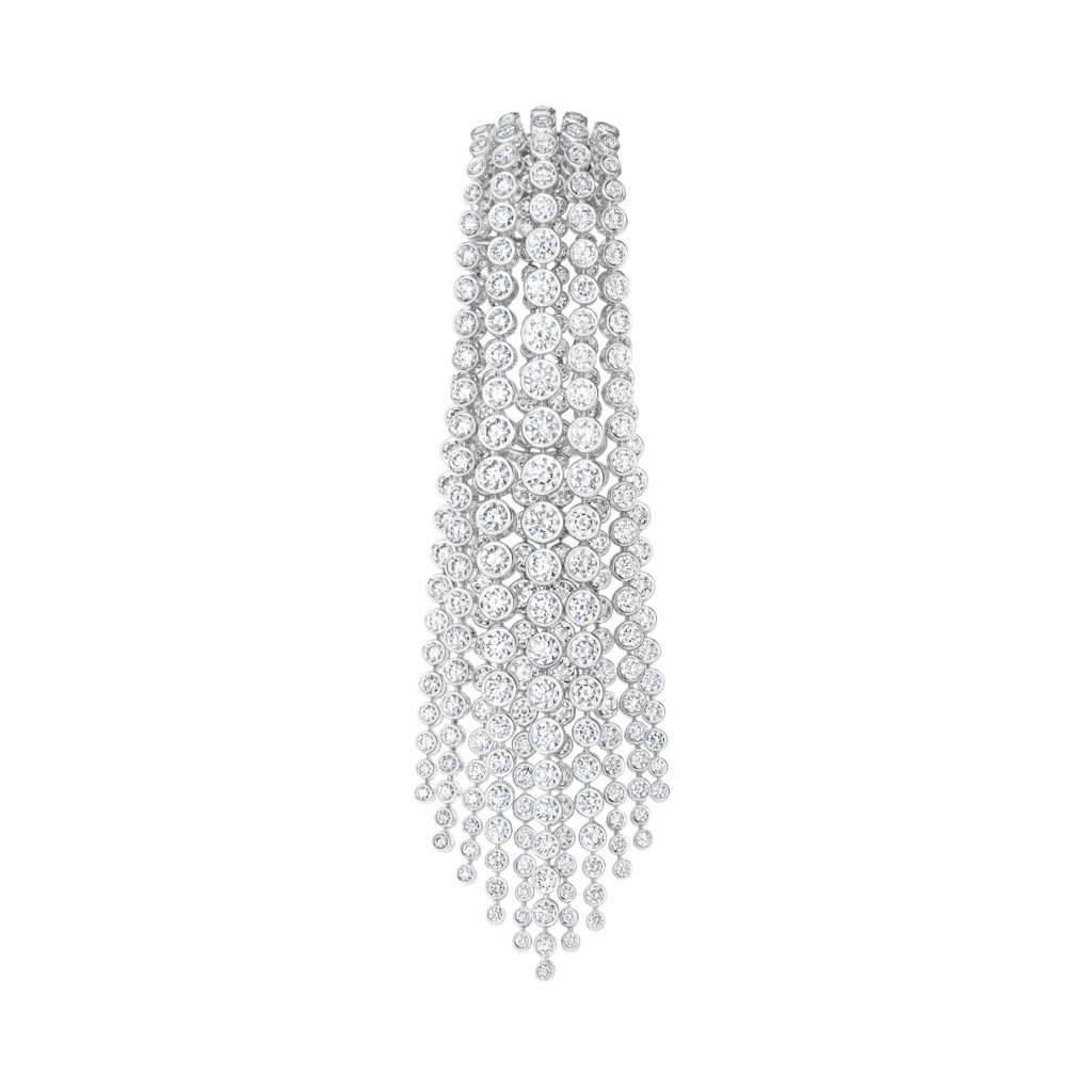 Face à une cascade islandaise, Claire Choisne imagine un collier de diamants, la plus longue pièce jamais réalisée par Boucheron, mesurant 148 cm. Cette création en or blanc et diamants, composée de 1 816 pierres de tailles différentes, peut se métamorphoser en un collier plus court avec une paire de pendants d’oreilles. Les artisans ont consacré 3 000 heures pour achever cette pièce d’une souplesse extrême et d’un réalisme saisissant.
