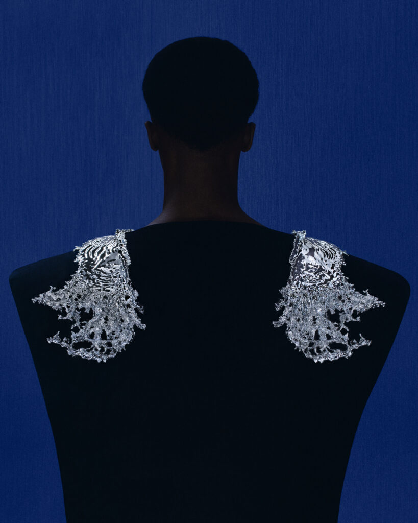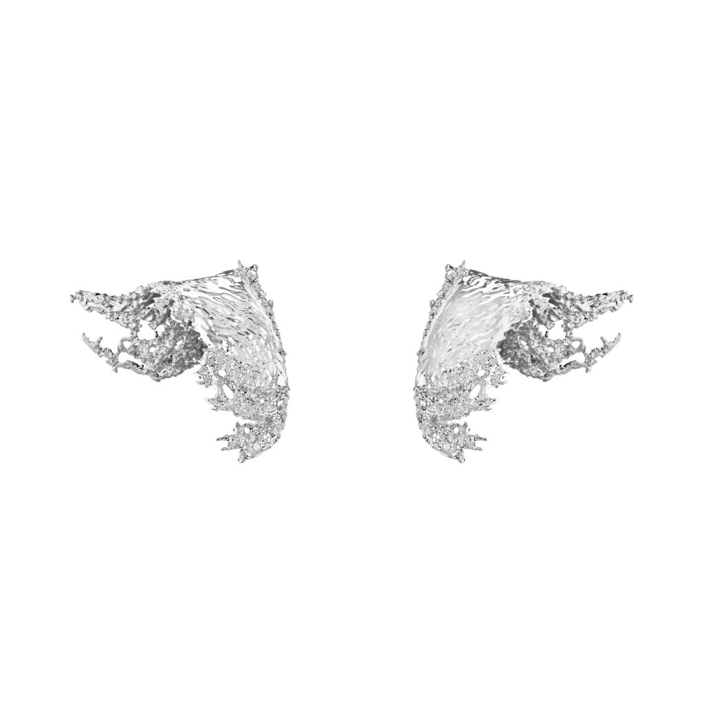 Les broches d’épaule « Eau Vive », en aluminium et pavées de diamants, capturent la force impétueuse des eaux islandaises. Sculptées à partir d’un bloc d’aluminium, ces pièces légères et brillantes ont nécessité 980 heures de travail.