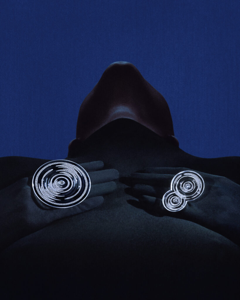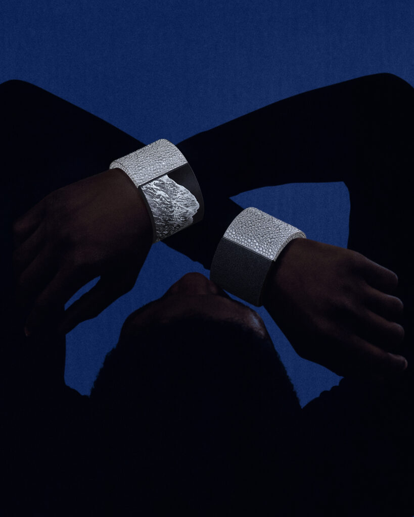 Inspirée par les eaux sombres d’Islande, cette série comprend un bracelet et une bague en obsidienne noire, sertis de diamants. Le bracelet, composé de deux blocs identiques d’obsidienne sculptée, et la bague avec un diamant poire de 2,01 carats, représentent le contraste entre la noirceur de la roche volcanique et l’éclat des diamants. Ces créations ont nécessité 355 heures pour le bracelet et 240 heures pour la bague.