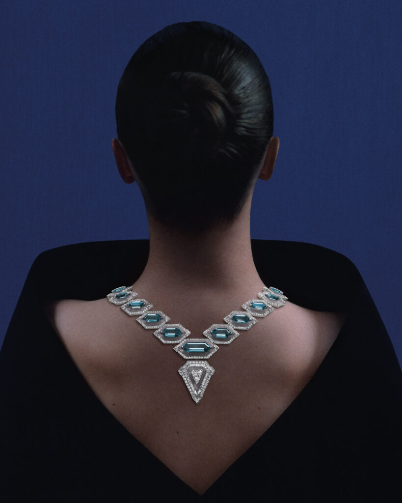 Le collier « Cristaux » met en lumière 24 aigues-marines dans des hexagones de cristal de roche. Avec un design inspiré par les glaciers islandais, ce collier en or blanc, transformable en bague, a nécessité 2 350 heures de travail.