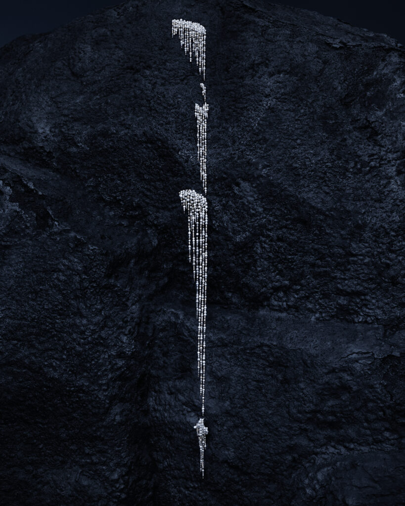 Les plages islandaises de sable noir ont inspiré une série de pièces, dont un collier, des boucles d’oreilles et une manchette, utilisant une technique d’impression 3D pour lier les grains de sable noir entre eux. Ces créations, rehaussées de diamants, figent la beauté de ces rivages clair-obscur. Le collier a nécessité 620 heures de travail.