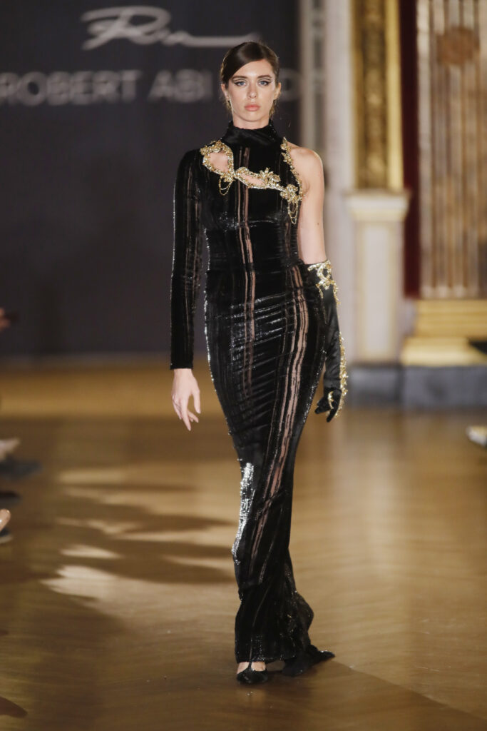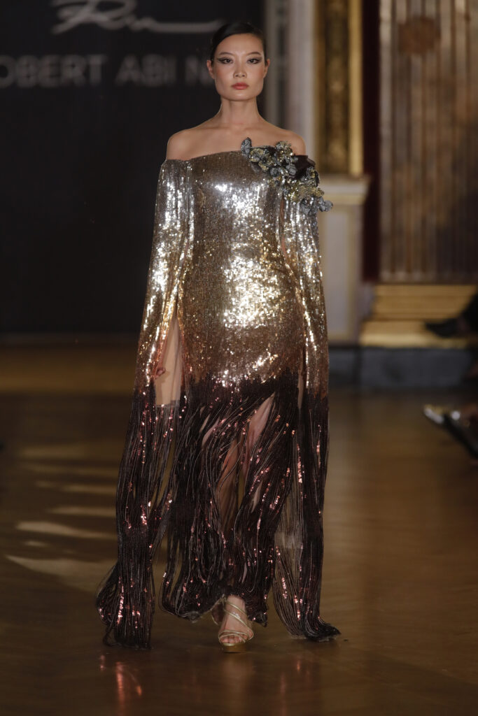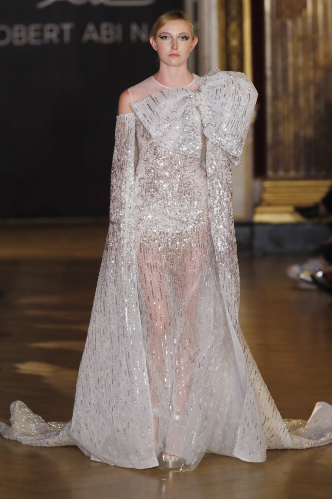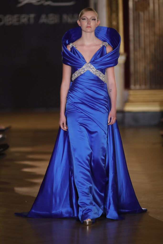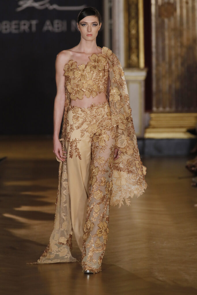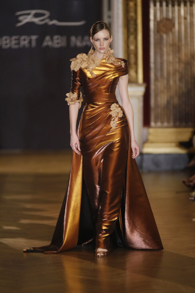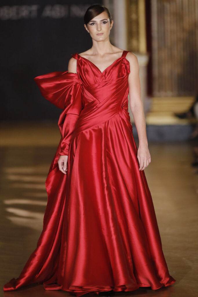 Les créations de Robert Abi Nader sont conçues pour représenter une femme à la fois délicate et forte, séduisante et élégante. Ses modèles ajustés au corps mettent en avant la féminité tout en évitant les coupes amples, préservant ainsi l’identité de chaque silhouette grâce à des tissus à la fois délicats et audacieux.