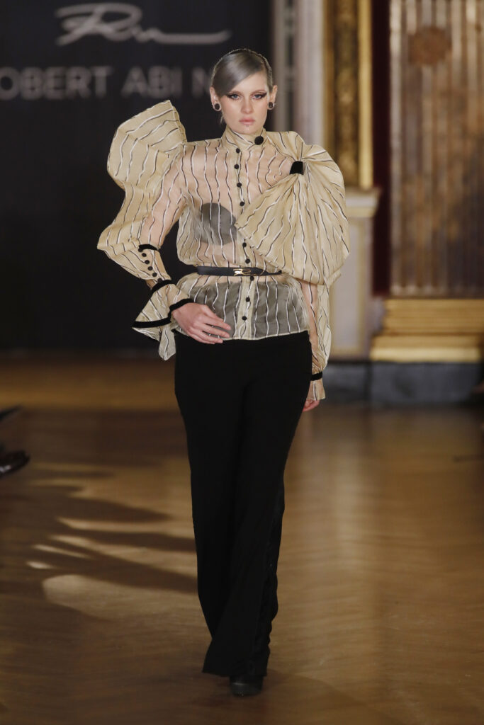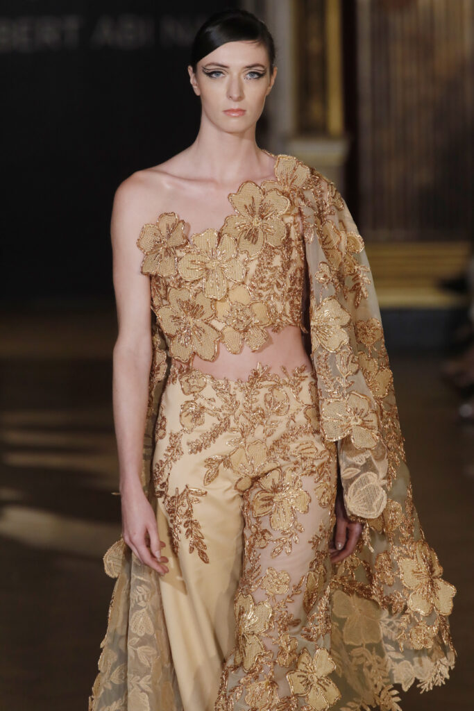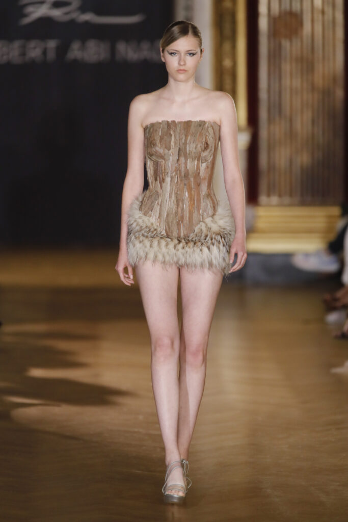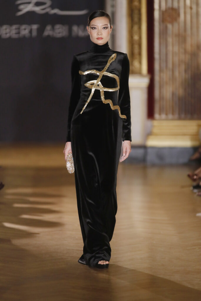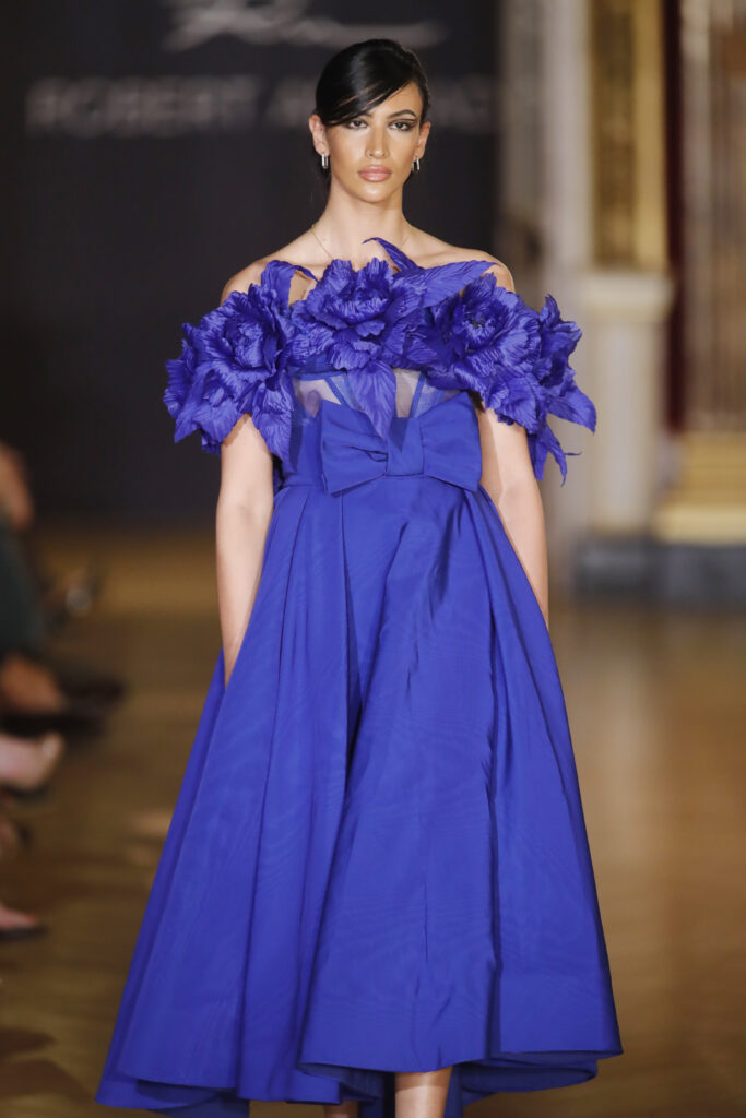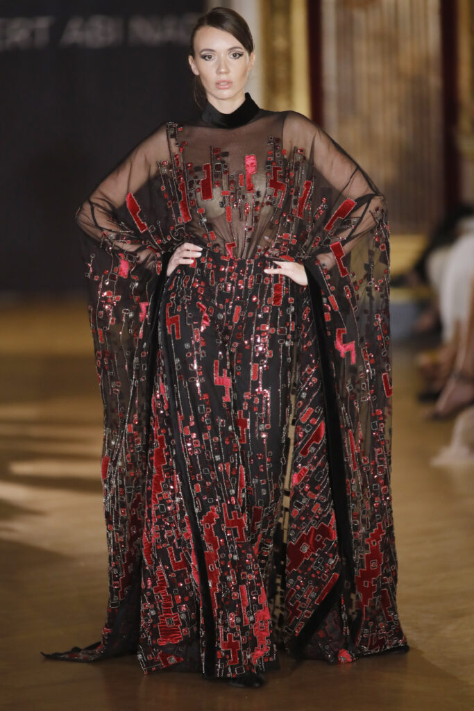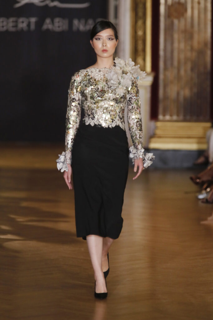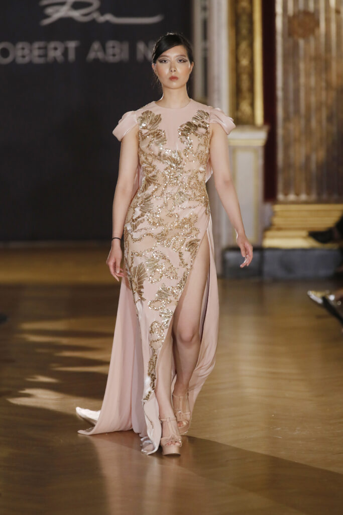 Les créations de Robert Abi Nader sont conçues pour représenter une femme à la fois délicate et forte, séduisante et élégante. Ses modèles ajustés au corps mettent en avant la féminité tout en évitant les coupes amples, préservant ainsi l’identité de chaque silhouette grâce à des tissus à la fois délicats et audacieux.