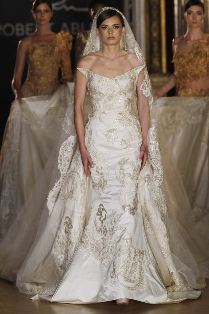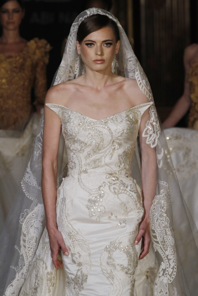La robe de mariée blanc cassé, ornée de broderies dorées, incarne l’élégance et l’espoir, tissant l’avenir dans un design enchanteur et luxueux. Cette création reflète parfaitement la vision de Van Gogh, réinterprétée par Robert Abi Nader pour capturer la beauté et la signification du jour de rêve.