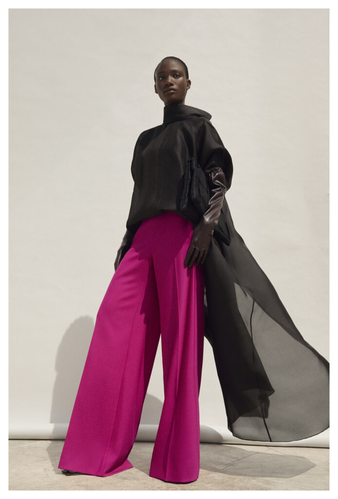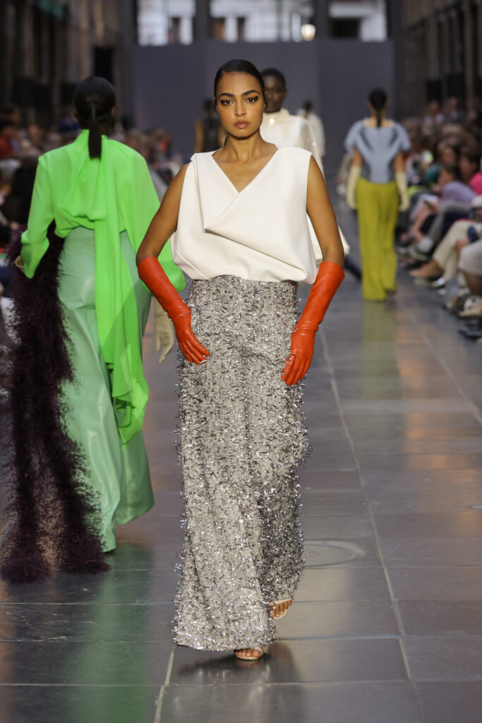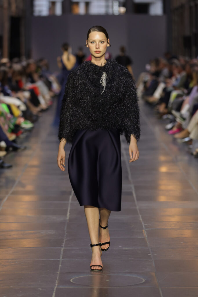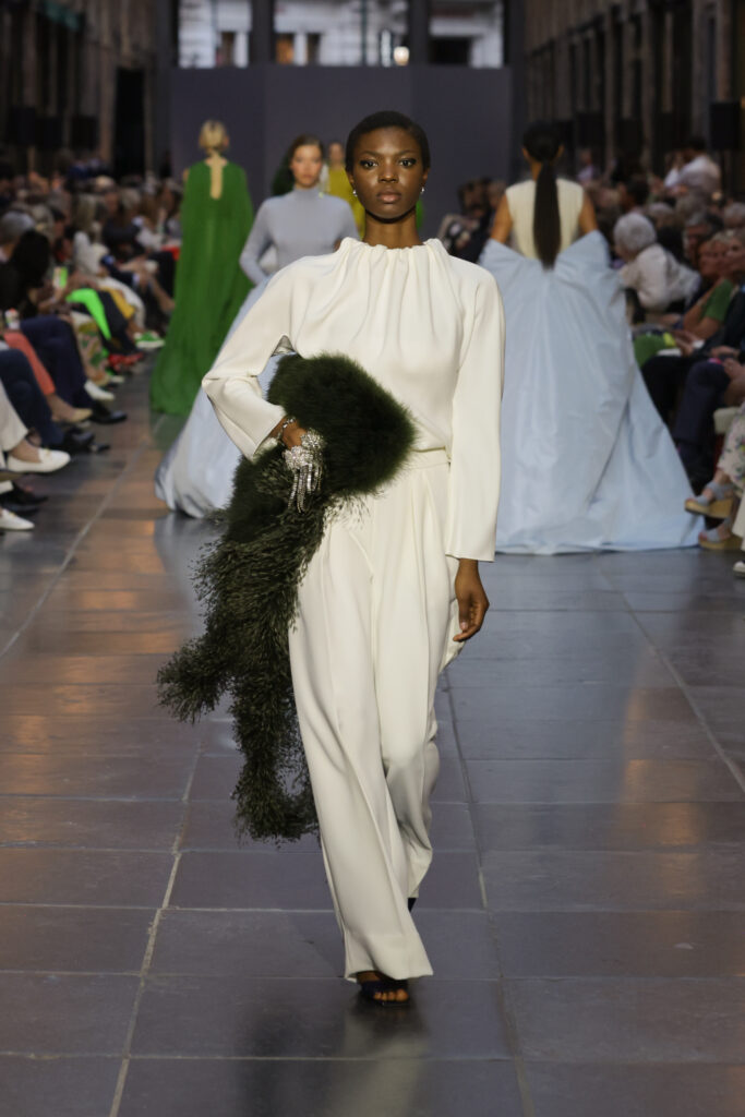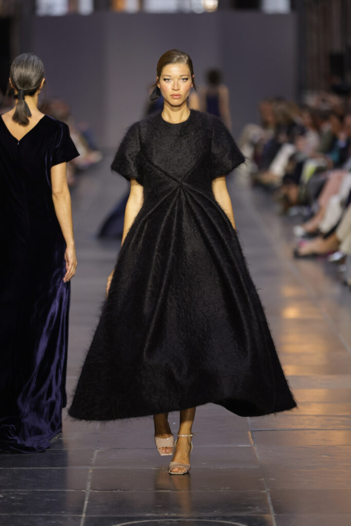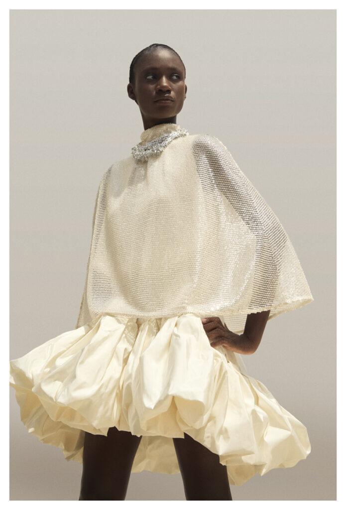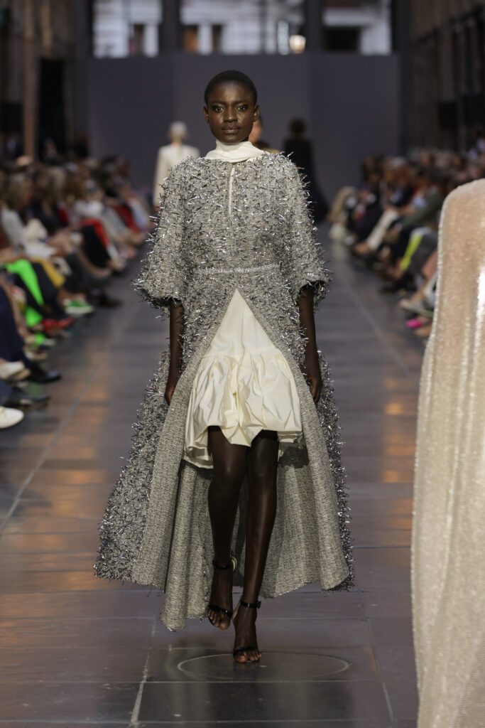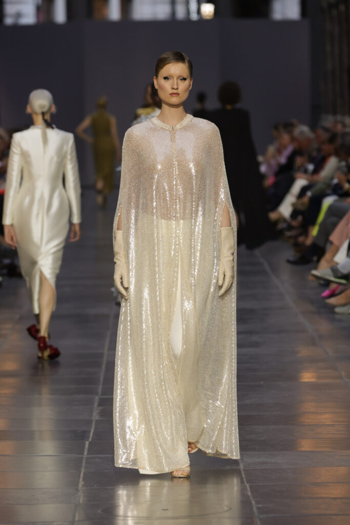 Cette saison, Edouard Vermeulen met en avant des constructions travaillées, des tailles hautes à plis plats, et des pantalons en mousseline qui dansent autour des jambes. Les longueurs varient du sous-genou à des pièces courtes, harmonisées avec de grands manteaux élégants. Des capelines brodées de perles translucides, des jupes amples cintrées à la taille, et des robes capes en organza noir créent une présence cinématographique.