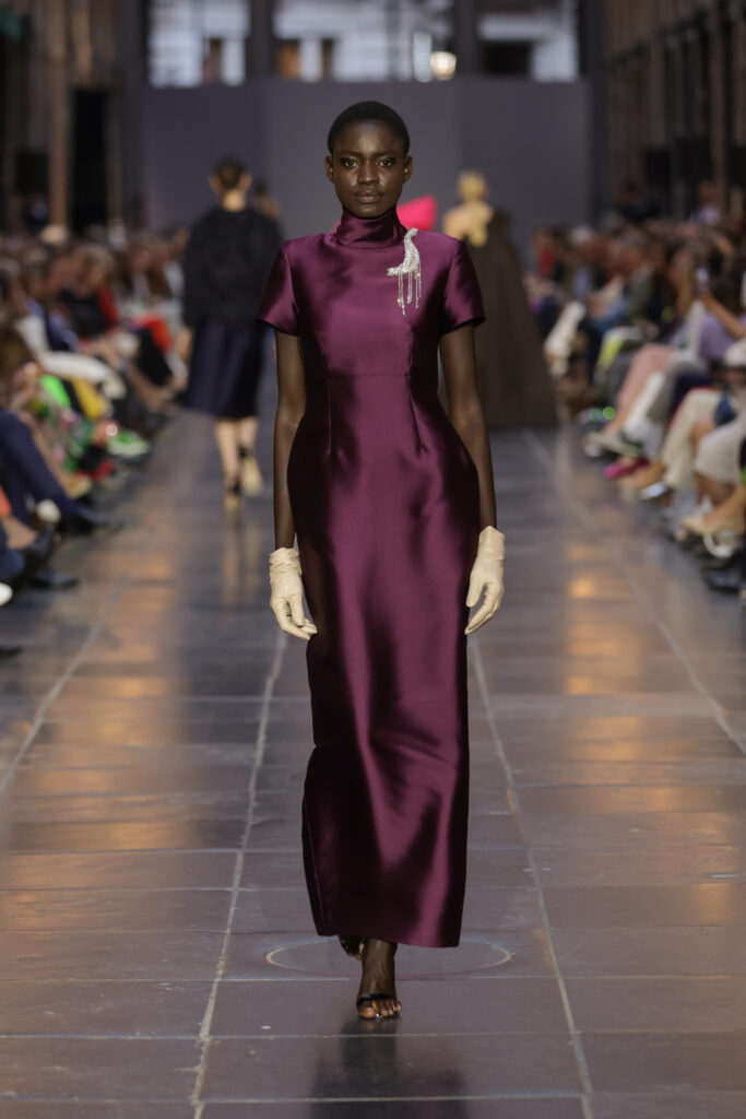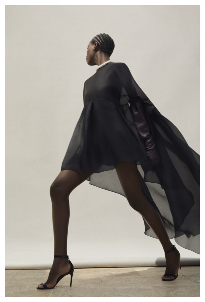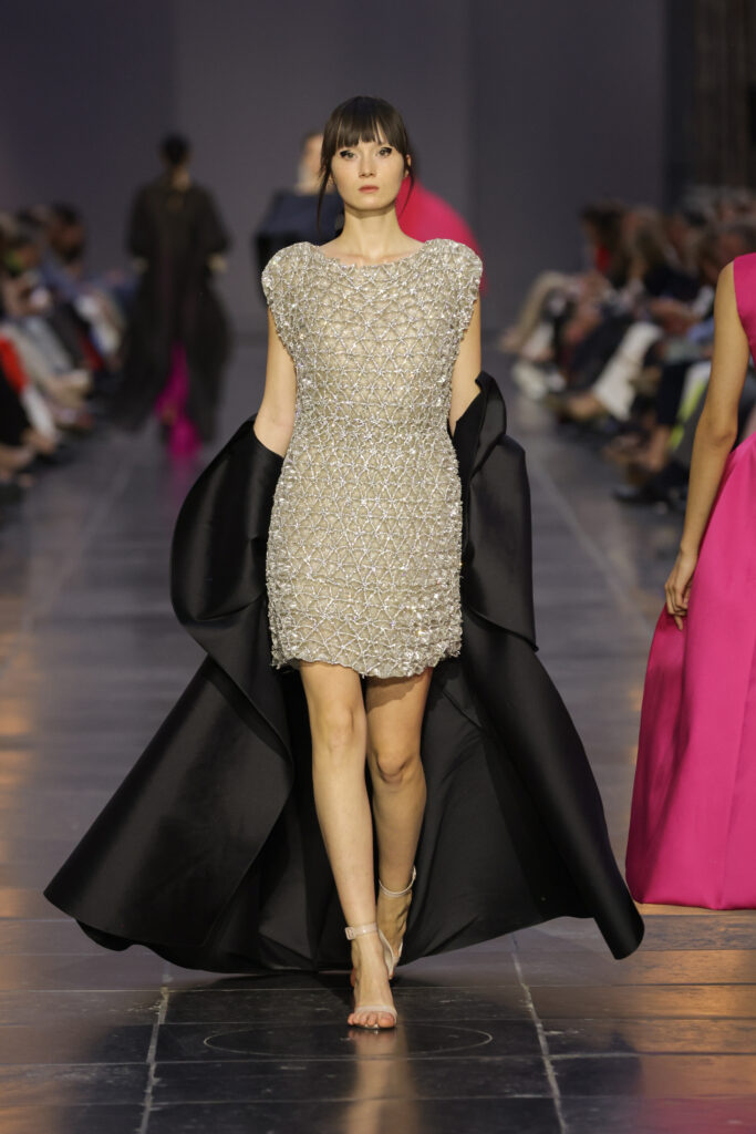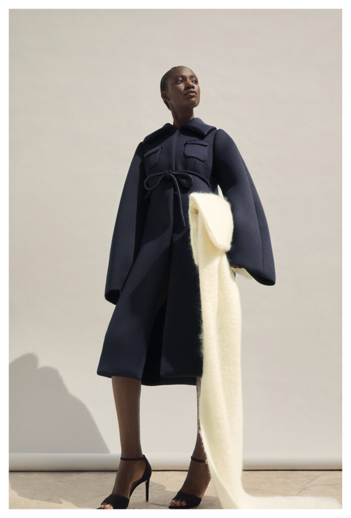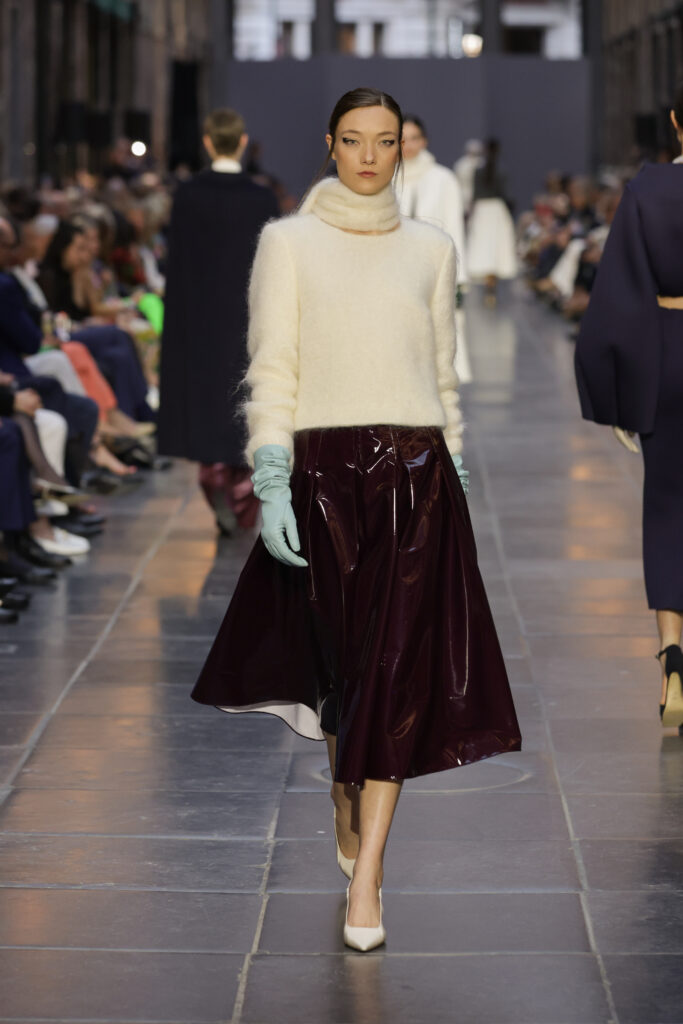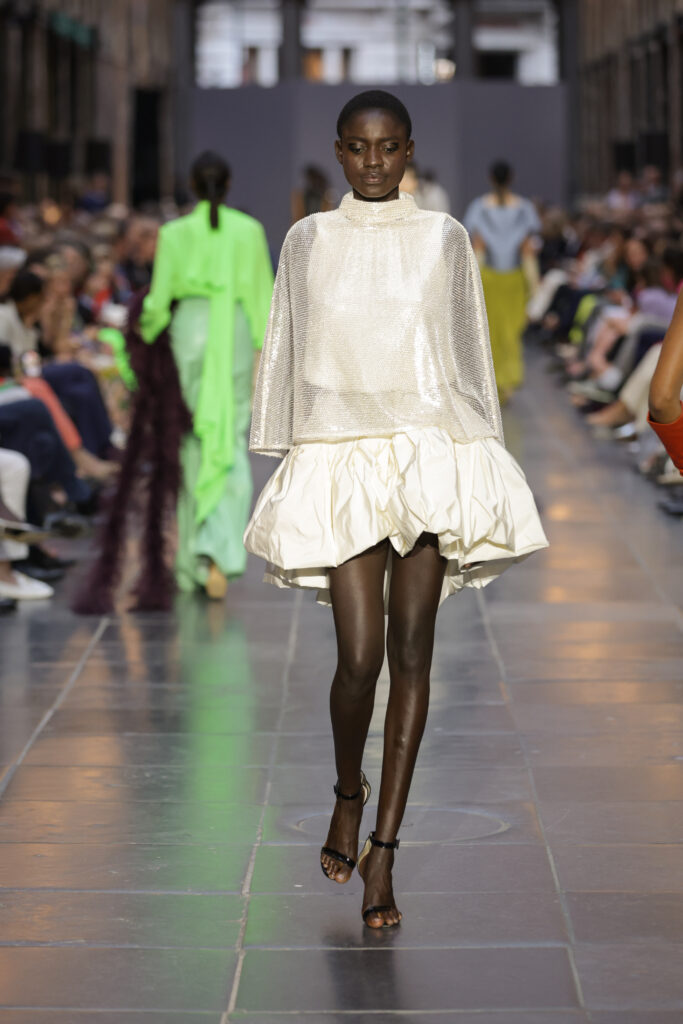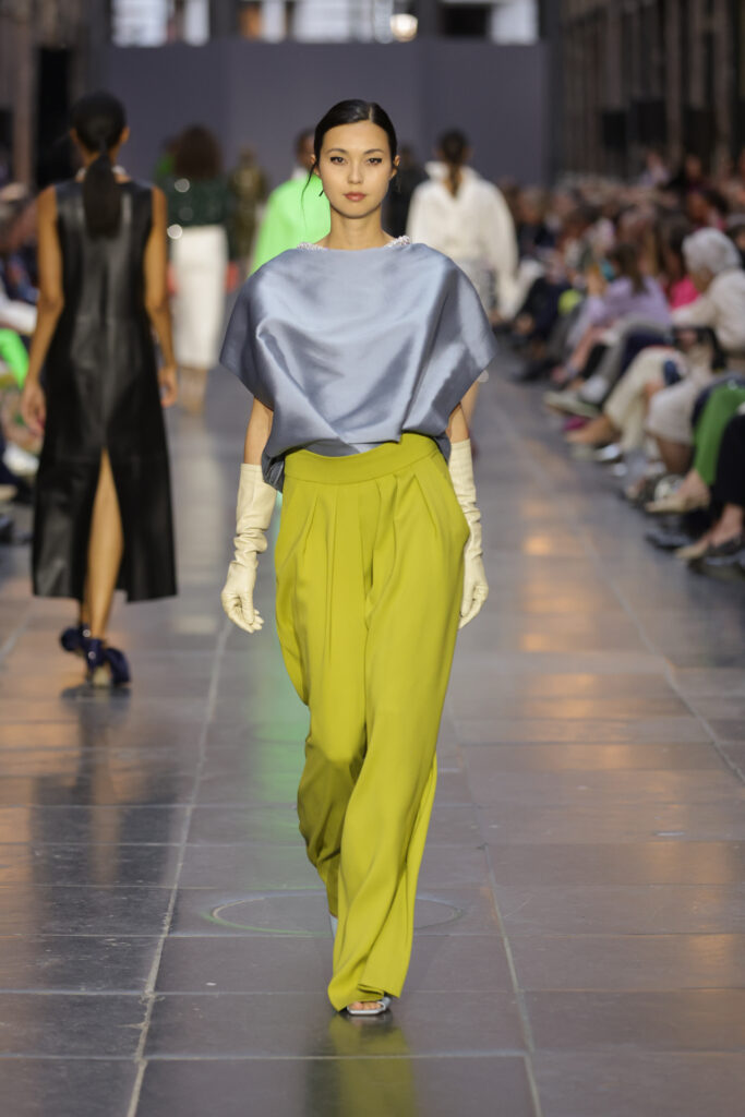Cette saison, Edouard Vermeulen met en avant des constructions travaillées, des tailles hautes à plis plats, et des pantalons en mousseline qui dansent autour des jambes. Les longueurs varient du sous-genou à des pièces courtes, harmonisées avec de grands manteaux élégants. Des capelines brodées de perles translucides, des jupes amples cintrées à la taille, et des robes capes en organza noir créent une présence cinématographique.