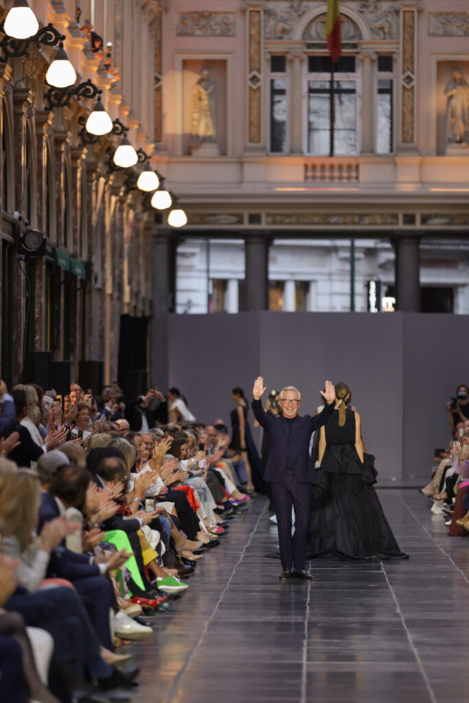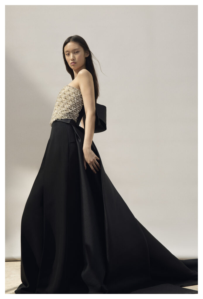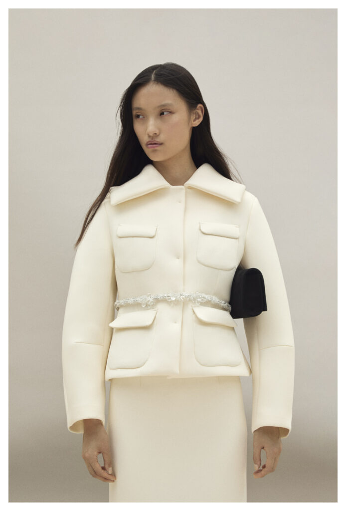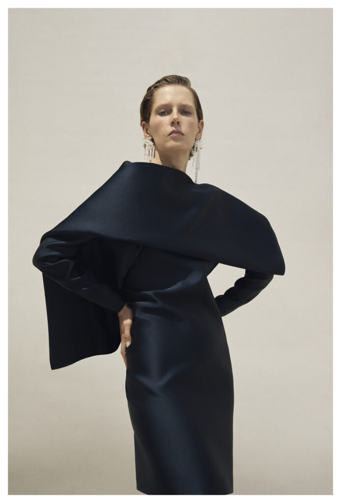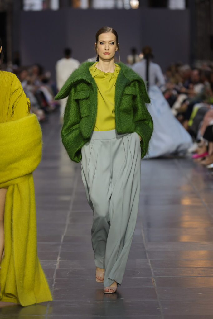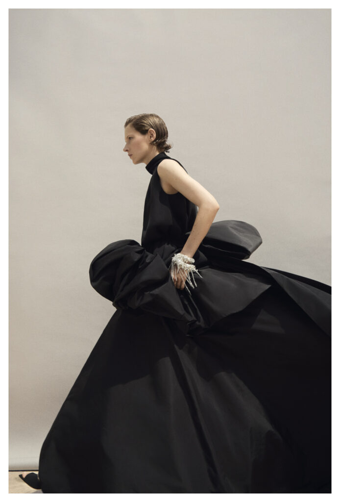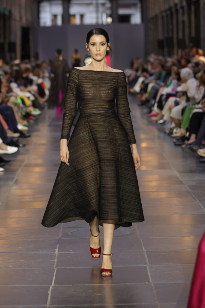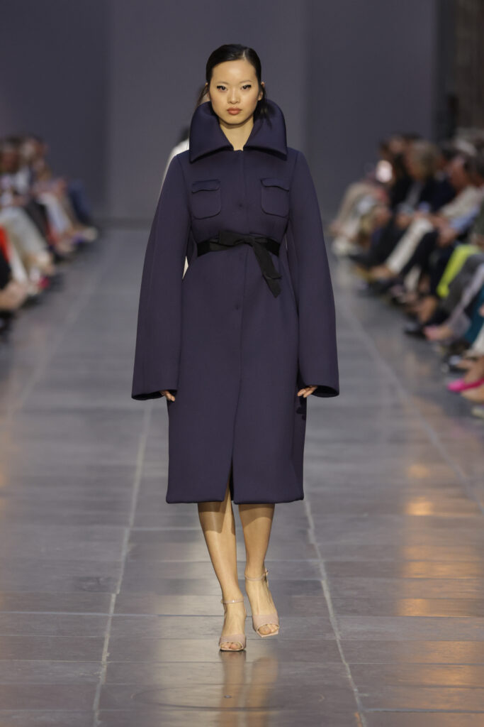 Cette saison, Edouard Vermeulen met en avant des constructions travaillées, des tailles hautes à plis plats, et des pantalons en mousseline qui dansent autour des jambes. Les longueurs varient du sous-genou à des pièces courtes, harmonisées avec de grands manteaux élégants. Des capelines brodées de perles translucides, des jupes amples cintrées à la taille, et des robes capes en organza noir créent une présence cinématographique.