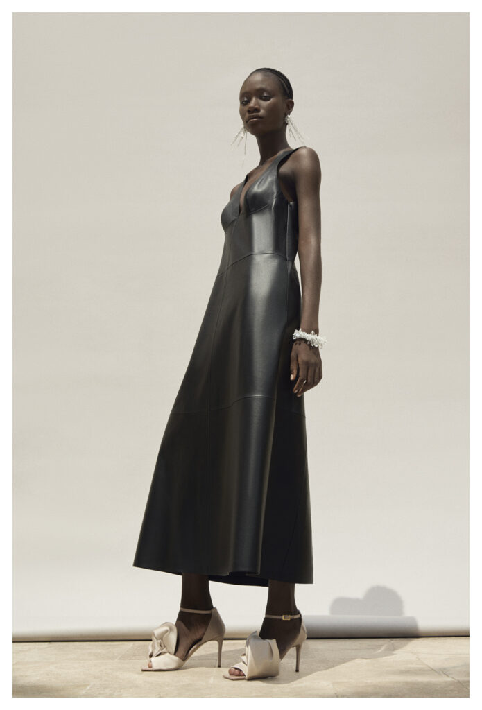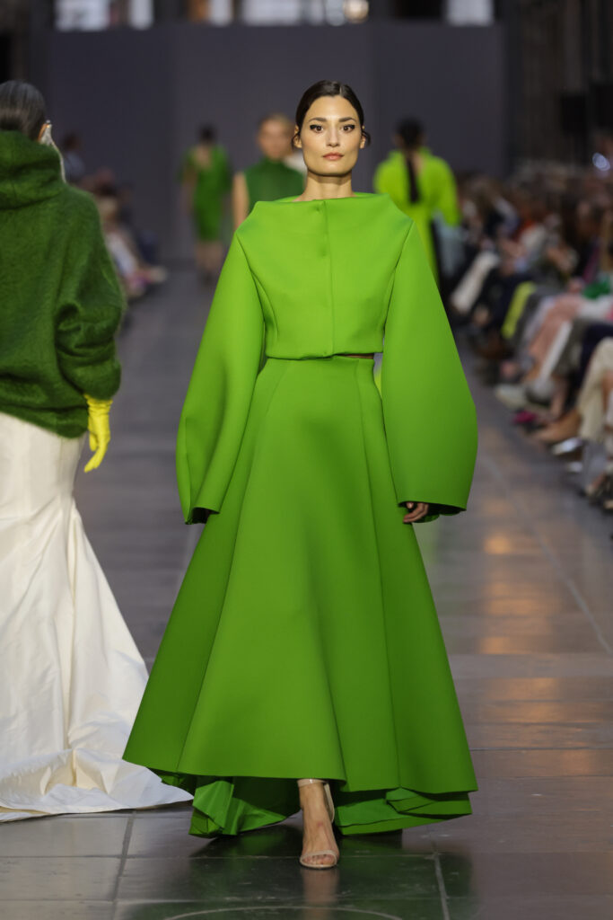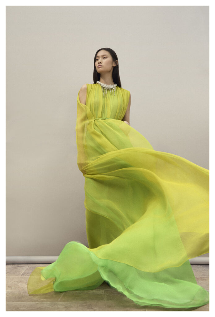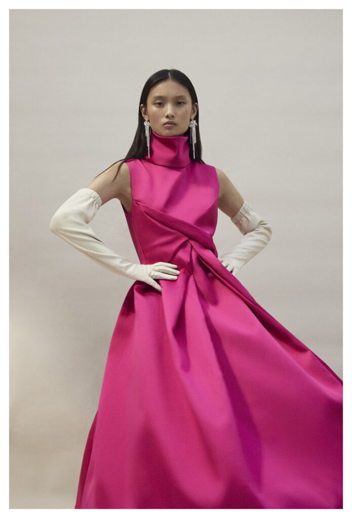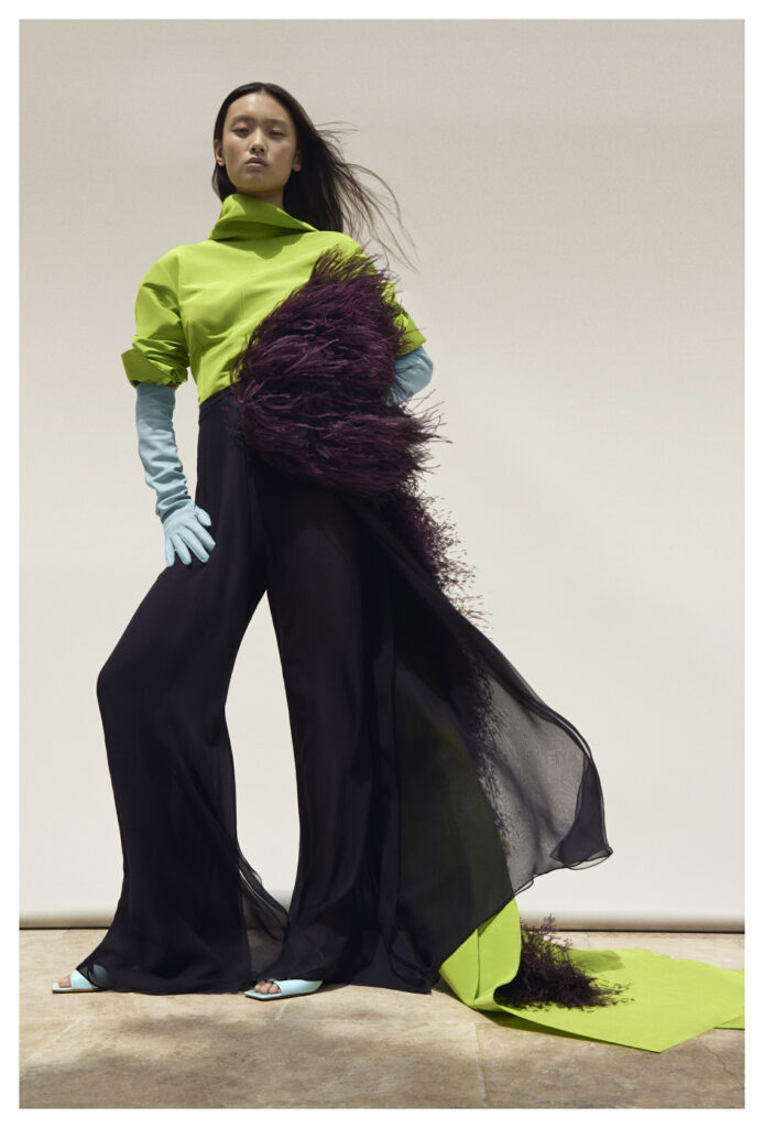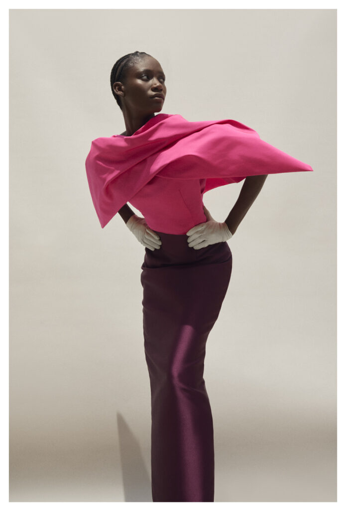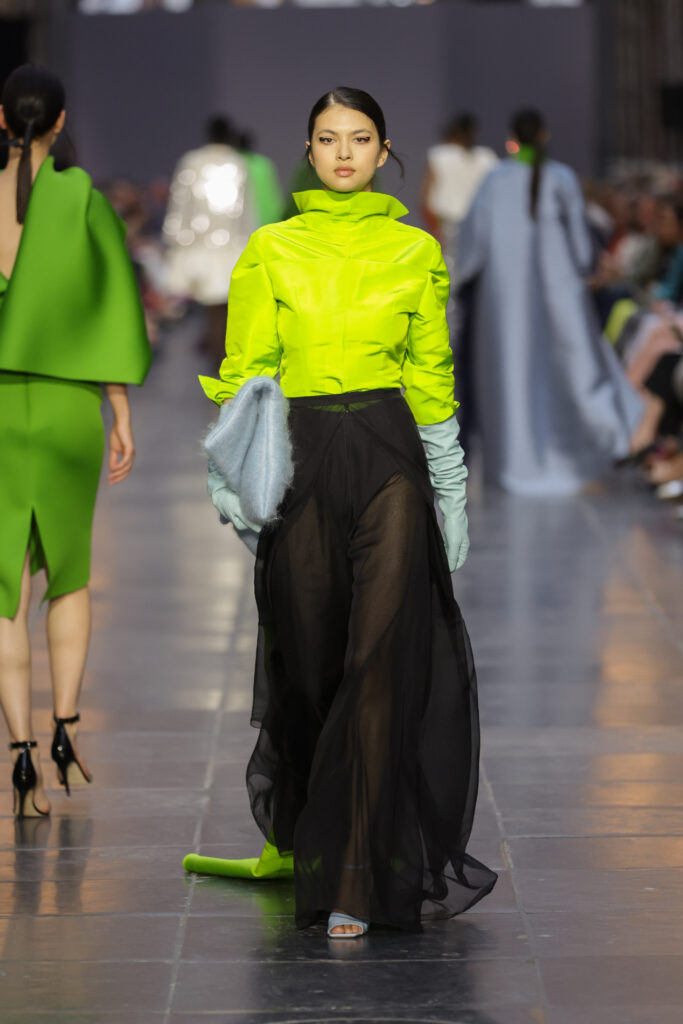 La collection joue avec des textures laquées et des tons acidulés, tels que le pomme néon, la violette noire, la cerise mûre et le rose fuchsia, mélangés à du noir ou du bleu marine. Les tissus s’animent différemment en fonction de la coupe et du drapage, chaque pièce dialoguant avec le corps pour offrir une nouvelle expérience de la couture.