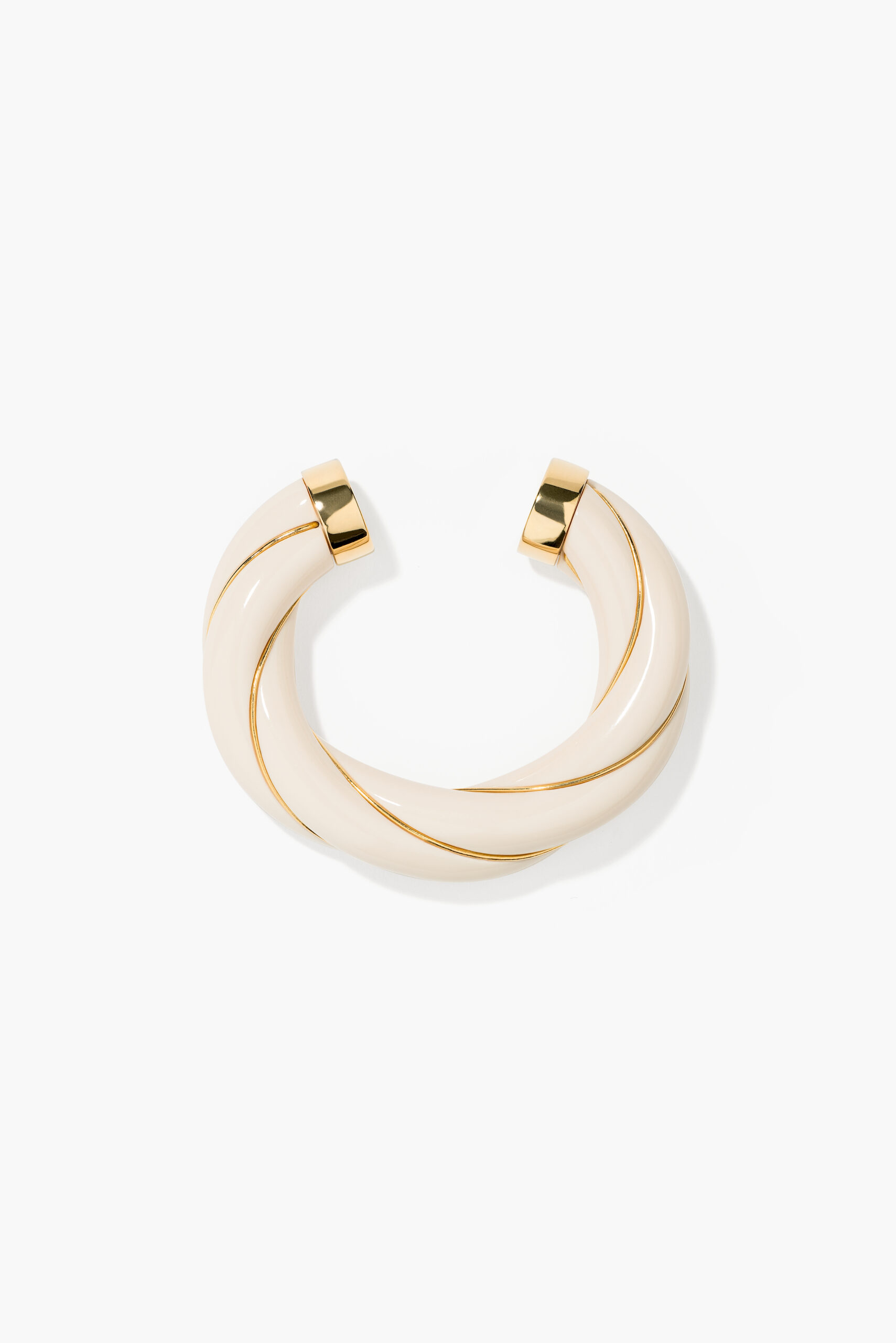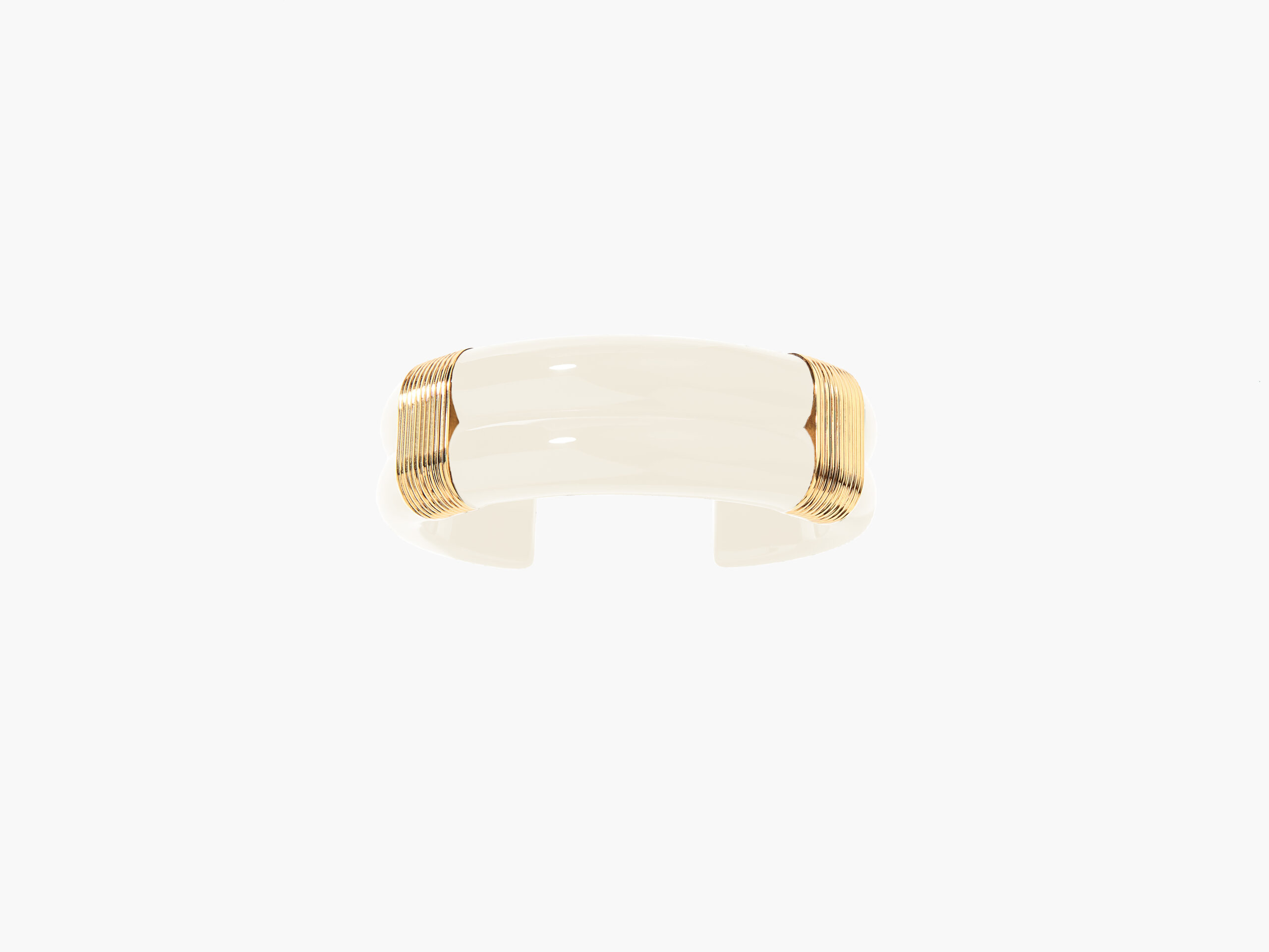 Dans un esprit de courbes douces et réconfortantes, la collection KATT marie la délicatesse de la résine blanche avec des détails dorés, offrant une élégance subtile aux mariées. Les manchettes et bracelets de cette série peuvent être portés seuls ou accumulés pour un effet plus dramatique.