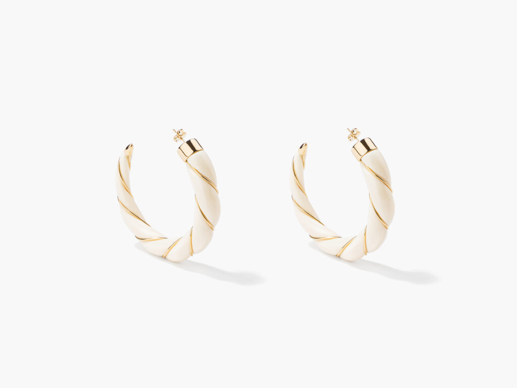 Le must-have de toute noce, la collection DIANA, offre des pièces en bakélite torsadée couleur ivoire, évoquant une torsade au maxi format sous des robes de mariage. Le bracelet et les boucles d’oreilles DIANA arborent une rondeur glamour, idéales pour les mariées qui préfèrent un style sophistiqué mais audacieux.