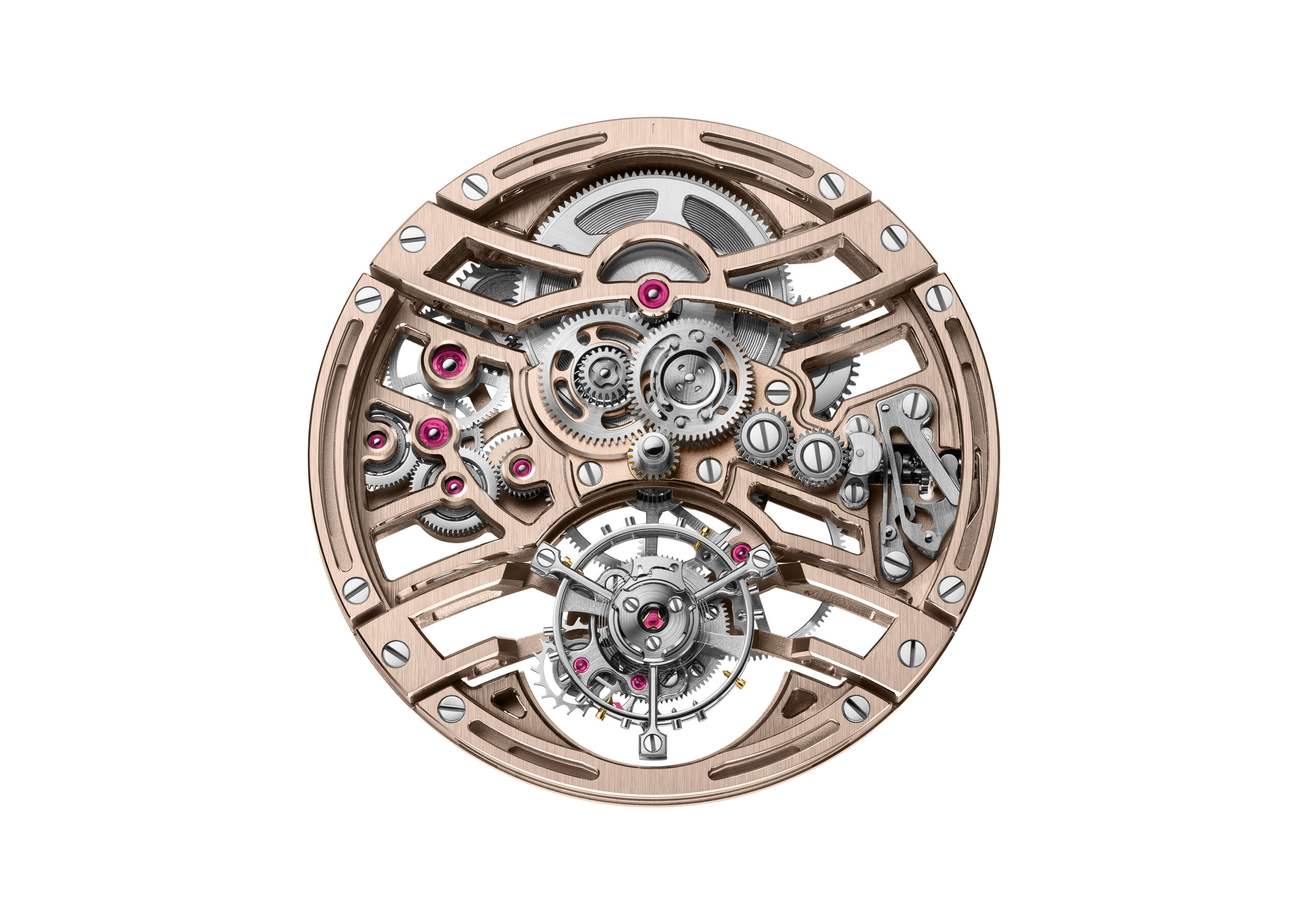 Le cœur de cette montre, le Calibre 2972, est une prouesse technique avec son architecture tridimensionnelle et son tourbillon volant. Ce mécanisme, visible des deux côtés grâce à un squelettage méticuleux, permet de révéler la beauté complexe de la montre, tout en maintenant une symétrie parfaite et une esthétique fonctionnelle. Les finitions manuelles des ponts et de la platine, incluant le brossage vertical et horizontal, enrichissent l’interaction avec la lumière, amplifiant ainsi l’éclat du sand gold.